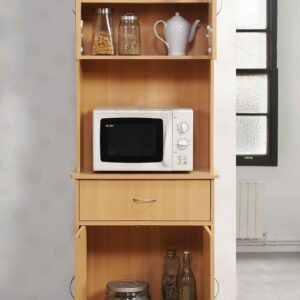 Running out of cabinet space in your home, the Hodedah China Cabinet is a simple piece that is sure to add functionally to your kitchen or dining room. The large open storage space at the center is used to store your microwave. The two shelves on the top serves as a place to keep your mug, jars or bowls. For extra storage and space there is another cabinet below to store small appliances, pots and pans. This Kitchen China Cabinet also features a drawer to store kitchen utensils and much more. The metal glides of these drawers ensure smooth gliding. This China Cabinet is available in multiple wooden finishes and you can choose the one that blends with your existing interiors.