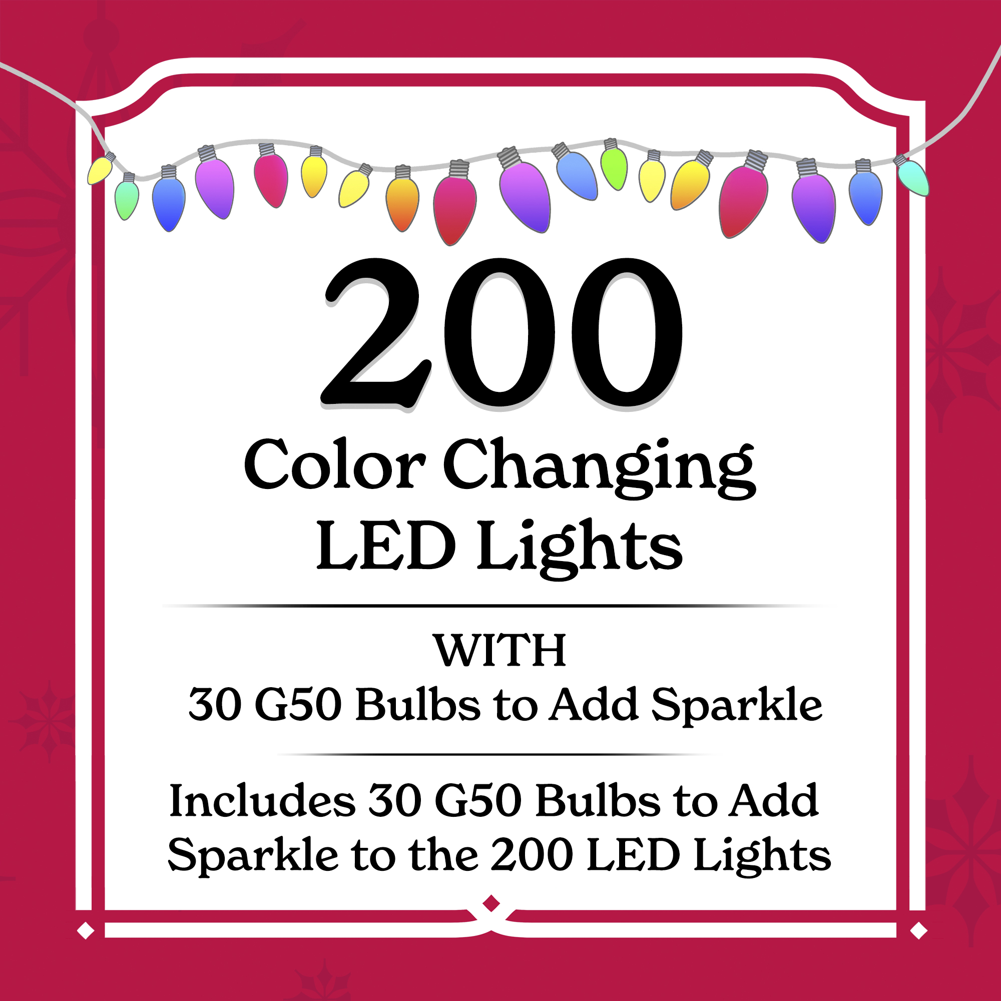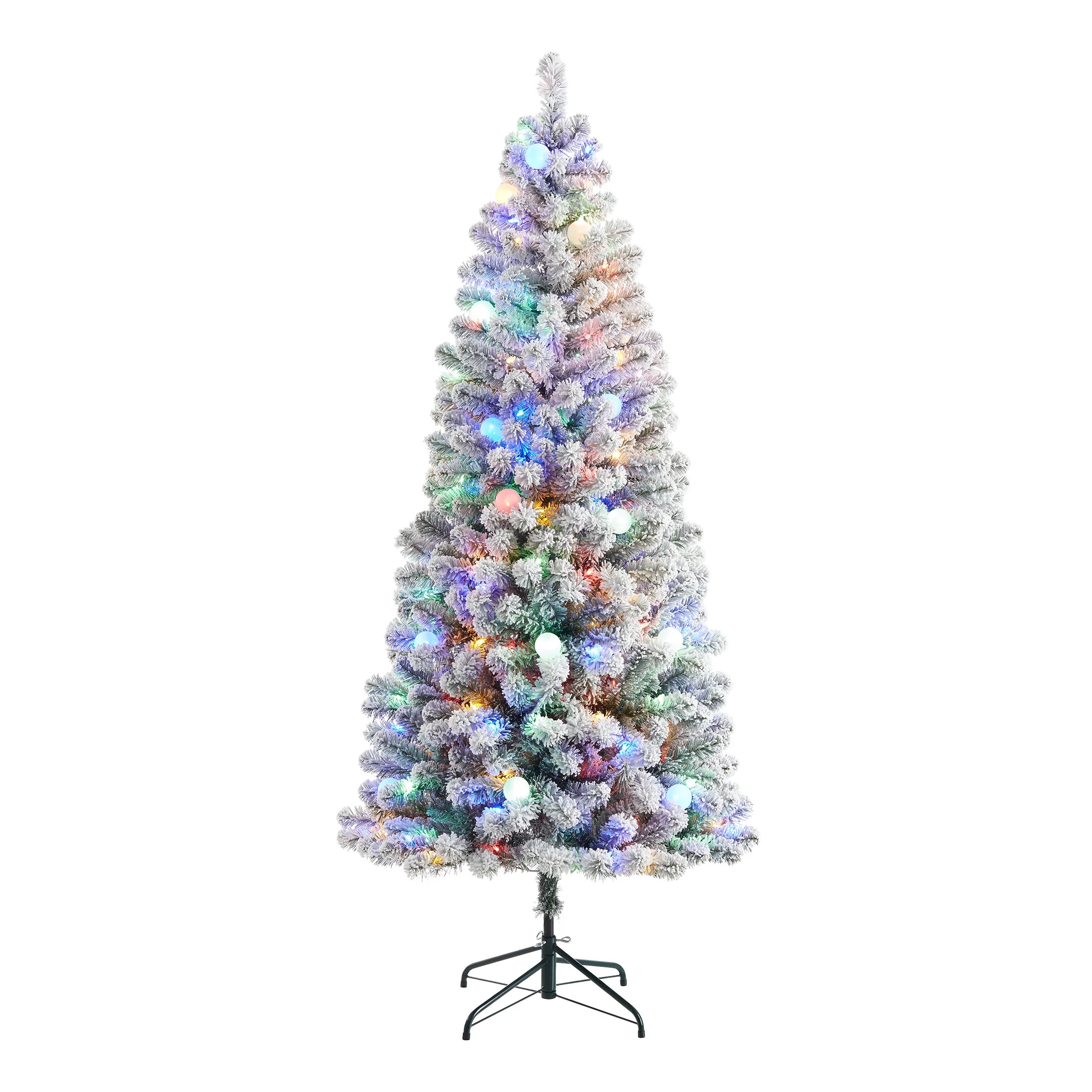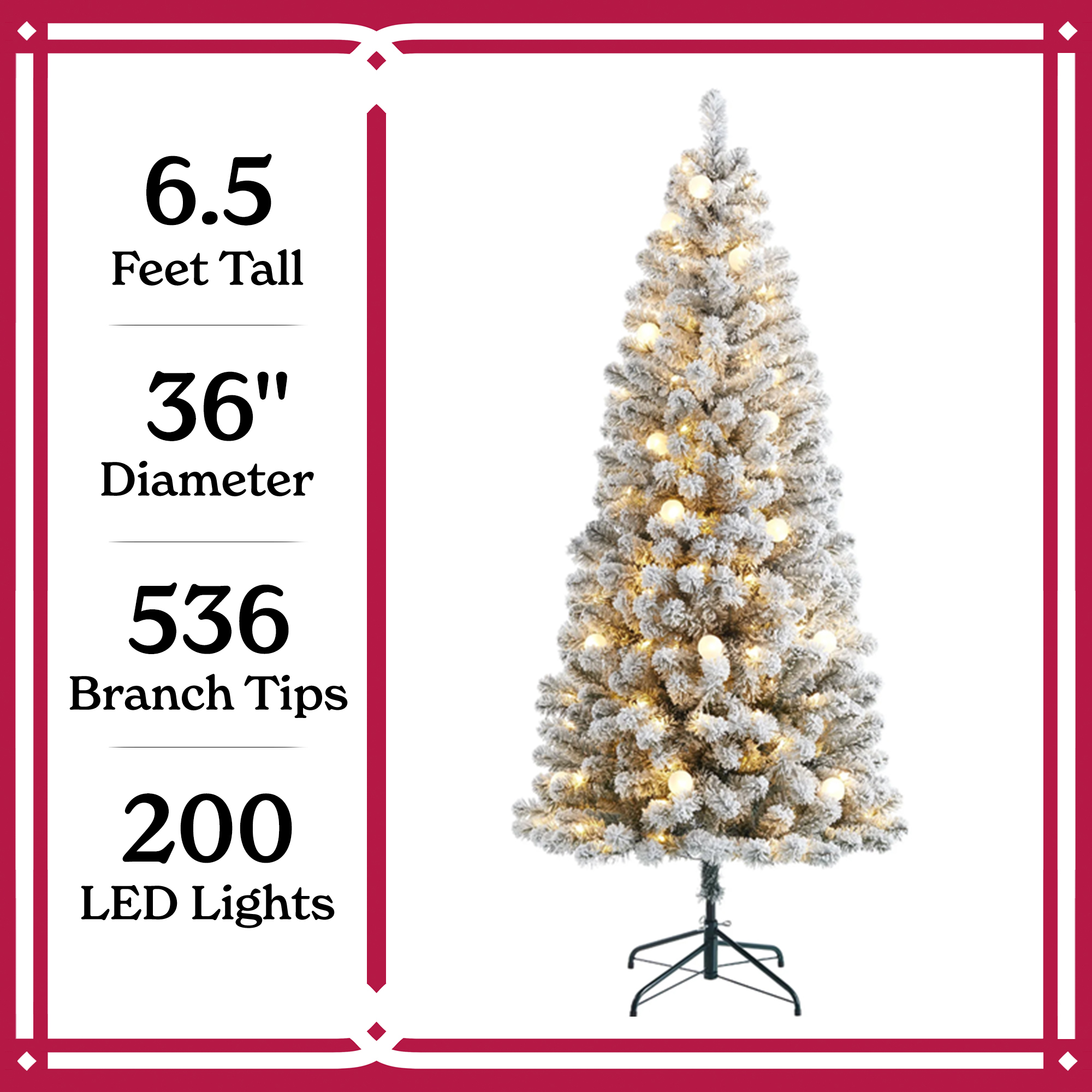 This Christmas, create a winter wonderland in your living room, den, or foyer with the snow-dusted look of the Holiday Time 6.5ft Pre-Lit G50 Color-Changing LED Trinity Flocked Pine Artificial Christmas Tree, Green. Featuring pre-attached, hinged branches with 536 green tips coated in white flocking, this natural-looking tree provides the perfect wintry backdrop for all your sentimental ornaments and decorations. It stands 6.5 feet tall and 36 inches in diameter, with an extra-strong top branch for your favorite tree topper. This colorful tree includes 30 G50 bulbs to add sparkle to the 200 LED lights with 9 color-changing functions, all pre-strung to help prevent tangling, along with a metal stand for stability. Included instructions make assembly easy, and no maintenance is required. The magical beauty of this Holiday Time Christmas tree will inspire joy in your home or office for many holiday seasons to come.