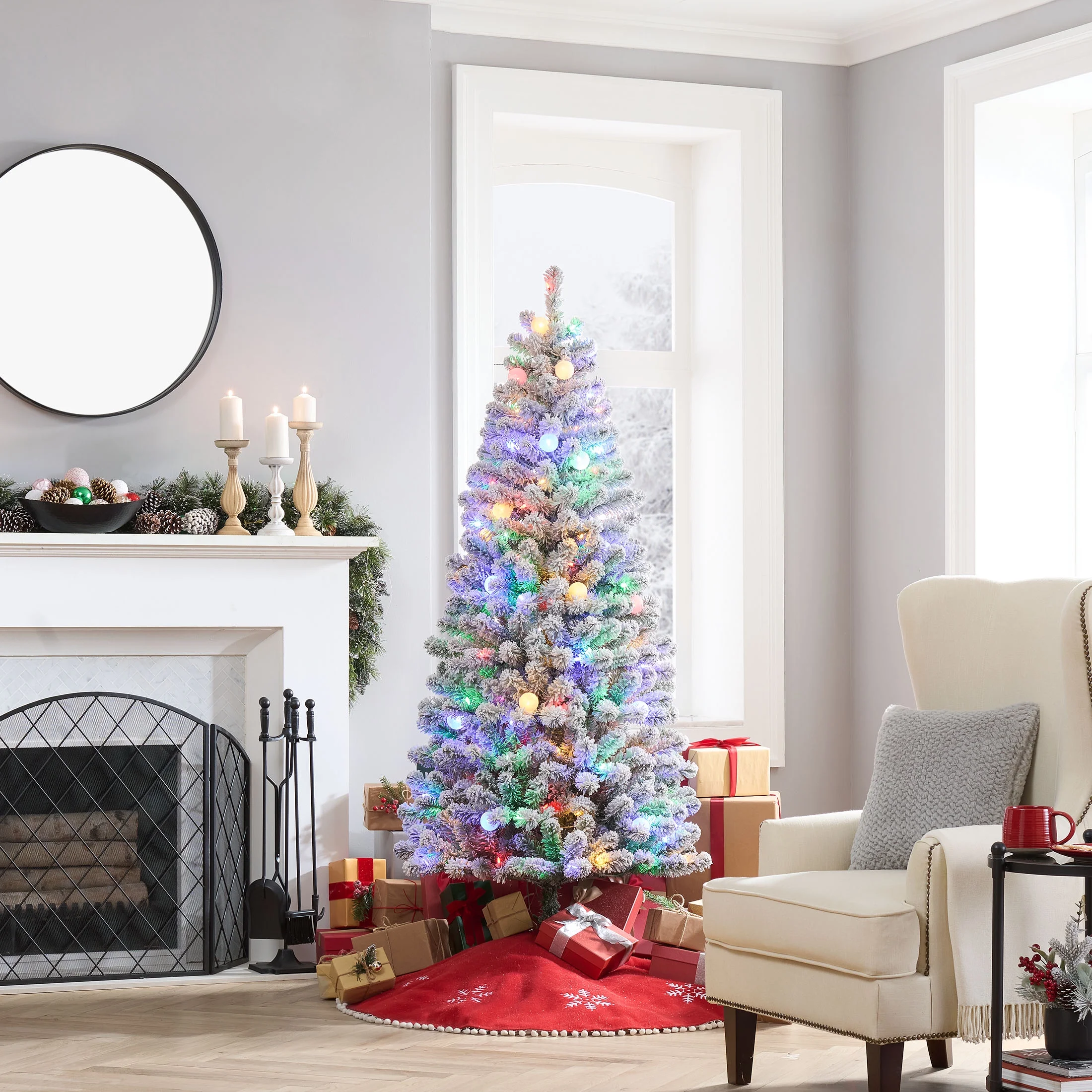 Holiday Time 6.5ft Pre-Lit Trinity Flocked Pine Artificial Christmas Tree, 200 LED, Multicolor, 6.5′