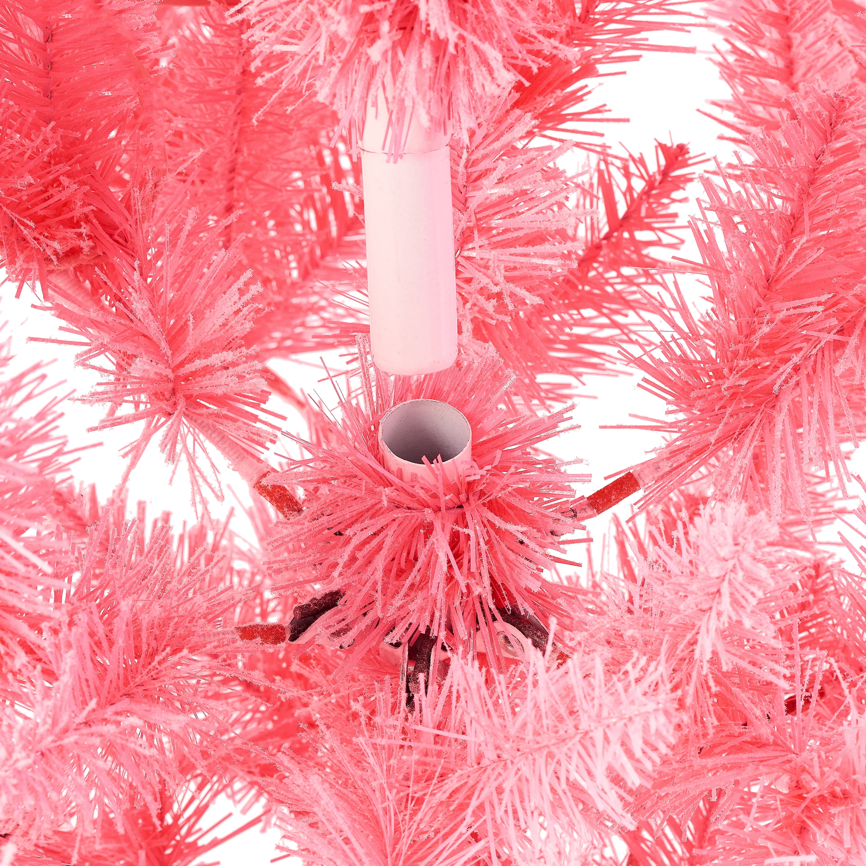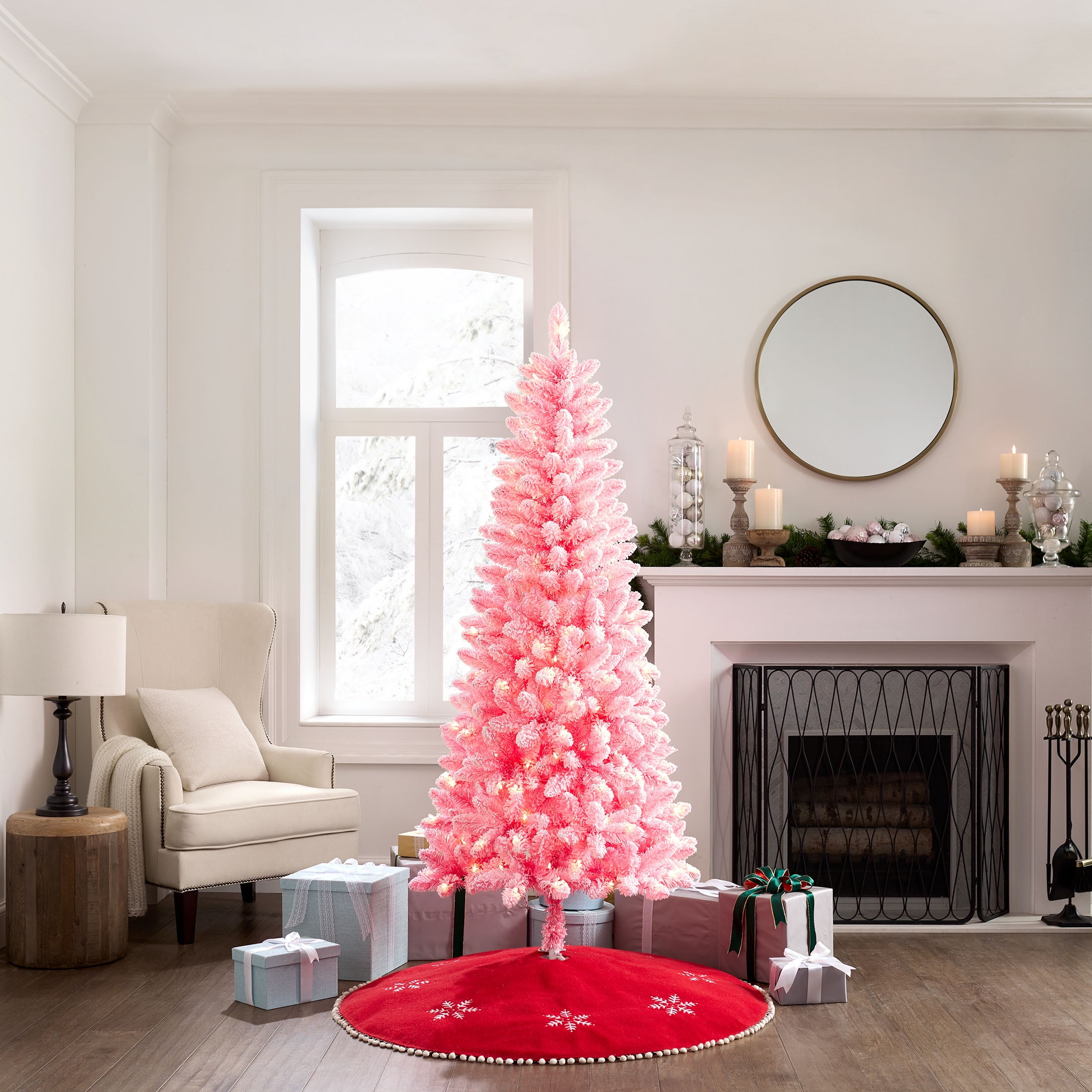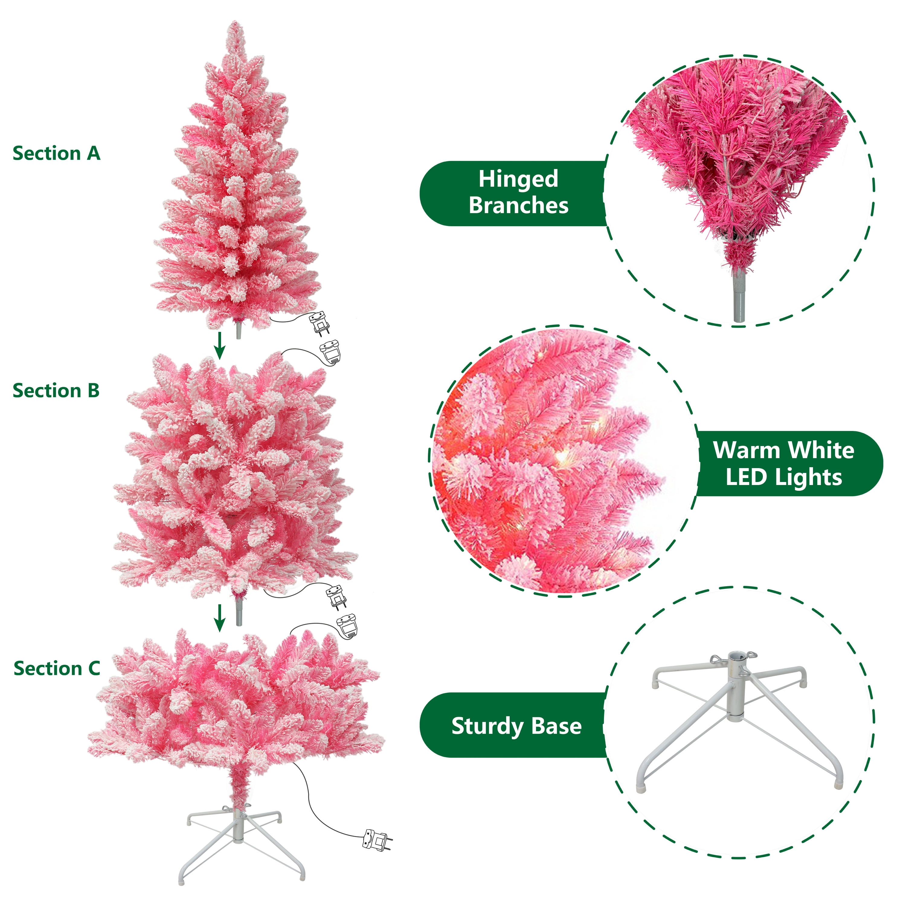 Make this holiday season all your own with the Holiday Time 6.5-Foot Pre-Lit Pink Flocked Pine Artificial Christmas Tree. Designed with white-flocked pink branches, this Christmas tree has 475 branch tips and 200 pre-strung warm white LED lights. This delightful holiday tree brings out the Christmas cheer and comes with a white metal tree stand to provide a reliable support base. Perfect for decorating or simply using on its own, the tree stands 6.5′ tall and 2.75 feet in diameter allowing it to be placed in medium and larger rooms for a stunning look. With an extra sturdy top branch for your favorite star, angel, or other tree topper, the Holiday Time 6.5-Foot Pre-Lit Pink Flocked Pine Artificial Christmas Tree is a wonderful Christmas decoration to be used year after year. Assembles easily with the included instructions.