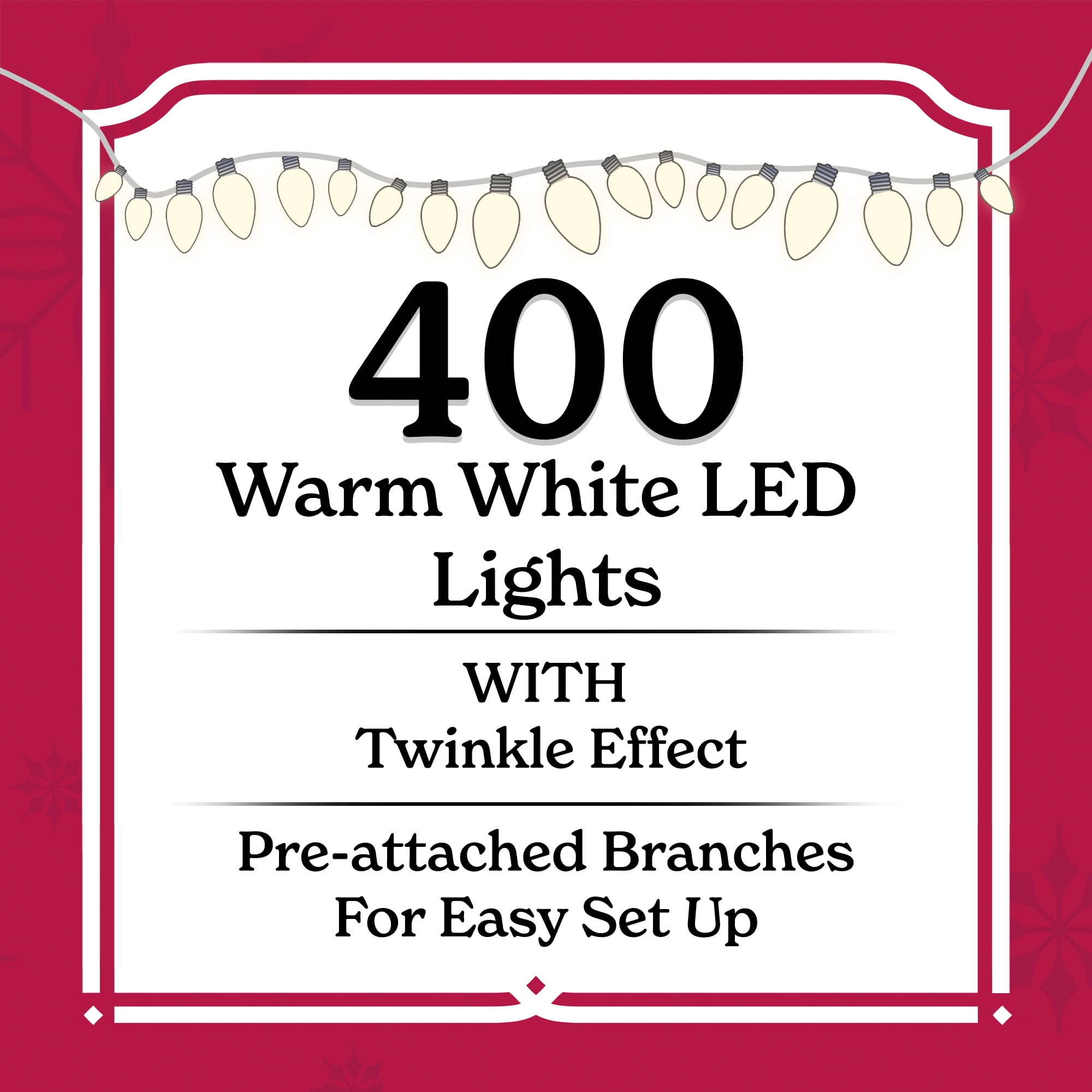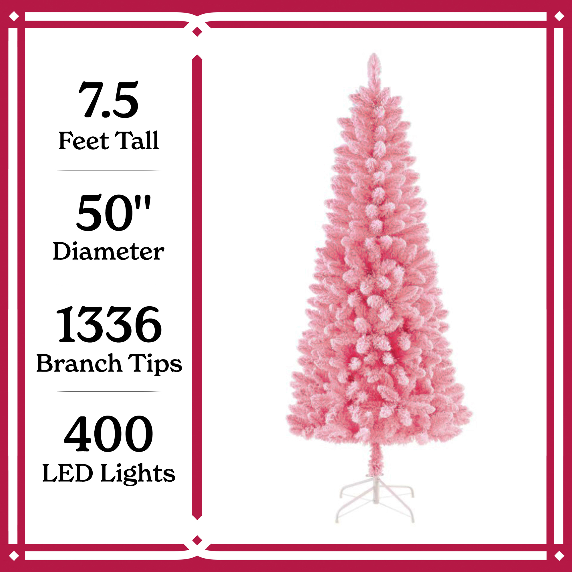 Holiday Time Pre-Lit Pink Flocked Pine Artificial Christmas Tree 475 branch tips 200 pre-strung warm white LED lights Comes with a white metal tree stand Designed with white-flocked pink branches 6.5′ height makes it perfect as the centerpiece of your holiday decorating in medium and large rooms Pre-attached hinged branches make set up easy Color: pink with flocking Assembled product weighs 10.3 lbs. Assembled product dimensions: 33″ D x 6.5′ H Available for a limited time exclusively at and Extra sturdy top branch provides a reliable support base for your favorite tree topper Easily assembled with the included instruction For indoor use only Materials: 75% PVC, 15% iron wire, 5% copper, 5% glass Package dimensions: 11.75″ x 11″ x 38″ Package weight:14 lbs.