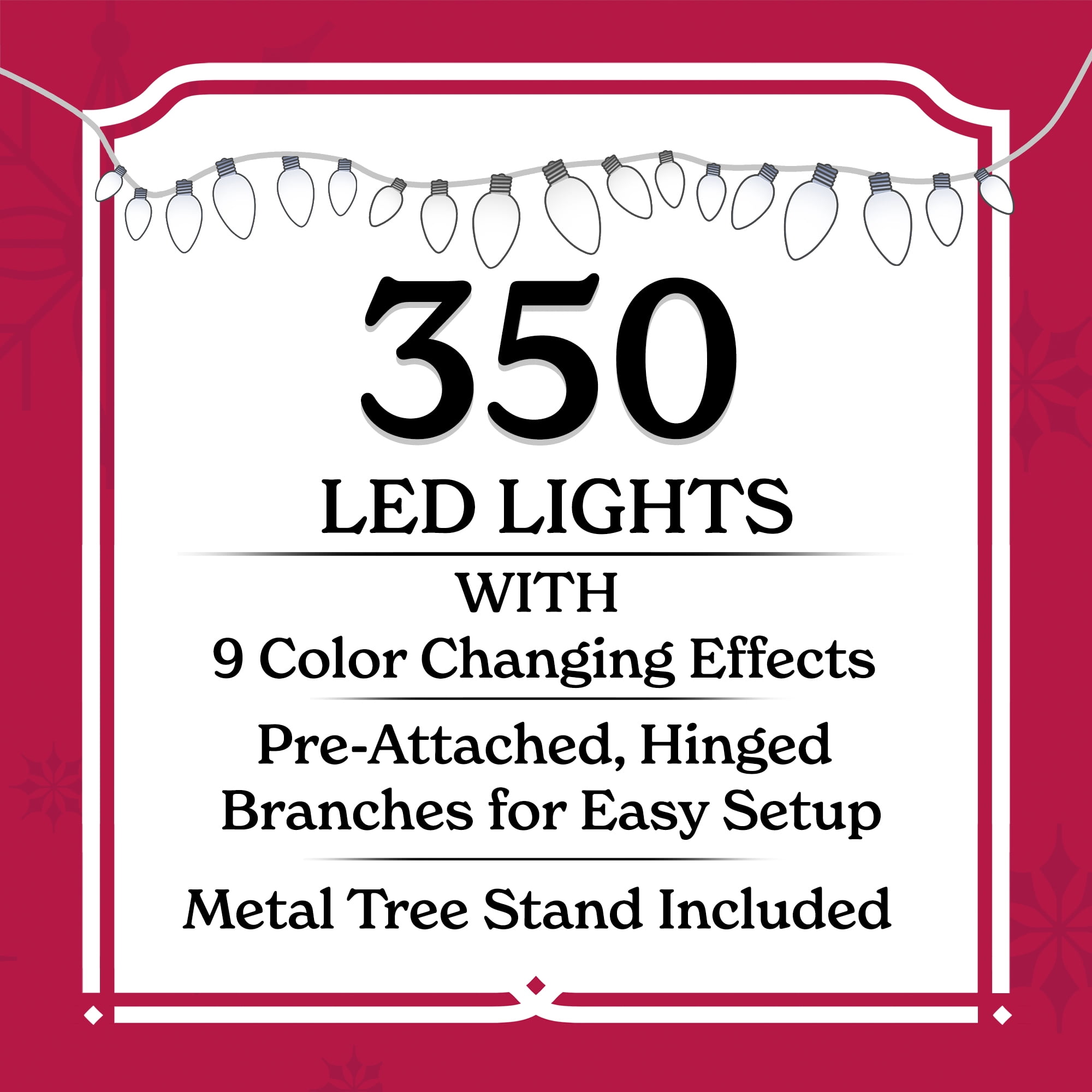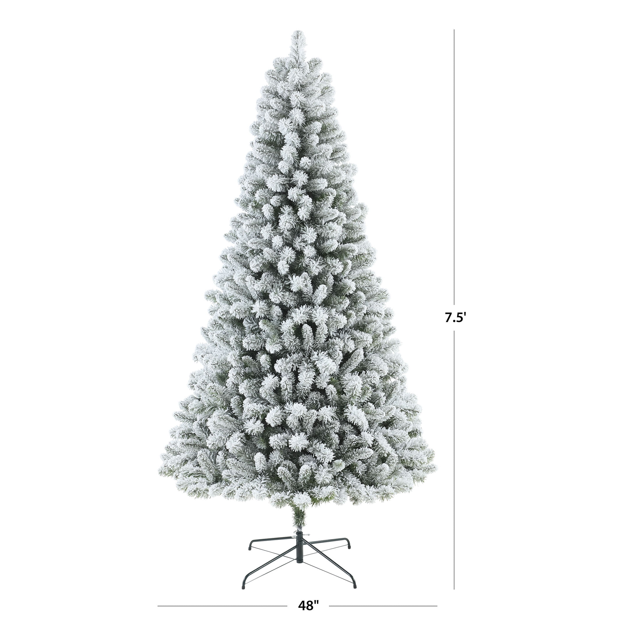 Holiday Time 7.5-Foot Pre-Lit Flocked Frisco Pine Artificial Christmas Tree 1108 branch tips 350 pre-strung color-changing LED lights Comes with a metal tree stand Designed with white-flocked green branches 7.5′ height makes it perfect as the centerpiece of your holiday decorating in medium and large rooms Pre-attached hinged branches make set up easy Color: green with flocking Assembled product weighs 26.4 lbs. Assembled product dimensions: 48″ D x 7.5′ H Available for a limited time exclusively at Extra sturdy top branch provides a reliable support base for your favorite tree topper Easily assembled with the included instruction For indoor use only Materials: 65% PVC, 25% iron wire, 5% copper, 5% PS Package dimensions: 14.75″ x 14.75″ x 42″; Package weight: 31.9 lbs.