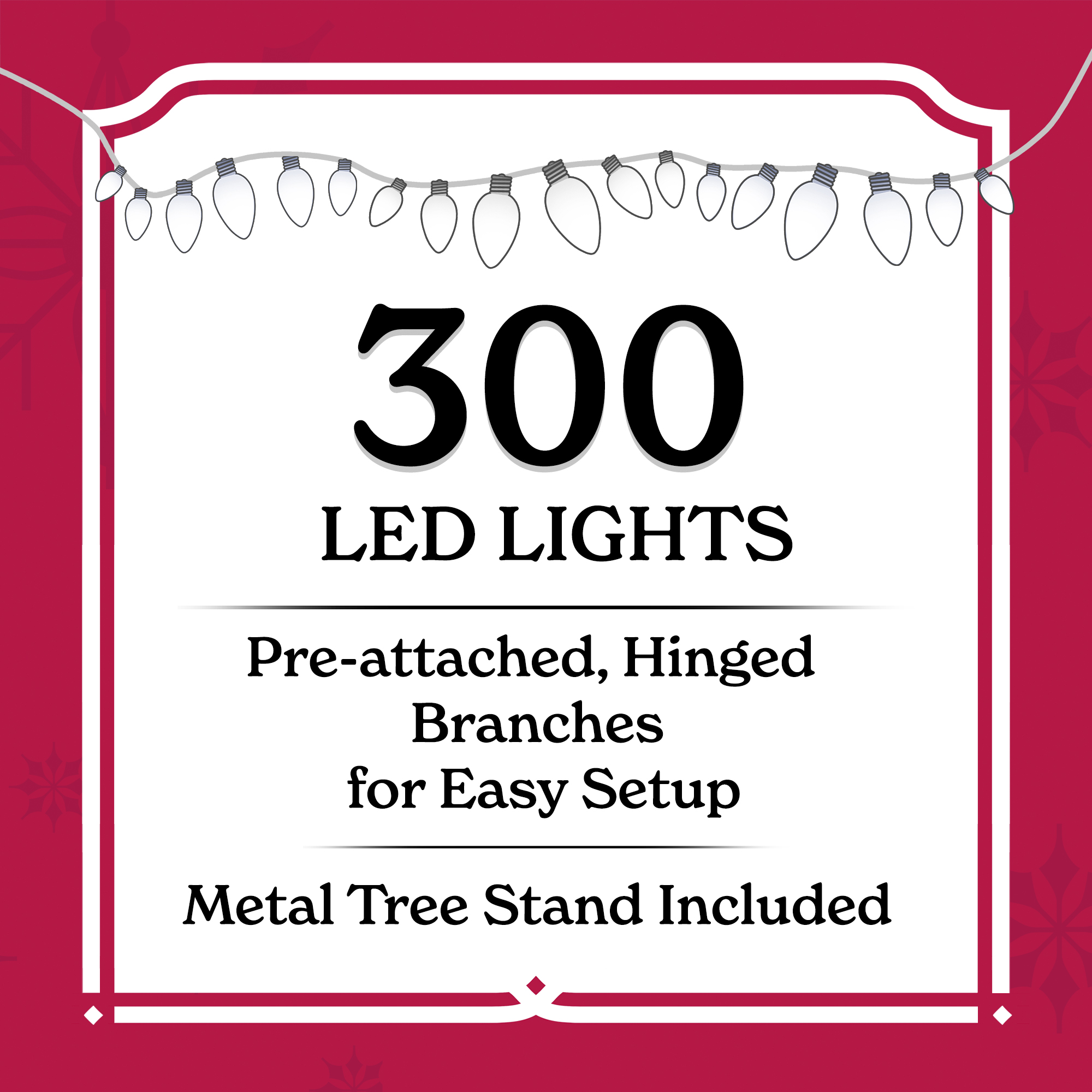 6.5 ft tree height 300 pre-strung warm white LED lights 909 branch tips 3.92 ft diameter All bulbs stay lit if one burns out Metal tree stand included Pre-attached hinged branches for easy setup 3 sections Indoor use only Flame retardant 2 year warranty UL Certified
