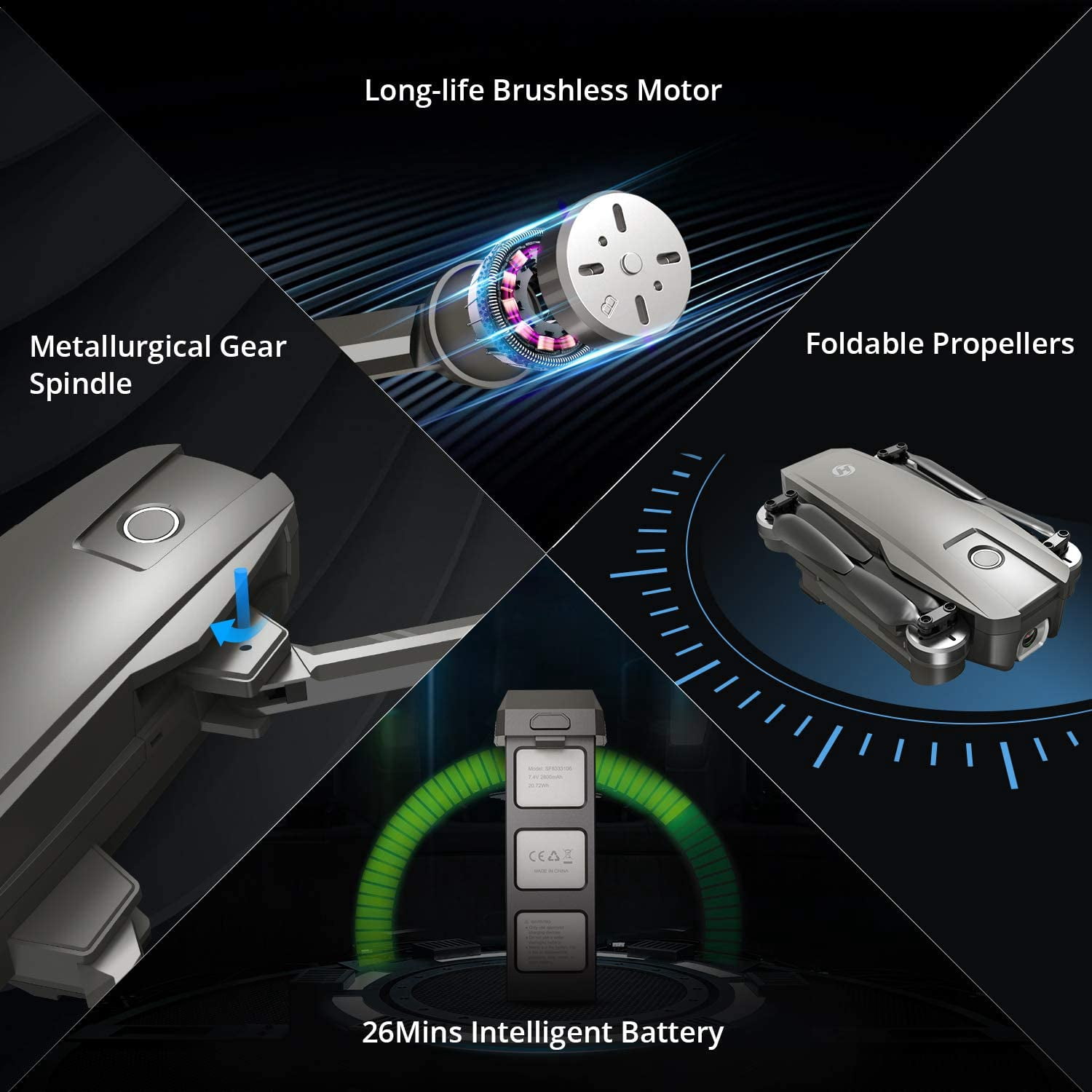 4K UHD Camera with Image Stabilization: The optimized full HD Camera built with Shock Absorption holder ensures shooting 3840 x 2160 high resolution images and videos without camera vibration. 5GHz FPV transmission and 90°adjustable lens enables you to see the word from different angle. GPS Assisted Intelligent Flight: Never lose the drone. It returns automatically whenever battery is low, signal is lost or you press one key return. Also, it is so smart to fly at your will, following you automatically, flying along a path you set, or fly around a point in circles. You may focus on your photography and creation. Configuration Upgrade: The intelligent battery works for 26 Mins for each charge; the long-life Brushless Motors have lower power consumption and give you a quieter flight; the foldable design and well-fitted carrying case make it easy to take the drone outdoor. PRODUCT SUPPORT AVAILABLE. Simple Operation: Equipped Multi Sensors guarantee hovering with great stability and high quality pics taken under different flying environment; Optical Flow Positioning makes great effect when GPS signal is lost or weak. Functions, like one key start/stop, emergency stop, altitude hold and electric fence, keep it simple to control for even beginners. Considerate Controller: The control range of 2.4GHz transmitter reaches to 3000 feet high range; battery level and GPS signal shown on the LED screen; a button to turn on or off the drone light is added; right hand throttle mode is available for left-hander. Remember to remove the scratch-proof film from the controller and the camera before use. Features: 4K UHD Camera with Image Stabilization: The optimized full HD Camera built with Shock Absorption holder ensures shooting 3840 x 2160 high resolution images and videos without camera vibration. 5GHz FPV transmission and 90°adjustable lens enables you to see the word from different angle. GPS Assisted Intelligent Flight: Never lose the drone. It returns automatically whenever battery is low, signal is lost or you press one key return. Also, it is so smart to fly at your will, following you automatically, flying along a path you set, or fly around a point in circles. You may focus on your photography and creation. Configuration Upgrade: The intelligent battery works for 26 Mins for each charge; the long-life Brushless Motors have lower power consumption and give you a quieter flight; the foldable design and well-fitted carrying case make it easy to take the drone outdoor. PRODUCT SUPPORT AVAILABLE. Simple Operation: Equipped Multi Sensors guarantee hovering with great stability and high quality pics taken under different flying environment; Optical Flow Positioning makes great effect when GPS signal is lost or weak. Functions, like one key start/stop, emergency stop, altitude hold and electric fence, keep it simple to control for even beginners. Considerate Controller: The control range of 2.4GHz transmitter reaches to 3000 feet high range; battery level and GPS signal shown on the LED screen; a button to turn on or off the drone light is added; right hand throttle mode is available for left-hander. Remember to remove the scratch-proof film from the controller and the camera before use. Specifications: Weight: 460 g / 16.2 oz Dimension: 173 x 104 x 56 mm (Folded); 336 x 370 x 56 mm (Unfolded) Flight Time: 26 minutes Charging Time: 5~7 hours FPV Distance: 984~1640 feet Flight Distance: 2624~3277 feet Camera Frequency: 5Ghz Camera Angle: 0° to – 90° Video/Photo Resolution: HD3840 × 2160P (stored in TF card); HD1920×1080P (stored on mobile phone) Max Expansion: 32GB TF Card (Not Included) In The Box: 1 x Drone and Transmitter 2 x Drone Batteries 4 x Extra Propellers 1 x USB Charging Cable 1 x Charger Hub 1 x Screwdriver 1 x Instructions for Use 1 x Carrying Bag