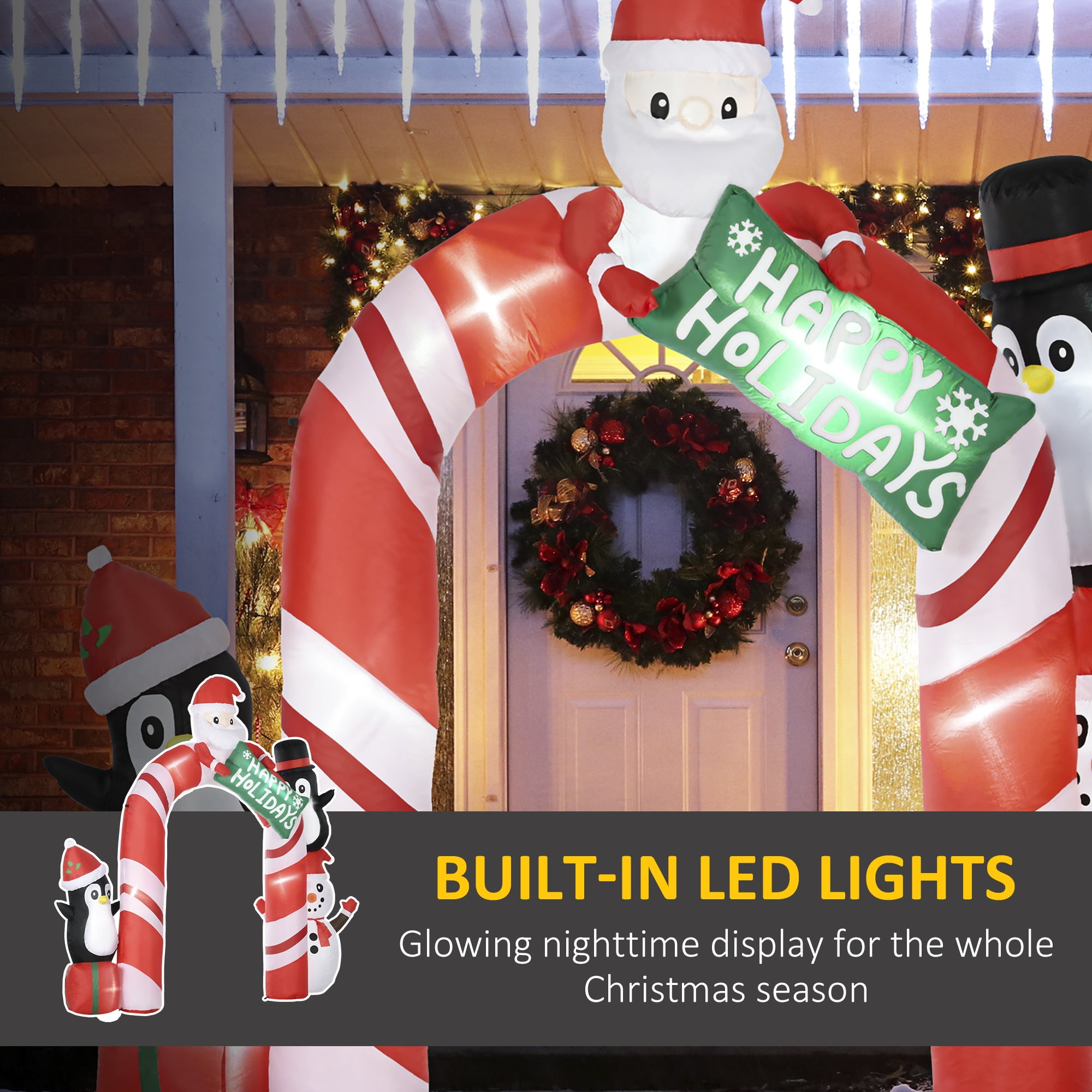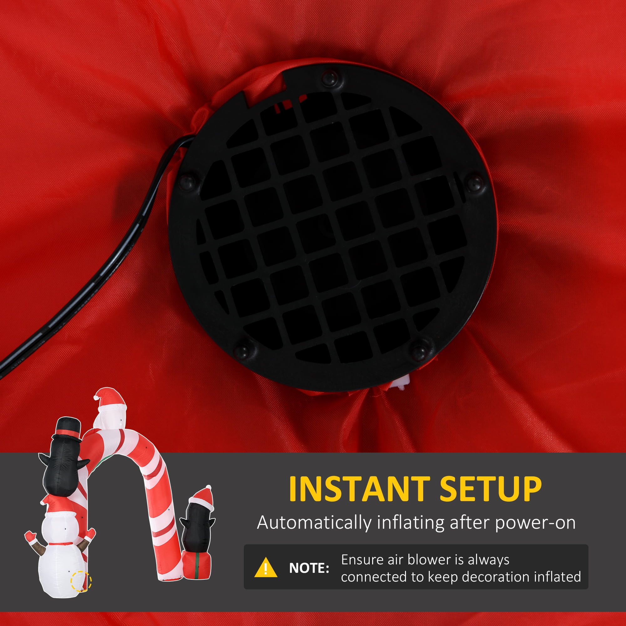 Show Your Festiveness: You and your neighbors are going to marvel at this archway with Santa Claus, two penguins and a snowman. This Christmas blow up decoration is going to bring your outdoor holiday cheer to new heights and provide days of glad tidings to you. Add Some (Even More) Light: Built-in white LED lights are going to ensure that your outdoor decoration is visible from here to the North Pole (okay, maybe not that far, but it’s still super-bright). These lights will illuminate every last jolly detail, taking your display to a new level of magical. Mild Wind Or Rain? No Problem: For those more temperamental Christmas, you’re still going to want to display your holiday spirit with the Christmas outdoor inflatables. Included seven stakes, three drawstrings, and four sandbags to keep your inflatable from turning into a parachute in the almost-likely event of a windy night. No-Hassle Set Up: To inflate: Step 1 – Plug it in and turn the power on. Step 2 – Done. For real, it’s that easy. Unplug it, it deflates. (It seriously takes you longer to put together your plate of milk and cookies.) Archway Christmas Decoration Info: Overall Dimensions: 126″ W x 31.5″ D x 120″ H. Specifications: Color: Multi-Colored Type: Inflatable archway with Santa Claus, two penguins and a snowman Material: Polyester Cloth Overall Dimension: 126″ W x 31.5″ D x 120″ H Overall Height: 10 ft Cord Length: 9.8 ft LED Light Count: 10 LED Light Power: 0.25 W Fan: 18 W Input Voltage: 100-240 V, 50/60 Hz Output Voltage: 12 V / 24 W / 2 A Item Label: 844-725V80RD NOTE: Ensure air blower is always connected to the power source to keep the product inflated, but not above eight hours a time for long motor service life Do not use the inflatable outside in heavy rain, snow, or wind