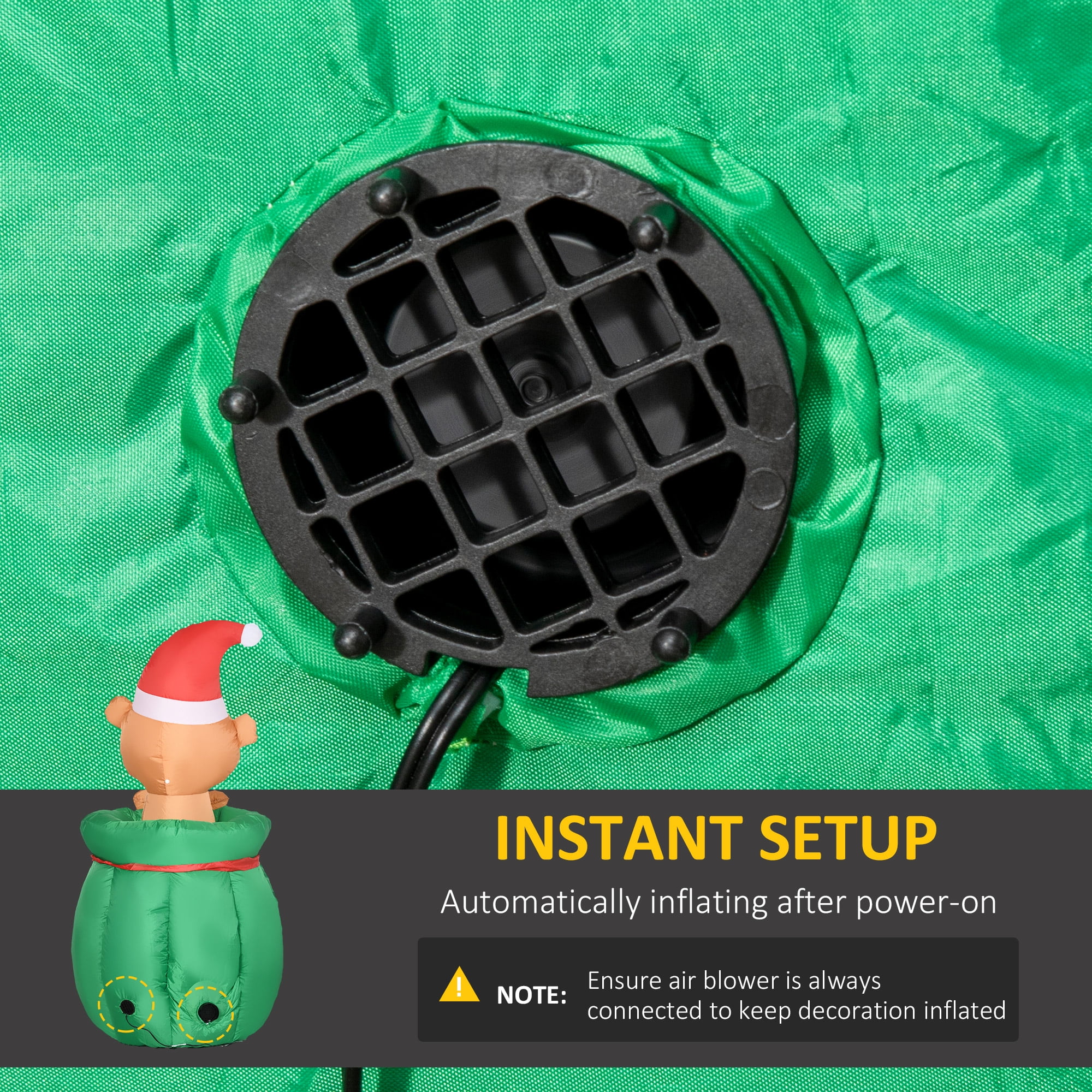 Show Your Festiveness: You and your neighbors are going to marvel at this bear in a Santa bag Christmas inflatable. This is going to bring your outdoor holiday cheer to new heights and provide days of glad tidings to you. Add Some (Even More) Light: Built-in LEDs are going to ensure that your inflatable is visible from here to the North Pole (okay, maybe not that far, but it’s still super-bright). These lights will illuminate every last jolly detail, taking your display to a new level of magical. Mild Rain or Snow? No Problem: For those more temperamental Christmases, you’re still going to want to display your holiday spirit. Included are four stakes, two drawstrings and four sandbags to keep your inflatable from turning into a parachute in the almost-likely event of a windy night. No-Hassle Set Up: To inflate: Step 1 – Plug it in and turn the power on. Step 2 – Done. For real, it’s that easy. Unplug it, the bear in Santa bag deflates. It seriously takes you longer to put together your plate of milk and cookies. Christmas Inflatable Information: Christmas Bear Dimensions: 27.5″ W x 27.5″ D x 53.25″ H. Includes four stakes, two drawstrings and four sandbags. Specifications: Primary Color: Brown, Red, Green Type: Inflatable Christmas bear inside Santa Claus bag Material: Polyester Cloth Overall Dimensions: 27.5″ W x 27.5″ D x 53.25″ H Power Cable Length: 117.6″ Input Voltage: 120 V / 60 Hz Output Voltage: DC 12 V / 2 A Certifications: IP44, UL / cUL Item Label: 844-322 NOTE: Ensure air blower is always connected to power source to keep the Christmas bear in Santa gift bag inflated NOTE: Do not use the inflatable outside in heavy rain, snow, or wind.