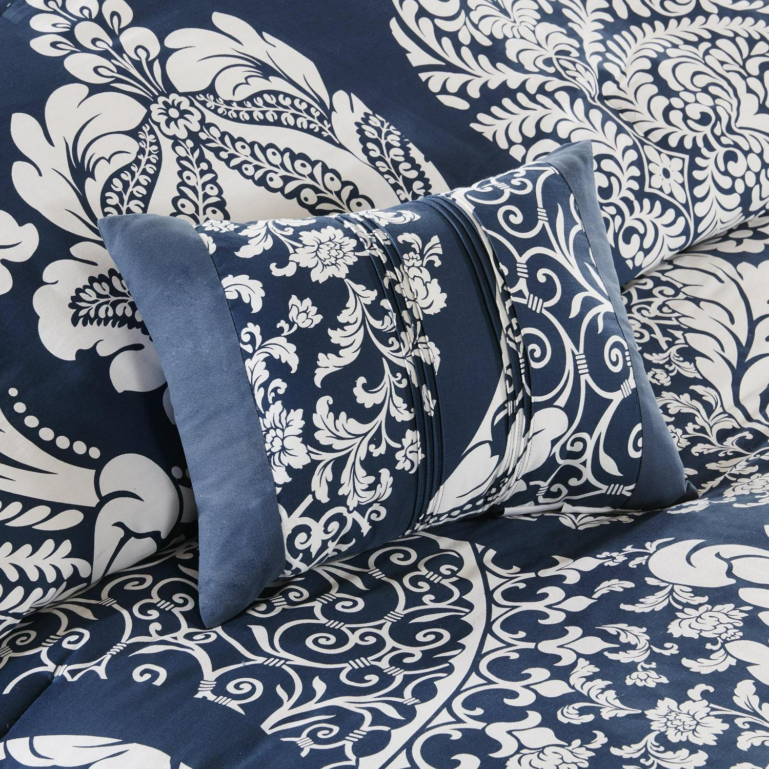 The Home Essence Adela 7 Piece Cotton Printed Comforter Set offers an eye-catching update to your bedroom décor. A beautifully intricate damask pattern is flaunted across the comforter and shams, for a chic transitional look. The solid reverse perfectly complements the top of the bed, while the flange border adds a charming accent to the comforter. Three decorative pillows with embroidered details and fabric manipulation and a solid bed skirt complete the comforter set. Made from 100% cotton sateen, this bedding set is OEKO-TEX certified, meaning it does not contain any harmful substances or chemicals to ensure quality comfort and wellness.