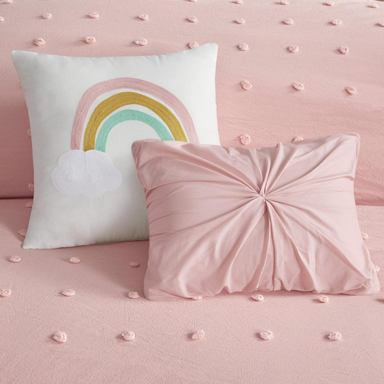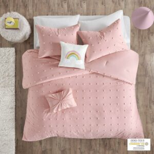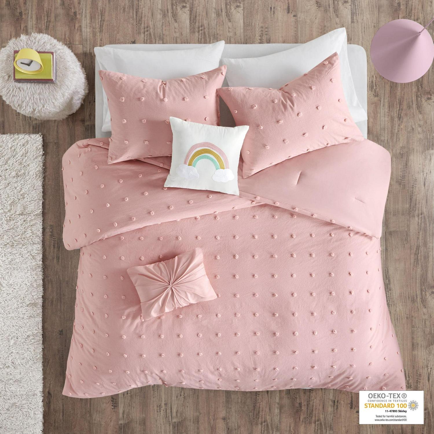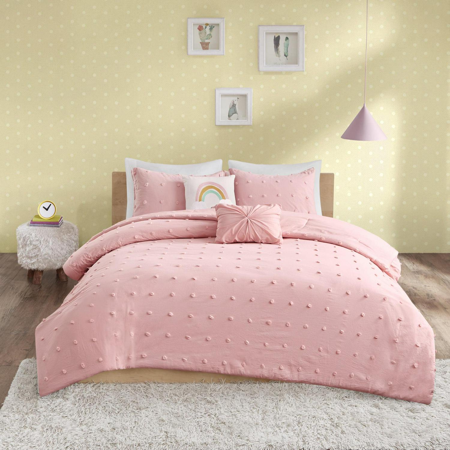 Create a cute and cozy look in your child s bedroom with the Home Essence Kids Kelsey Cotton Jacquard Pom Pom Comforter Set. This cotton comforter features an all-over jacquard pom pom design that adds texture, for a shabby chic look. Matching shams (1 for Twin Sizes) pair perfectly with the comforter, while a square and an oblong decorative pillow complete this adorable kid s comforter set. Machine washable, this bedding set is also OEKO-TEX certified, meaning it does not contain any harmful substances or chemicals, and uses an antimicrobial treatment that provides built-in freshness protection, reducing the growth of odor causing bacteria to keep fabric lasting longer.