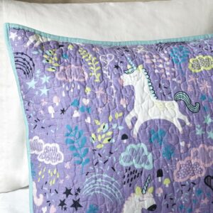 Add a touch of whimsy to your child s bedroom with the Home Essence Kids Purple Unicorn Reversible 4 Piece Coverlet Set. Adorable unicorns prance across the top of the coverlet and matching shamin bright colors. The solid reverse highlights the fun print on the coverlet, making it pop! Two decorative pillows featuring pleating details and an applique unicorn provide a magical finishing touch. Machine washable for easy care, this bedding set is also OEKO-TEX certified, meaning it does not contain any harmful substances or chemicals, and uses an antimicrobial treatment that provides built-in freshness protection, reducing the growth of odor causing bacteria to keep fabric lasting longer.