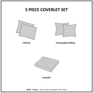 – Twin/Twin XL Set Includes: 1 Coverlet (68″W x 88″L), 1 Standard Sham (20″W x 26″L), 2 Decorative Pillows (16″W x 16″L/12″W x 16″L)