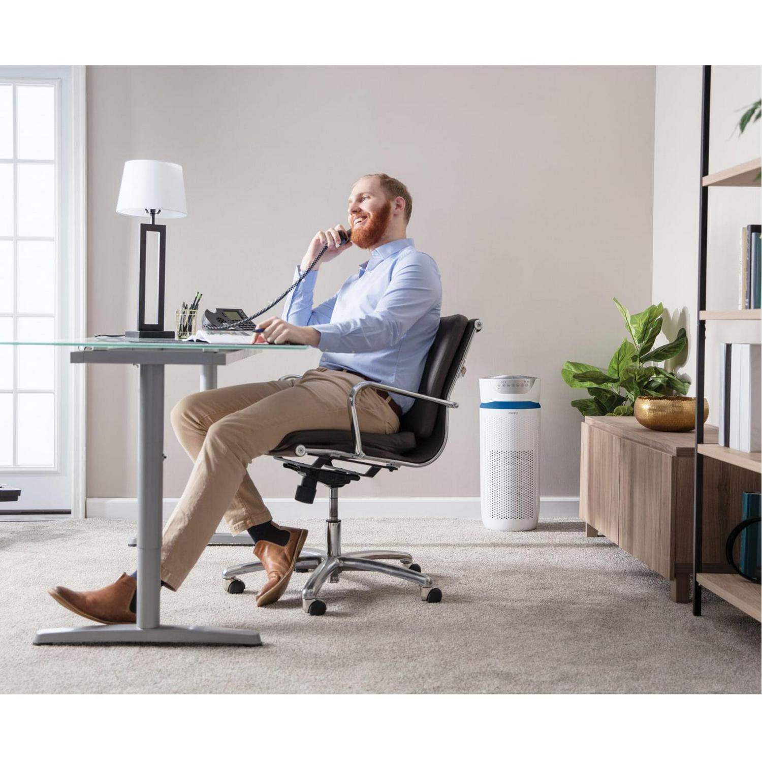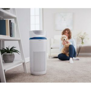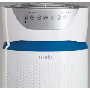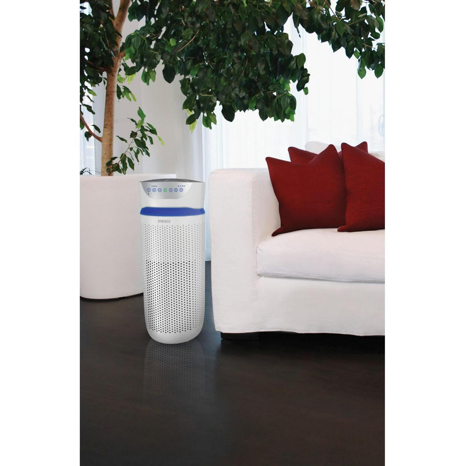 Give your family the cleanest air possible with an air purifier-with smart features like a UV-C light that kill airborne bacteria and viruses. Bad indoor air quality can make anyone working from home uneasy. Let the white HoMedics AP-T40 TotalClean 5-In-1 Tower Air Purifier remove your worry as it removes up to 99.9% of the germs and viruses in your air with its powerful UV-C light, helping combat the spread of illness and keep your home a haven of health. Meanwhile, its True HEPA filtration simultaneously captures up to 99.97% of airborne contaminants like allergens, dust, smoke, mold spores, and germs. It even features an optional ionizer that releases negative ions to assist in the purification process. This air purifier is designed to clean rooms up to 246 sq. ft.
