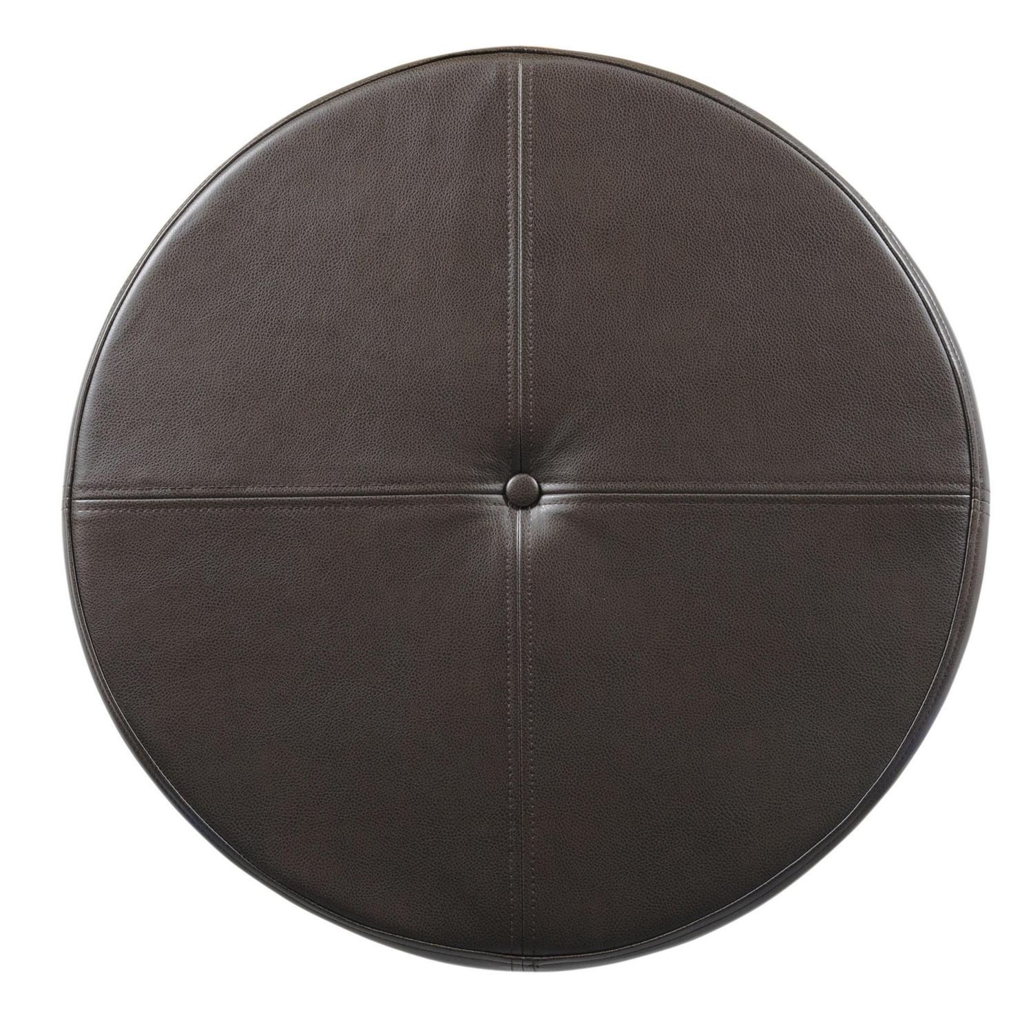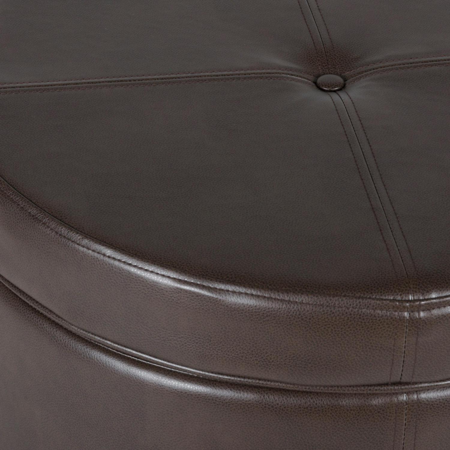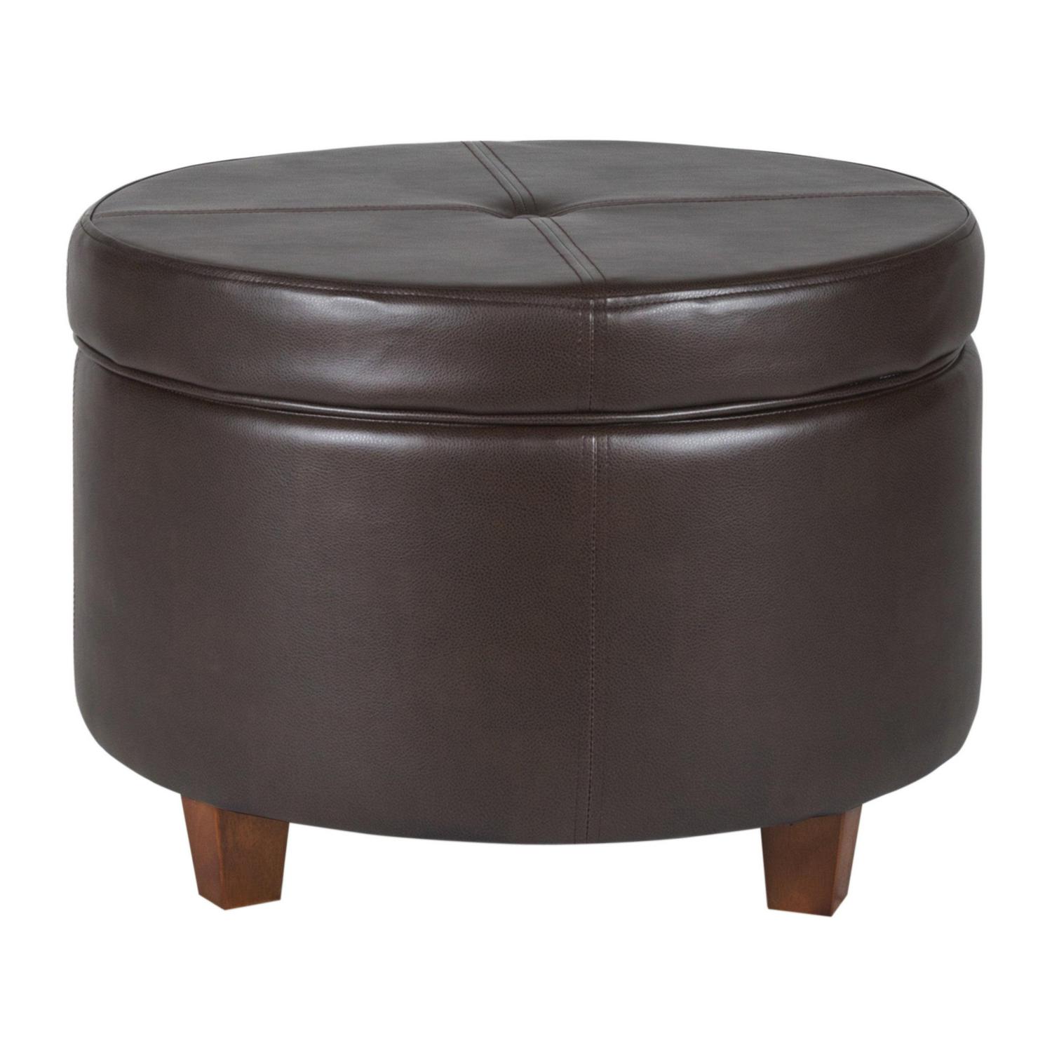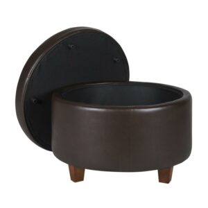 This large round storage ottoman offers timeless style in handsome faux leather. Use it in a living room or family room to contain controllers, remotes or toys or place it in a bedroom to store extra pillows or blankets. This faux leather ottoman offers stylish seating and storage two paired together doubles the impact. Upholstered in a rich deep brown with wood legs in a rustic brown finish, this round ottoman has a lift-off lid for quick access to storage within. Available in a range of neutral and on-trend colors; easy to assemble and maintain.