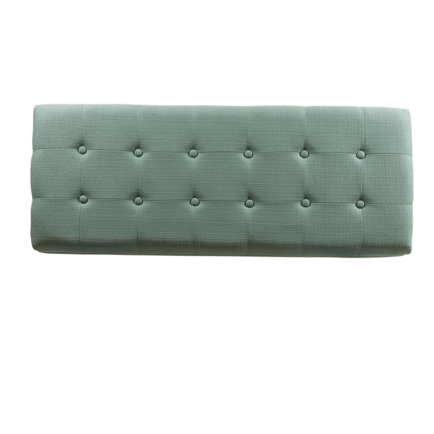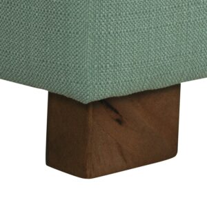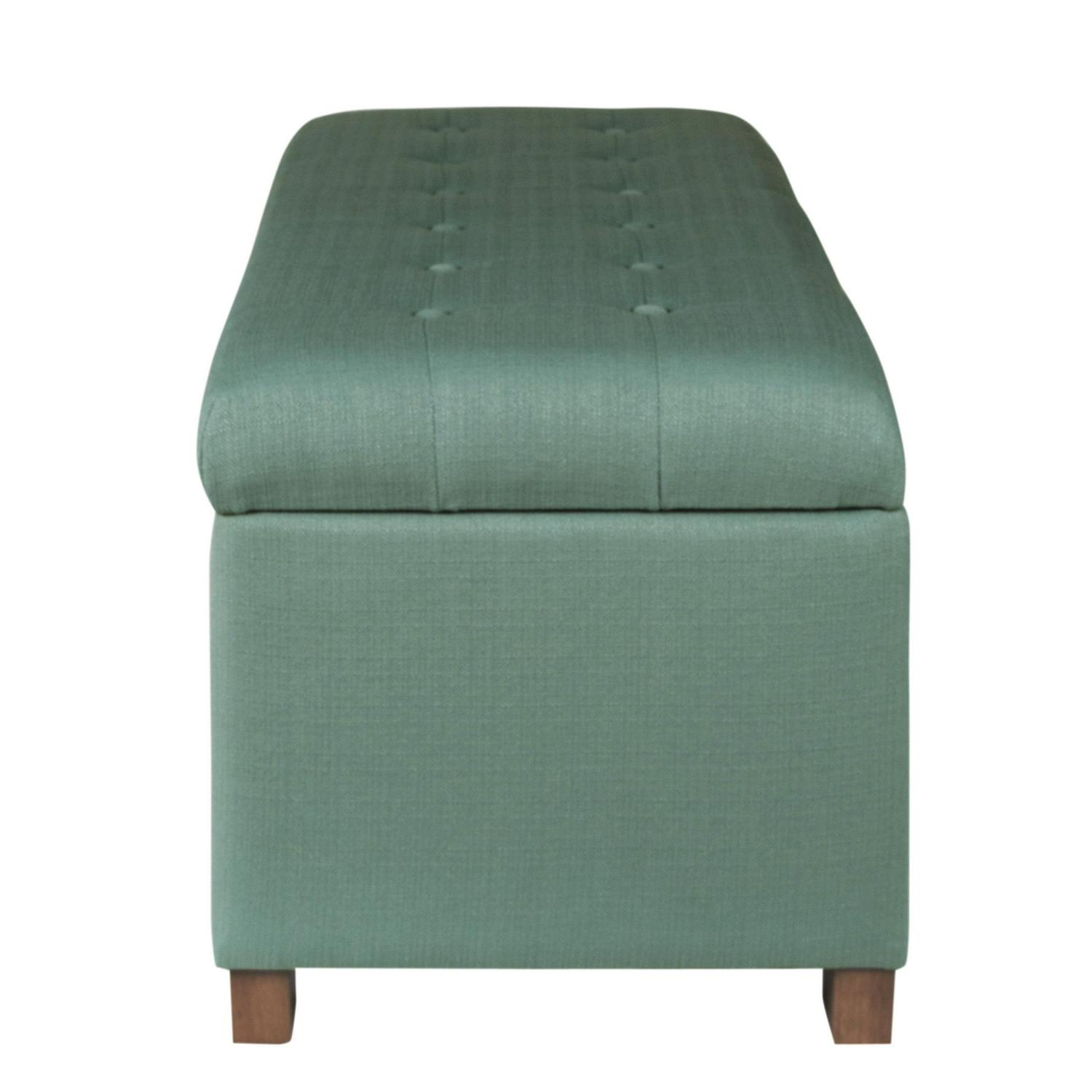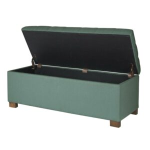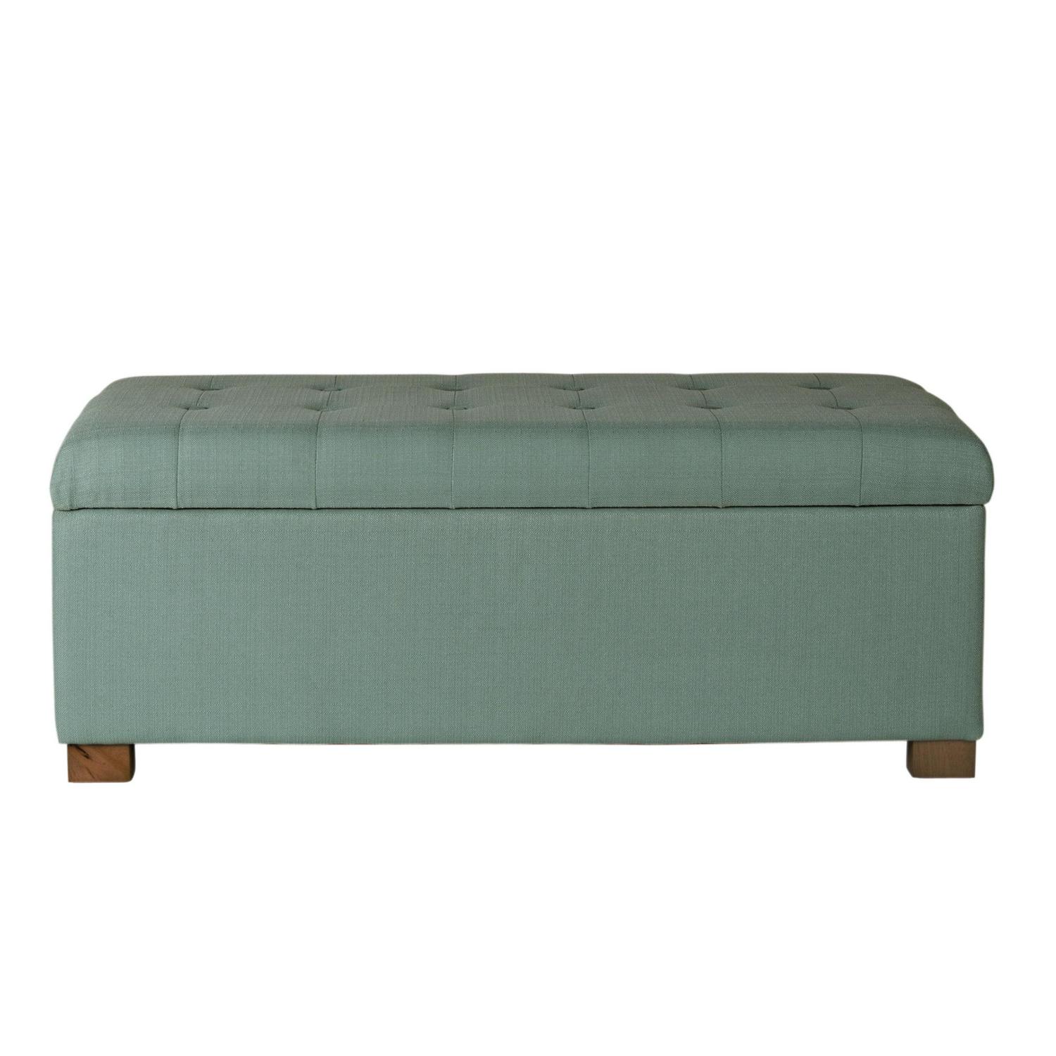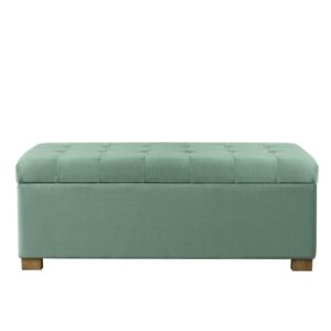 Add style and spacious storage to any room with the HomePop Large Tufted Storage Bench. Featuring a solid teal fabric with button tufting, this storage bench has wood legs in a driftwood finish. This multi-functional bench can provide seating and double as a coffee table, serve as an end of bed bench or as an entryway bench with storage. Premium details include a hinged lid and a generous storage capacity. Easy to assemble and maintain.