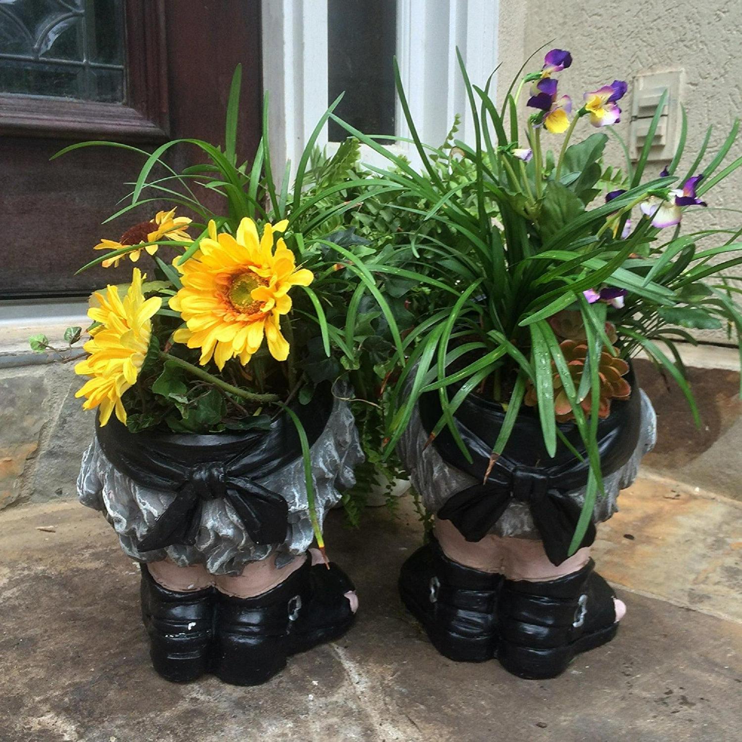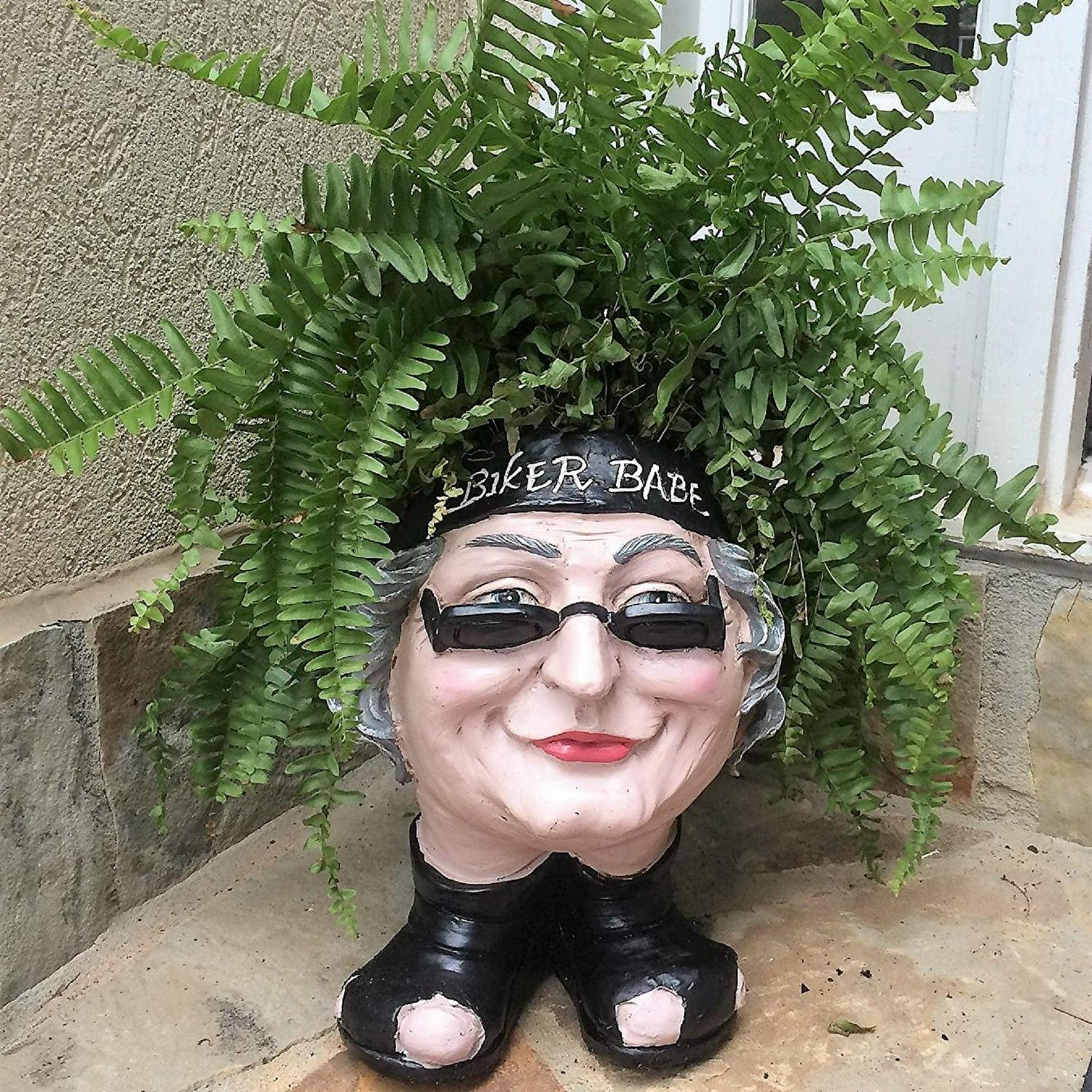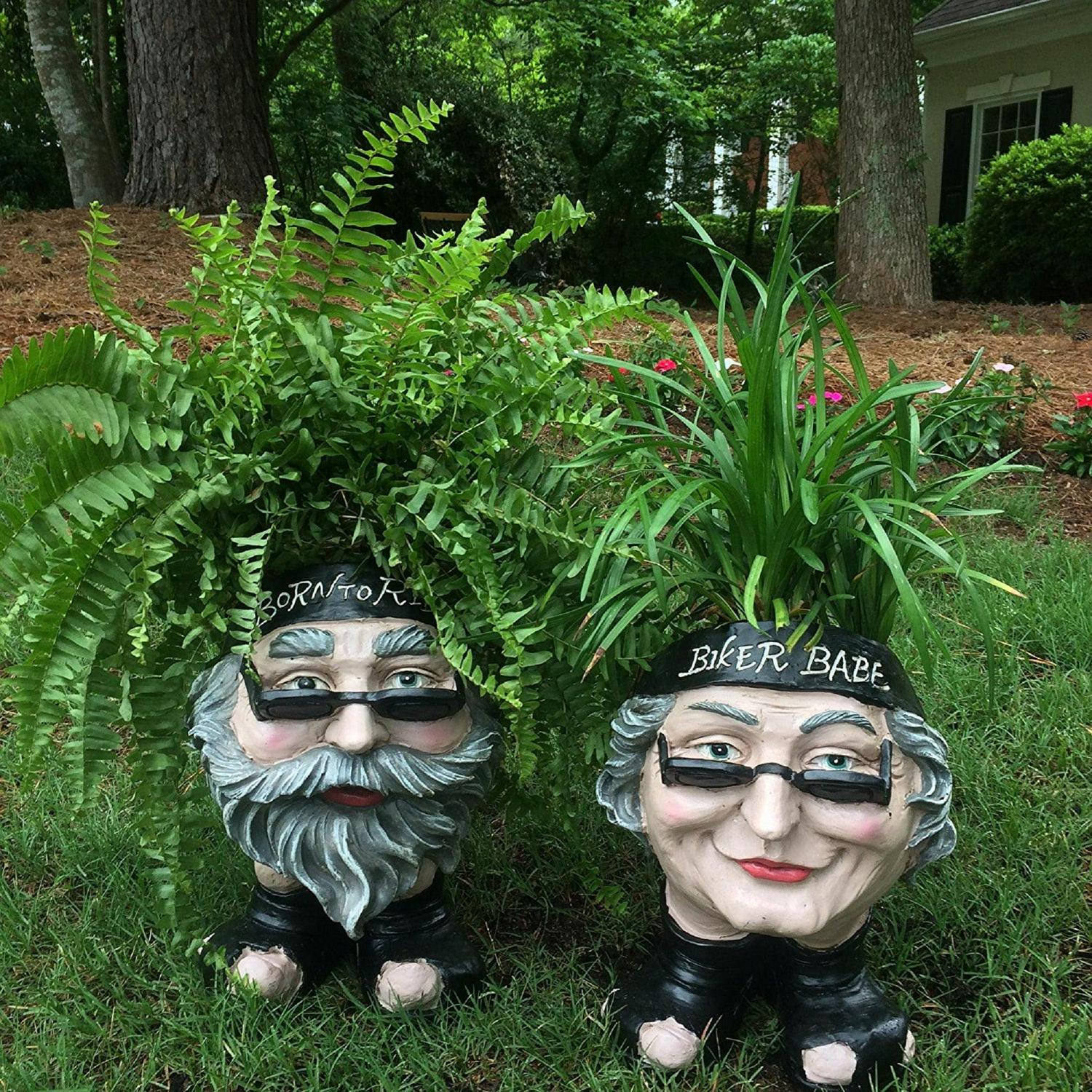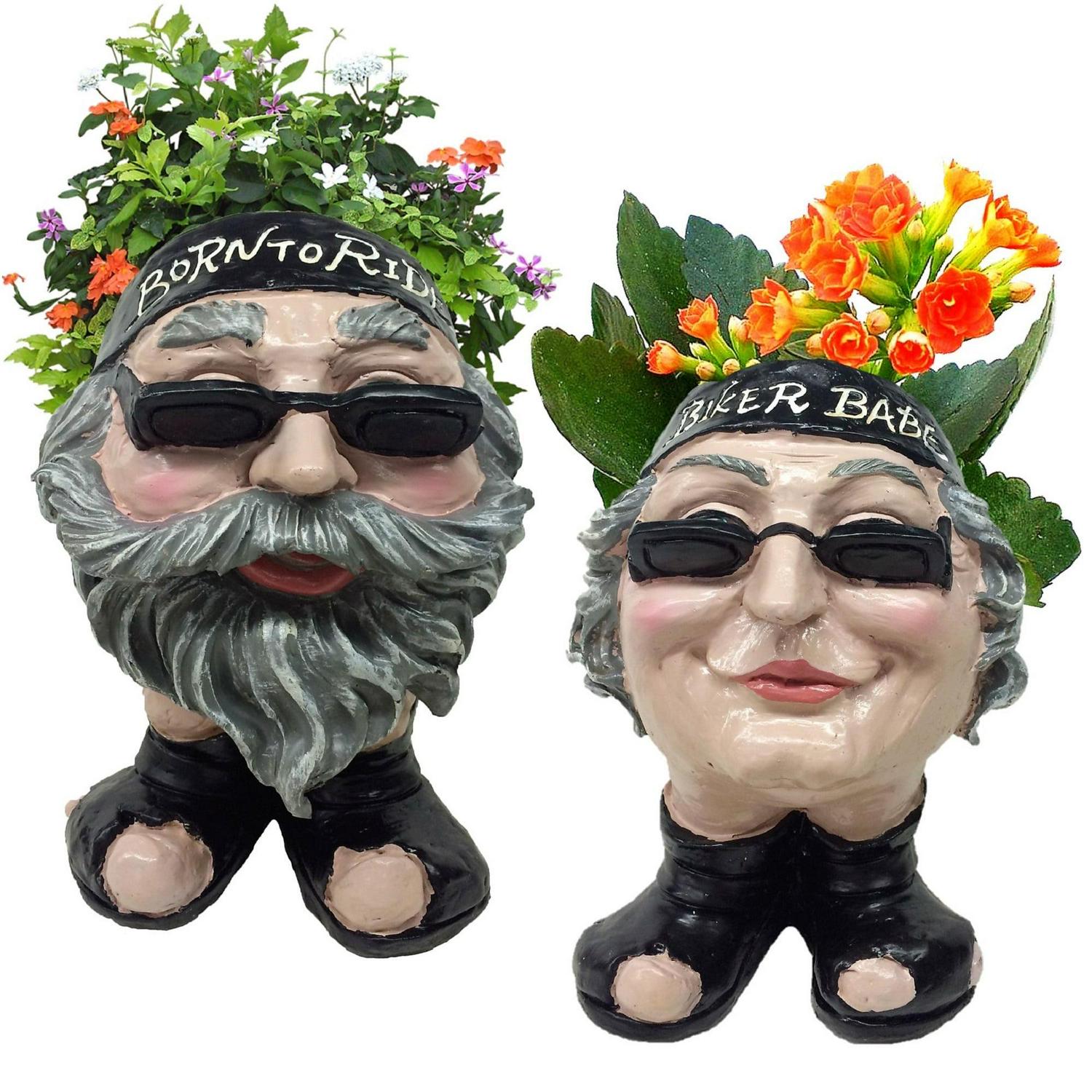 Homestyles 12 H Muggly Biker Dude and Biker Babe Painted Face Humorous Planters 2-Piece Statue Assortment (Holds 4 Pot)