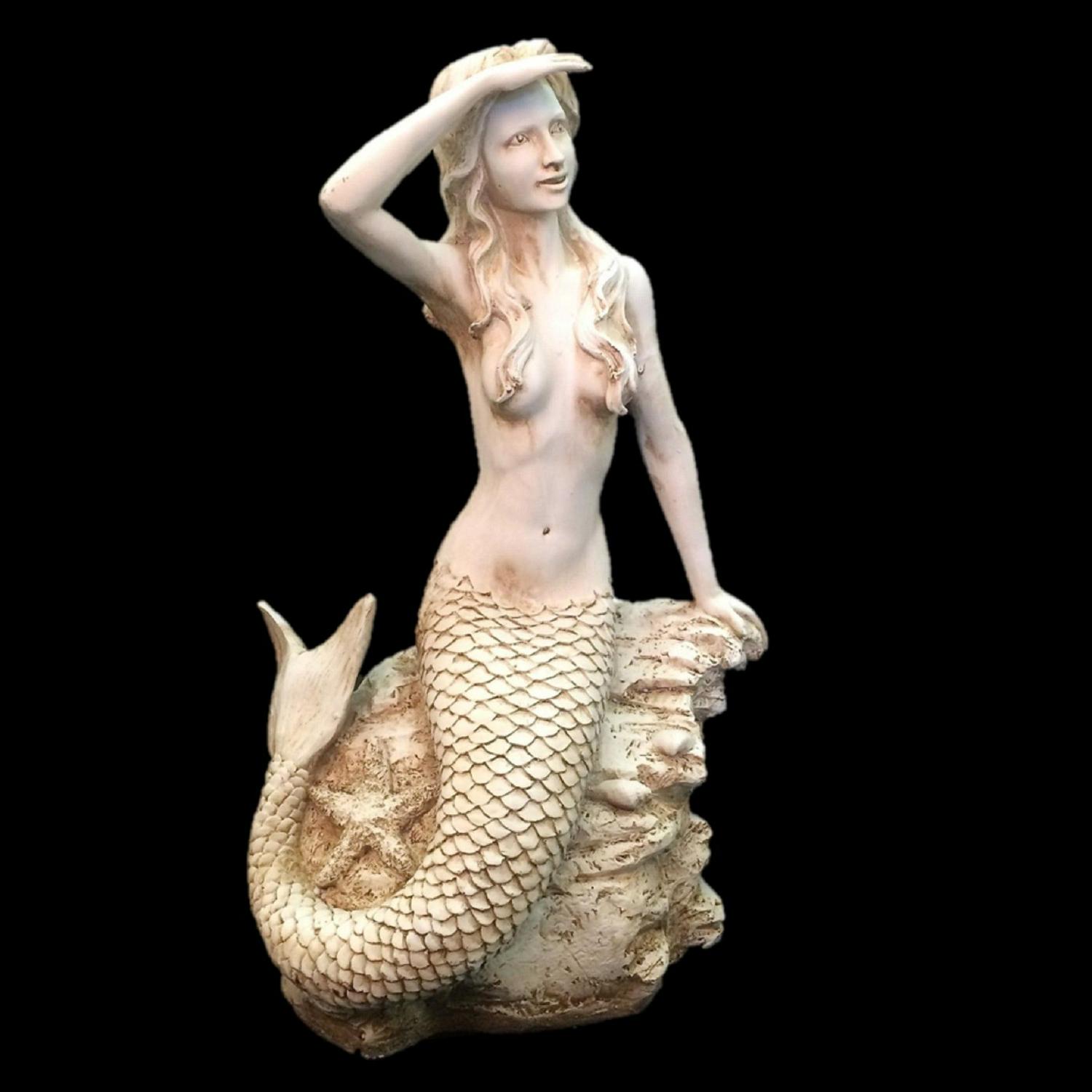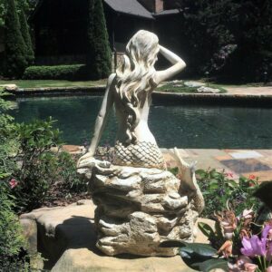 – 22″H x 13.75″W x 10″L- Beautiful details in the sculpting of her face, hand, scales, shells in rock, and hair