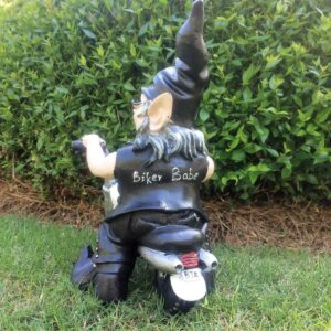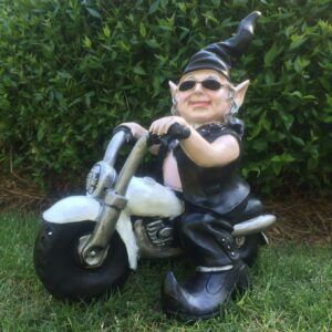 Homestyles – Nowaday Gnomes – Biker Gnomes – ‘Biker & Babe the Gnomes” wearing leather vests, leather chaps, and blue jeans, their biker boots are naturally curved at the toe as they are gnomes, don’t ya’ know, and Nowaday Gnomes to-boot! No pun intended. Legend has it; Nowaday Gnomes occupy a parallel universe to our own, living quietly among us, they have mimicked our evolution throughout time, from scavenging for food with rocks and clubs in the ice-age to shopping and sharing emoji’s on smartphones and tablets today, they have evolved as we have evolved, done everything we have done, coveted everything we have coveted, and enjoy everything we enjoy, especially “riding motorcycles!” Nowaday Gnomes love “ridining” which begs the question; who is mimicking whom The ultimate collectible home and garden figurine statue assortment for the “Biker” or motorcycle enthusiast. They are a great gift for the “Biker” couple in the family or neighborhood. The 2 pieces are sold together as a set. Other key features include; made of durable cast resin, hand painted, suitable for indoor & outdoor use, realistic UV resistant color paint finish, great gift for the gardener, and a great home decor or garden statue.