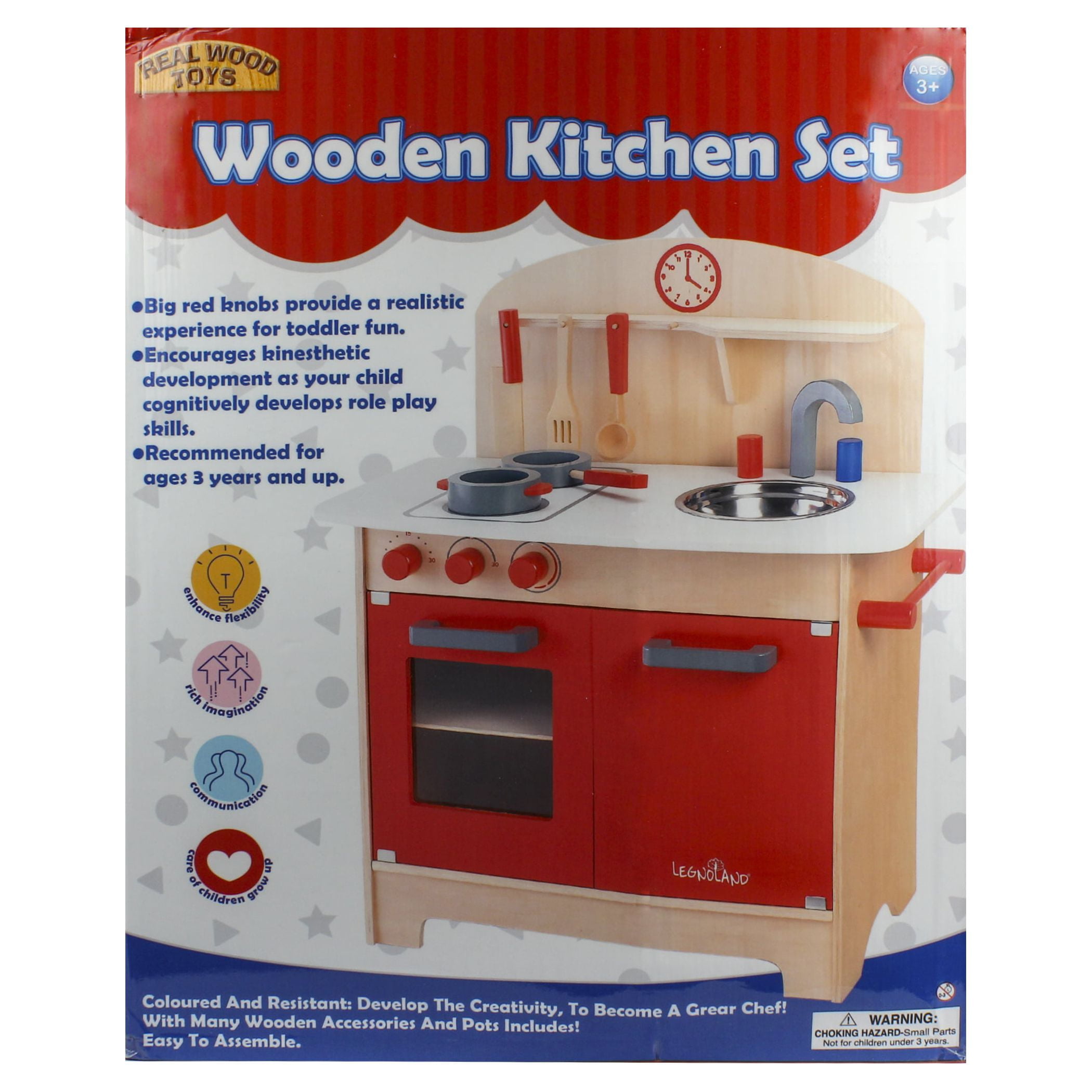 Large red stove knobs, pretend clock and storage areas Colored in natural wood and painted red Encourage your child’s development and develop role-playing skills Accessories: spatula, ladle, scraper, 1 fry pan, 1 pot