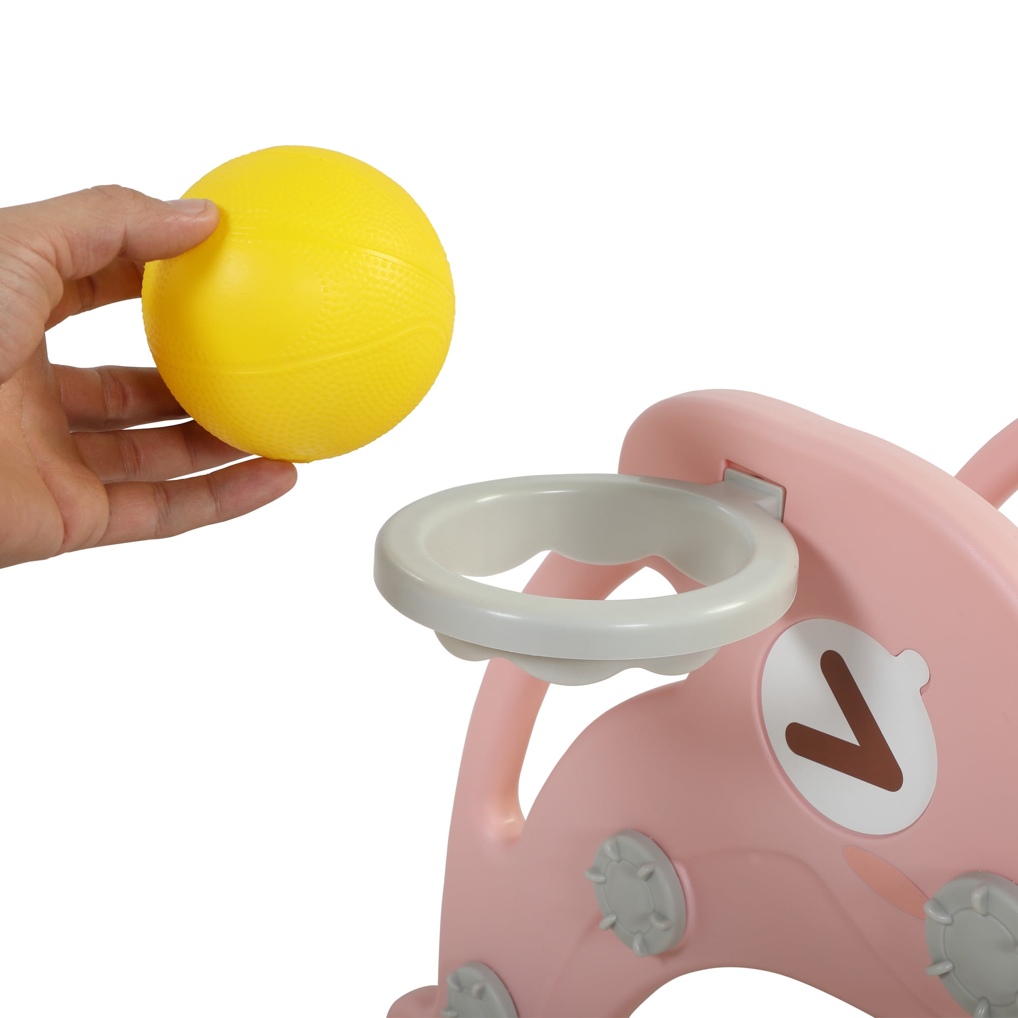2-IN-1 BASKETBALL HOOP AND SLIDE: Slide and climb with this multifunctional kids activity center! This kids activity center includes a slide, 1 basketball hoop, and easy-to-climb steps for many ways to play. The fun giraffe designs add pizzazz to your background or play room! Features: 【3 in 1 Kid Play Set】: Including a smooth slide, a nonslip climber, a basketball hoop and a ball, this multifunctional slide set is a perfect gift for toddlers within 4 years old to release energy. 【Secure & Durable Structure】: Crafted from kid-friendly plastic in a stable triangle shape, this indoor/outdoor slide has high security and durability. The maximum bearing capacity is 66 LBS. 【Extended Slide Design】: With the help of side rails and a buffer zone, the extra-long slide prevents your baby from getting hurt when sliding out. 【Climbing & Playing Ball Fun】: 3 non-slip steps with easy-to-grip handrails help your kids to climb up and down confidently. Besides, the basketball hoop and a ball inspire them to dunk. 【Quick Assembly】: Just insert the 13 plastic screws and tighten them with the matching screwdriver. 6 nuts are added to reinforce the toddler slide to prevent loosening. Specifications: Color: Pink Type: Freestanding Slide Recommended Ages: 1-4 years old Material: HDPE + ABS Overall Dimensions: 45.3″L x 20.5″W x 19.5″H Slide Dimensions: 38.2″L x 10.6″W x 14.2″H Slide Handrail Dimensions: 26.6″L x 5.3″H(highest) Each Step Dimensions: 11.4″L x 4.3″W Distance Between 2 Steps: 4.3″ Diameter of Basketball Hoop: 5.9″(outer), 4.6″(inner) Height of Basketball Hoop: 18.4″ Weight Capacity: 66 LBS Net Weight: 6.2 LBS