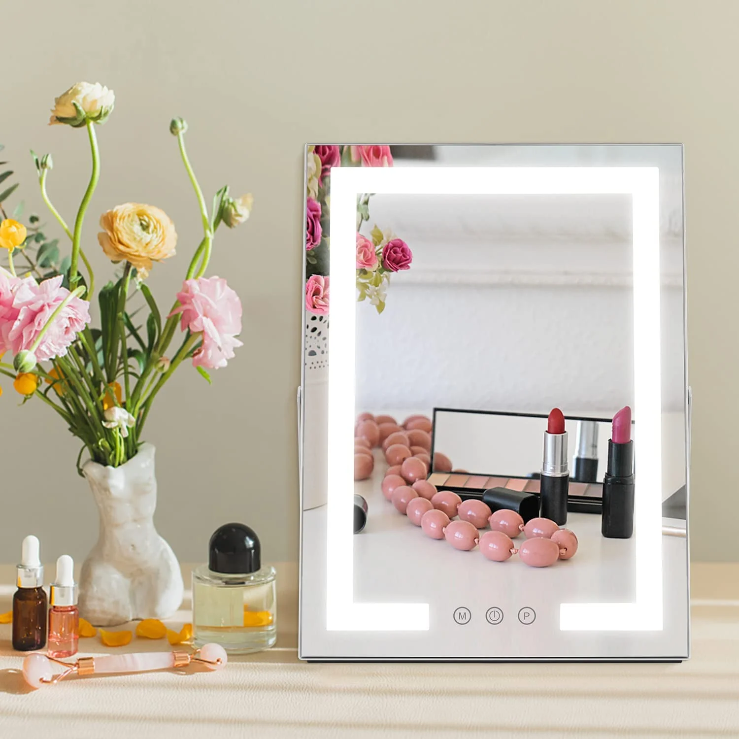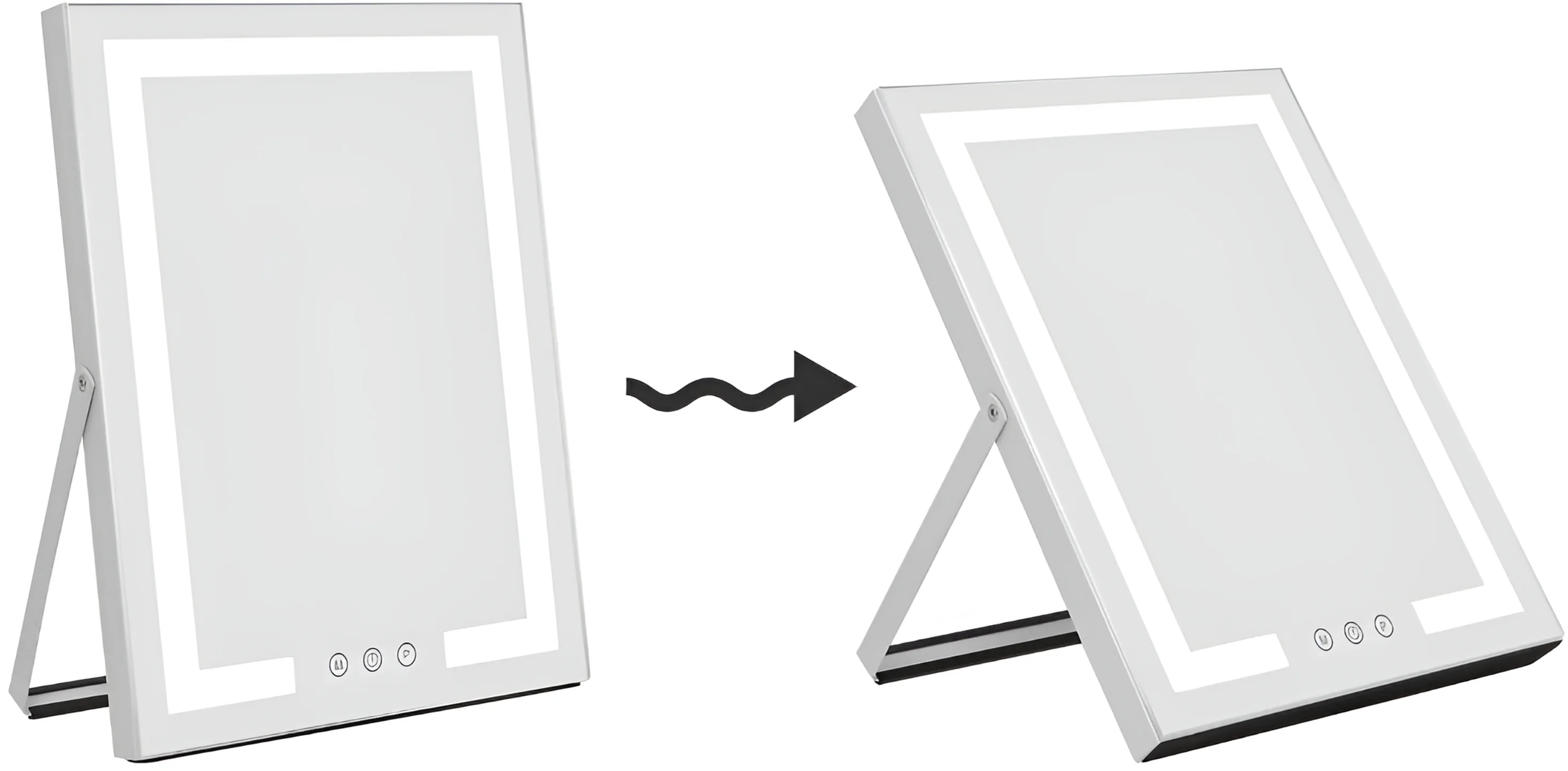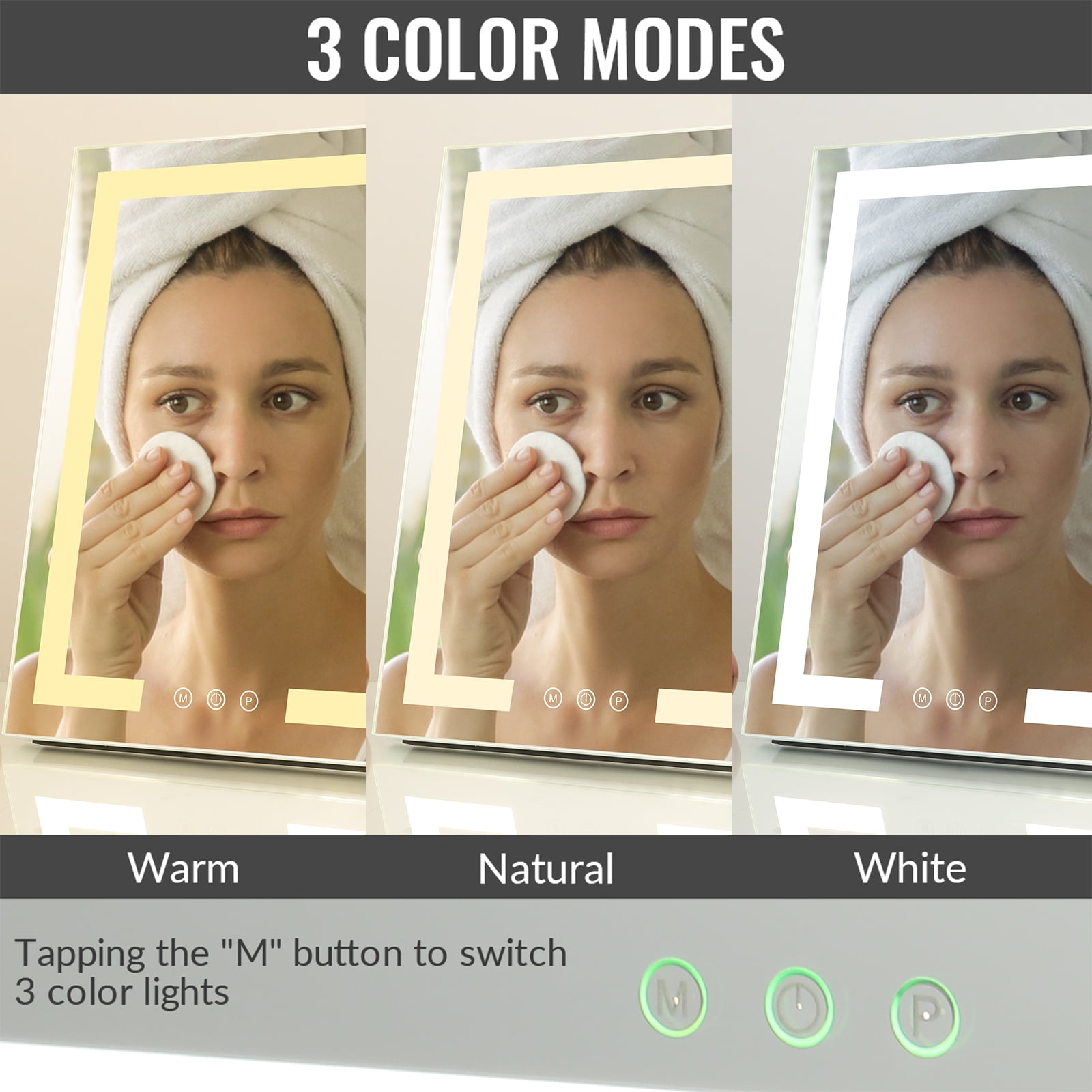 ·Smart Touch Button The lighted makeup mirror has a smart touch sensor design on the screen. you can adjust on/off, brightness and color modes by touching the buttons. ·Three colors lights To meet all requirement of your making up, we design offer you three colors of lights,you also can adjust the dimmable lightings. ·Adjustable mirror angle Easy to adjust the mirror and find the proper viewing angle you need. ·Mirror Size: 12 x 16 inch Smart Touch Button|Three colors lights|Adjustable mirror angle|360 Degree Rotation