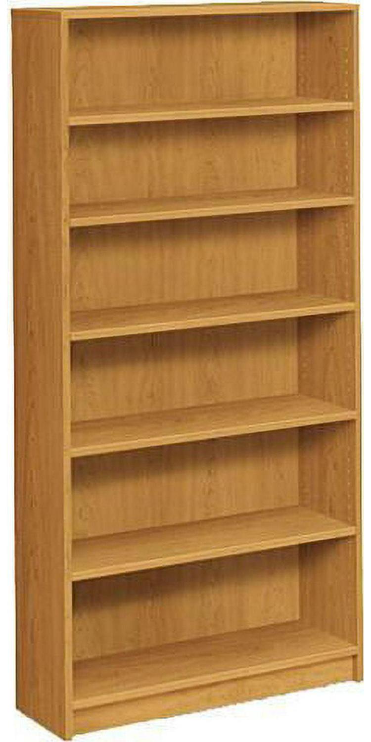 Six-shelf laminate bookcase features a square-edge profile and hardboard back panel. All surfaces (except outside of back) are finished in abrasion-resistant, thermal-fused, Harvest laminate over solid-core, high-density particleboard. Four of the 3/4″ thick shelves are adjustable in 1-1/4″ increments. 72-5/8″ high bookcase is designed for small office/home office applications. Cam-lock fasteners and wood dowels ensure pieces go together easily and precisely. Bookcase is equipped with four adjustable leveling glides. Meets or exceeds ANSI/BIFMA and ISTA performance standards.