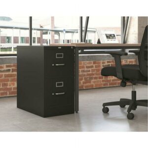 HON 310 Series vertical files offer top-drawer performance for long-term records management. They are loaded with standard features such as ball-bearing drawer suspensions, locks with interchangeable cores, high drawer sides for hanging folders and spring-loaded follower blocks that keep things tidy in every drawer. These are wrapped in a durable steel case with vertical reinforcements at every corner and a double kick-plate front and center. This 26-1/2″D two-drawer letter-width file is our most popular depth. Lock and label holders are standard. The handles coordinate with HON 34000 Series desks. Finish color is Black.