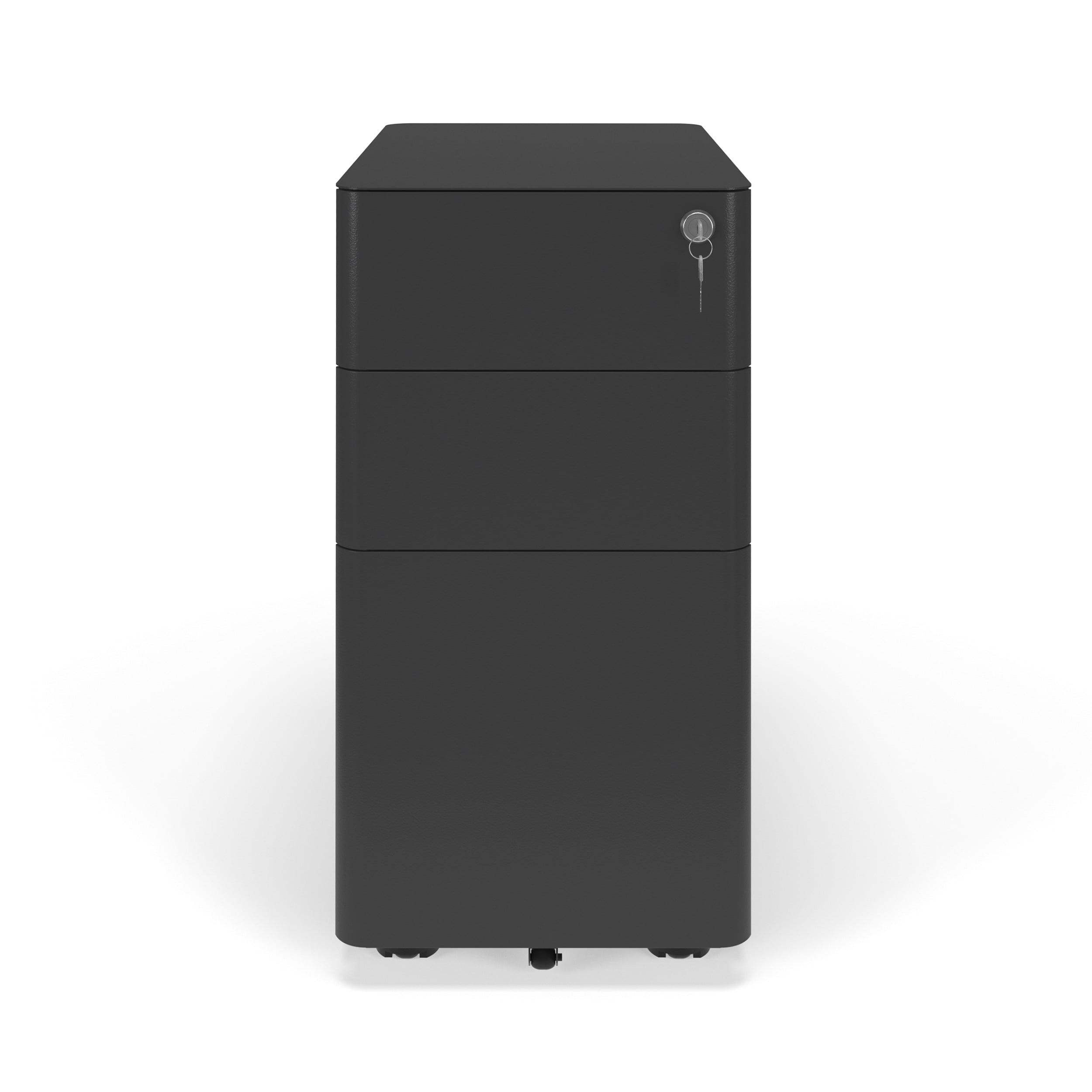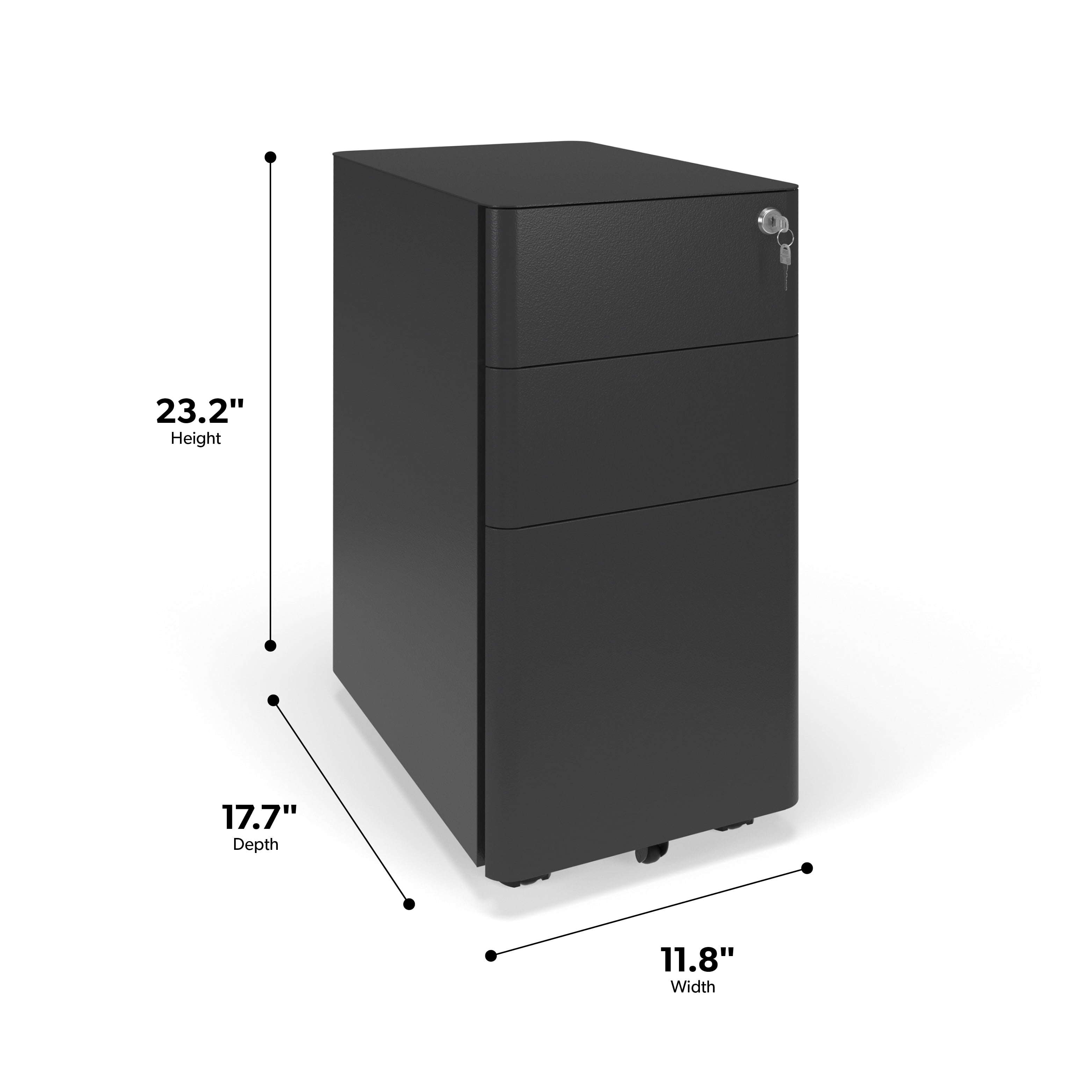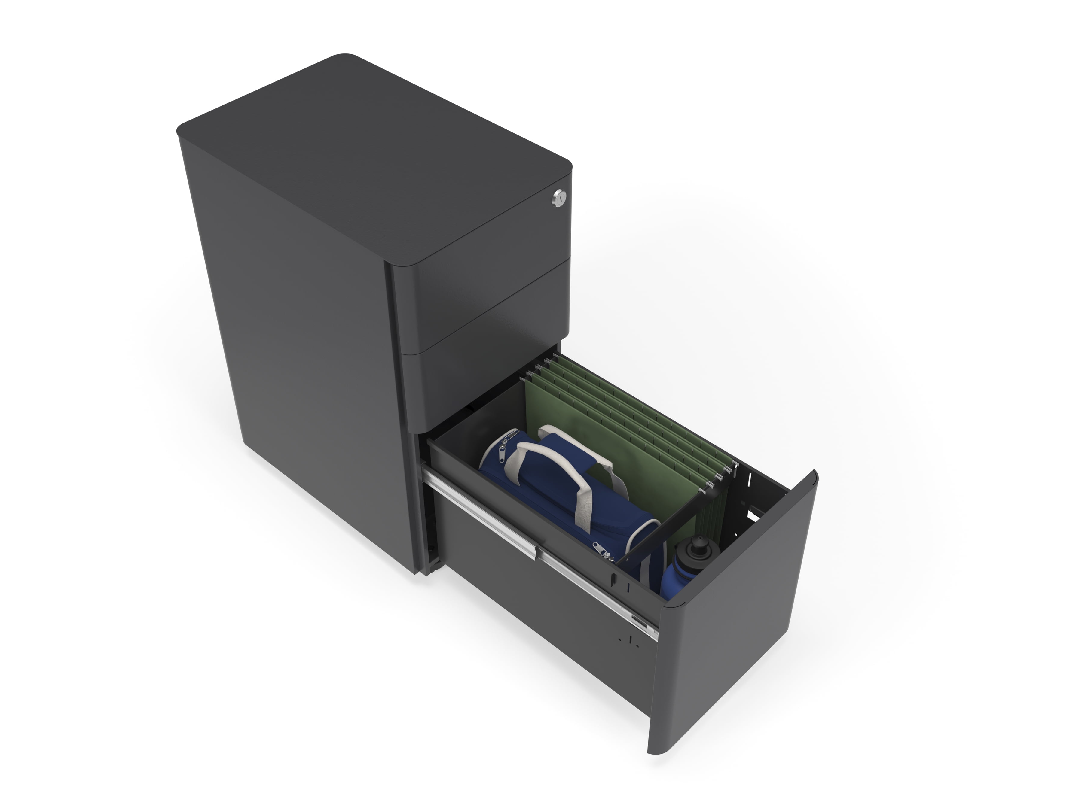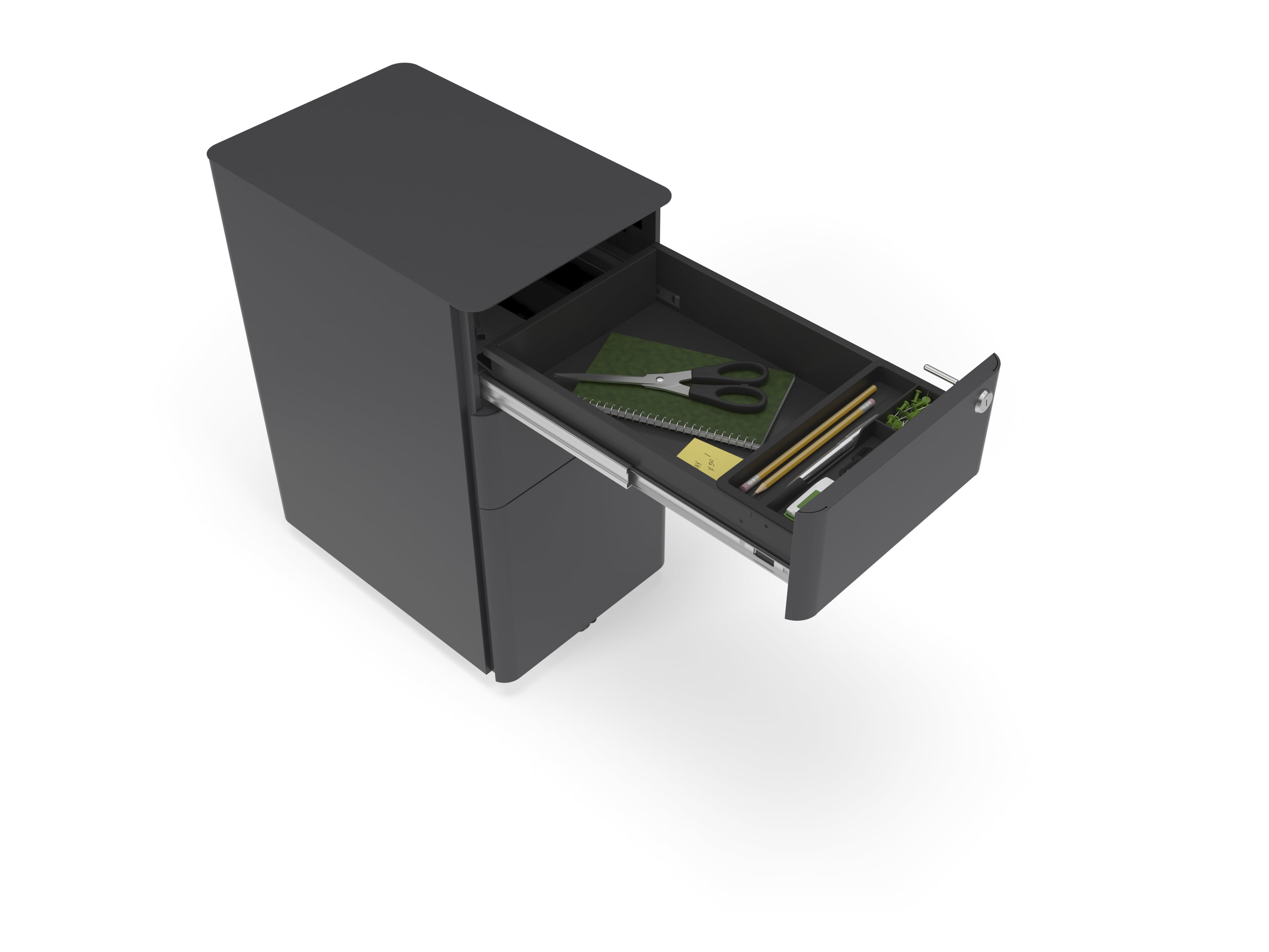 Sleek and streamlined with a modern flair, the HON Basyx Commercial-Grade Slim Modern Mobile Steel Pedestal features a rounded modern front and can fit nearly anywhere at just under 12″ wide. This 3 drawer filing cabinet features 2 box drawers suitable for stationery and standard office supplies, top drawer includes a pencil tray, and the third drawer accommodates letter and legal sized hanging files. The locking file cabinet locks all 3 drawers for complete security. The pedestal features a smaller front caster that prevents the unit from tipping. The cold rolled steel pedestal comes nearly assembled, simply affix the casters to the pedestal base and it’s ready for use! Durable casters provide easy mobility around the office. The filing cabinet features commercial-grade full-extension ball-bearing slides for smooth drawer movement. This slim pedestal’s dimensions are 17.7″ D x 11.8″ W x 23.2″ H and it is backed by the HON Basyx Limited 5-Year Warranty.