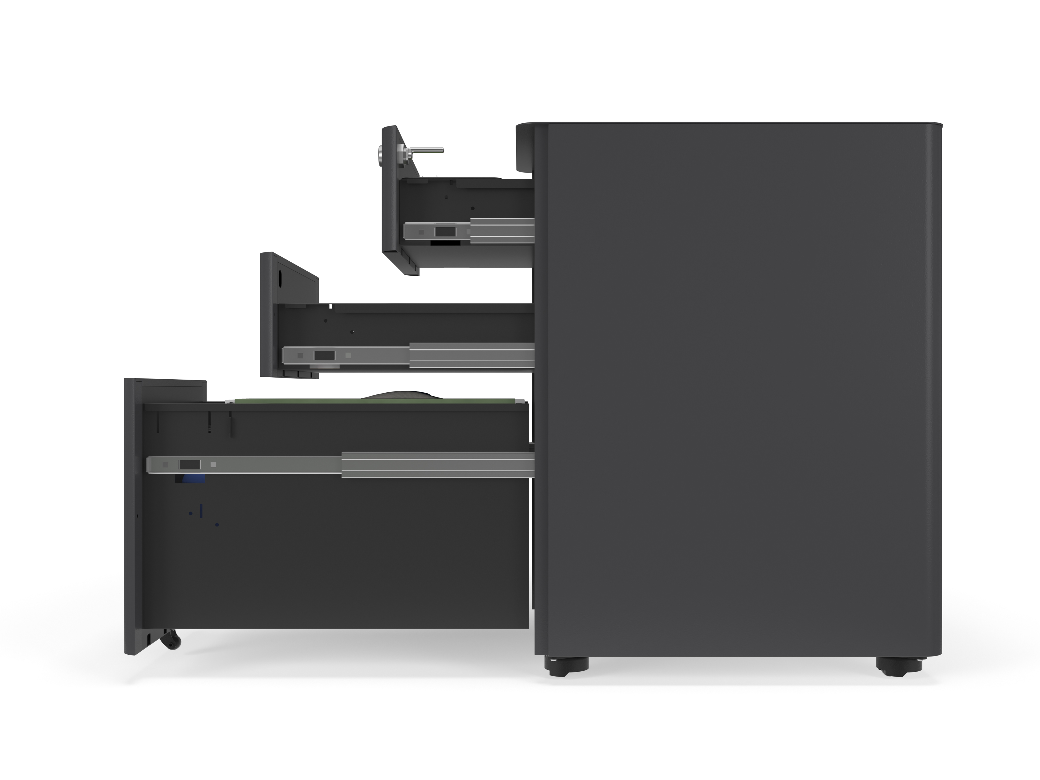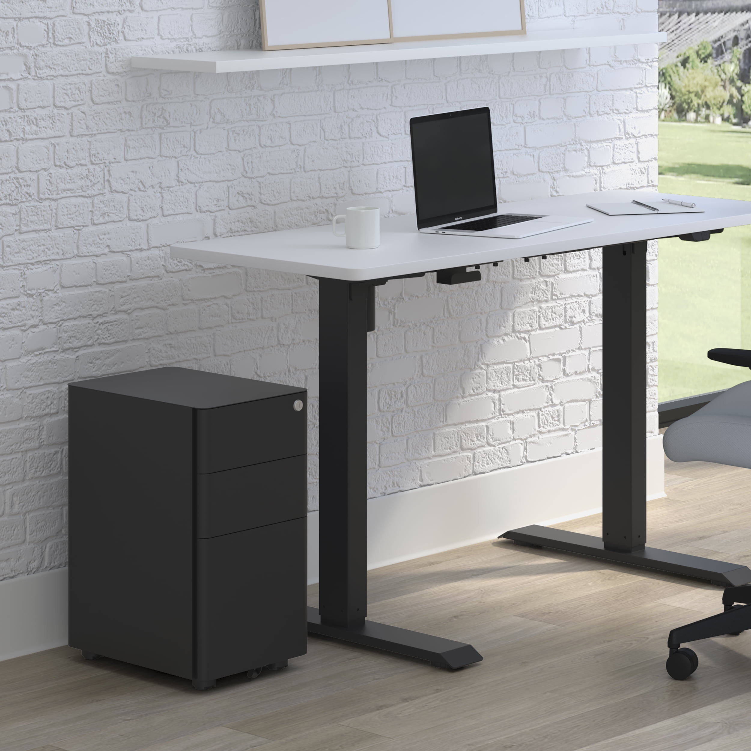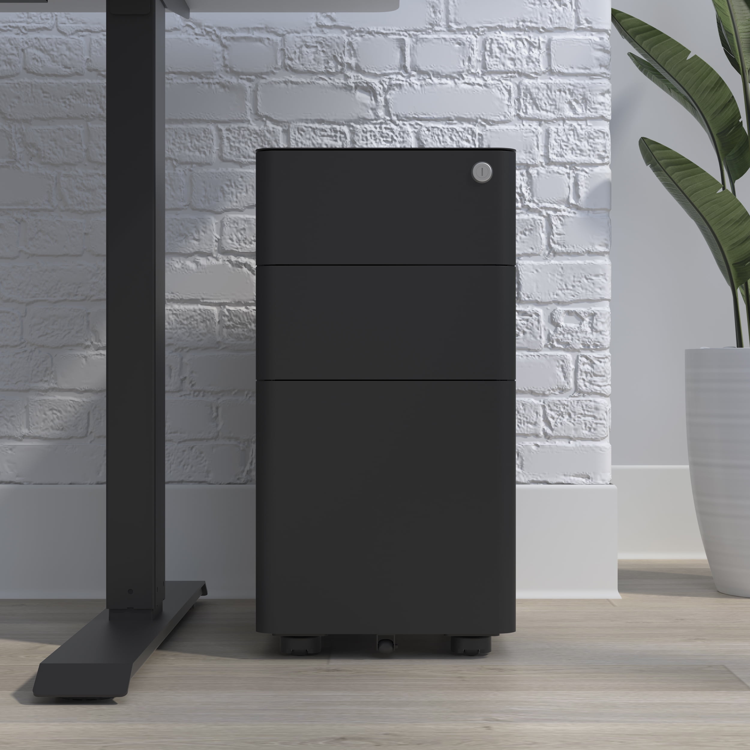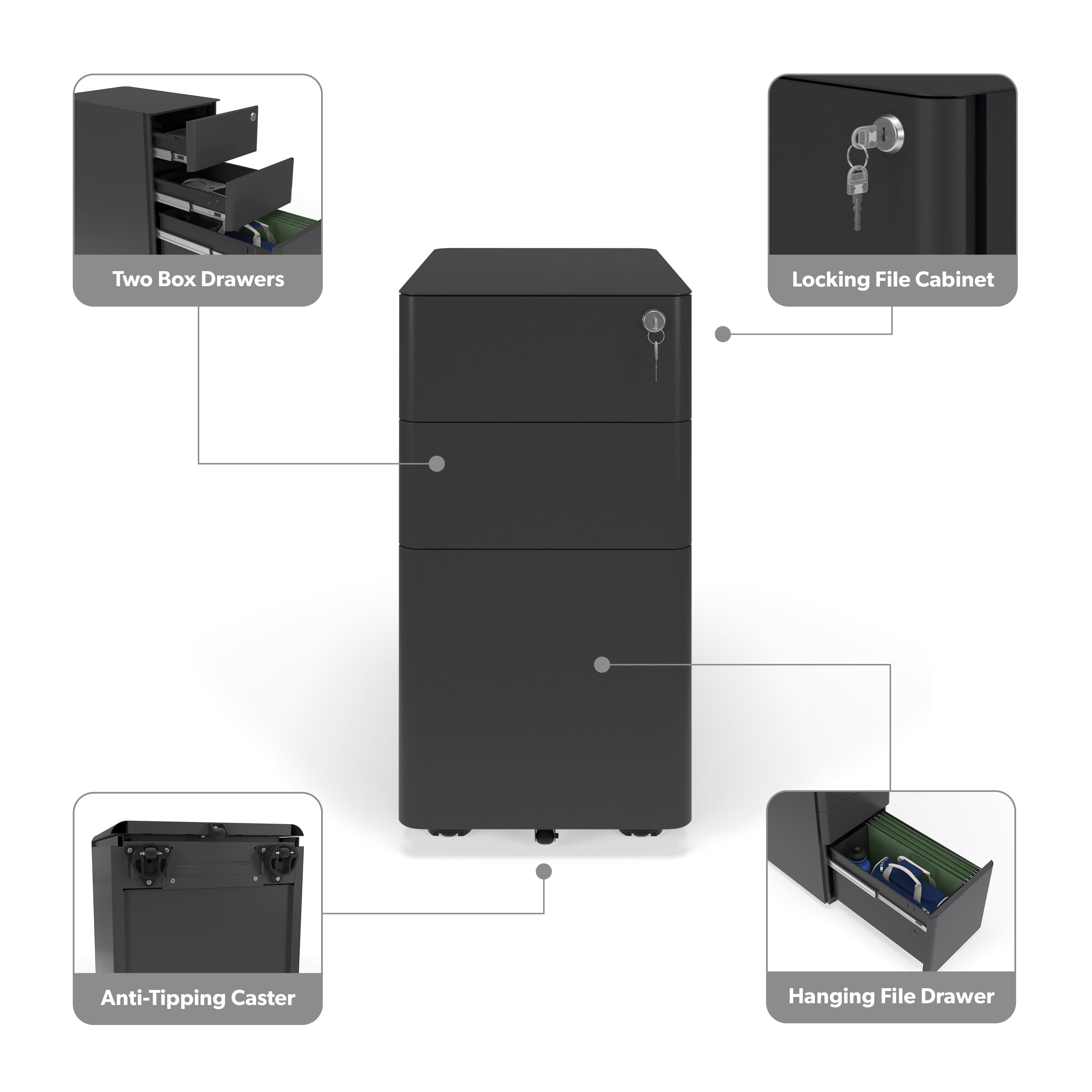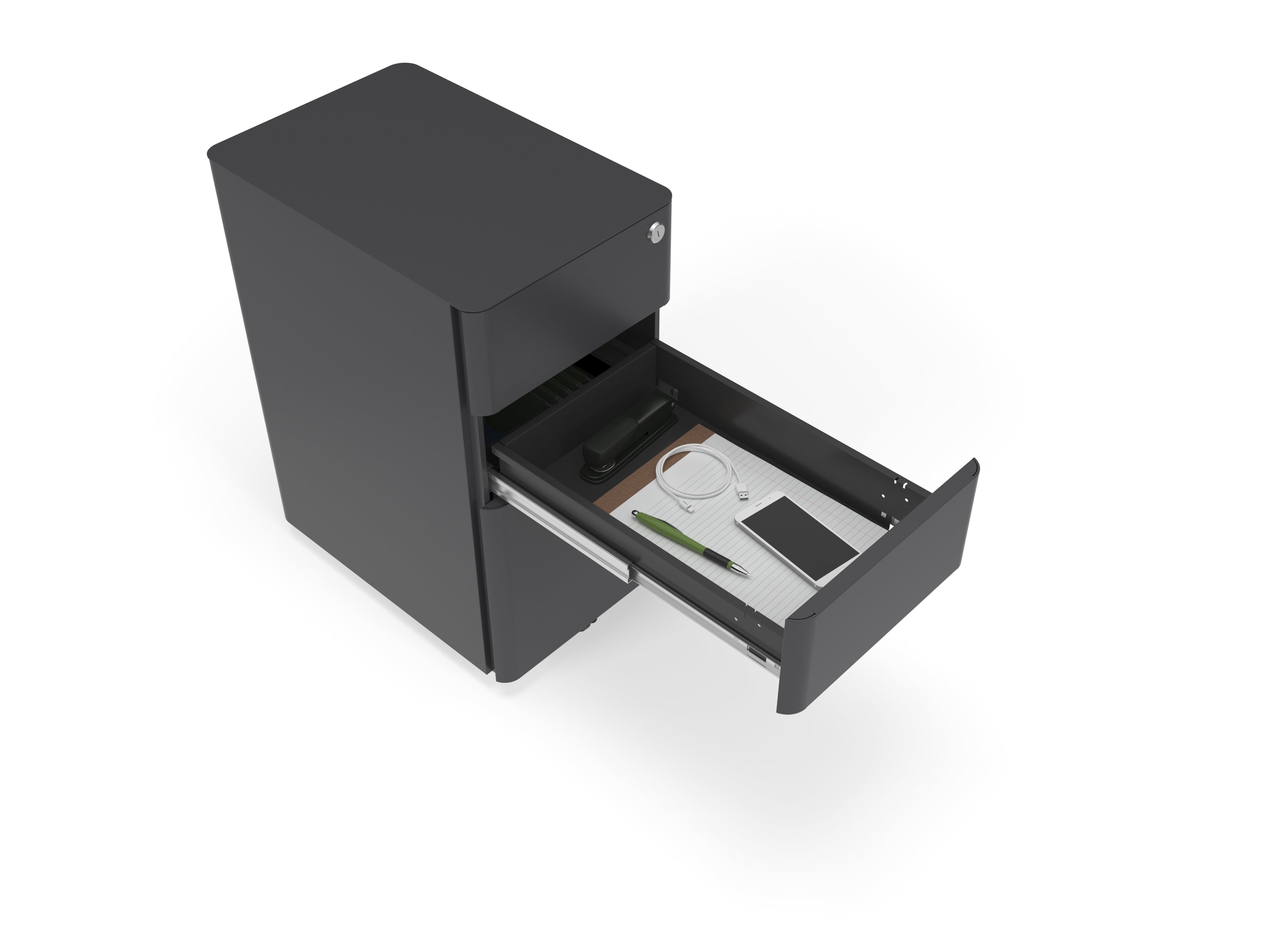 Sleek and streamlined with a modern flair, the HON Basyx Commercial-Grade Slim Modern Mobile Steel Pedestal features a rounded modern front and can fit nearly anywhere at just under 12″ wide. This 3 drawer filing cabinet features 2 box drawers suitable for stationery and standard office supplies, top drawer includes a pencil tray, and the third drawer accommodates letter and legal sized hanging files. The locking file cabinet locks all 3 drawers for complete security. The pedestal features a smaller front caster that prevents the unit from tipping. The cold rolled steel pedestal comes nearly assembled, simply affix the casters to the pedestal base and it’s ready for use! Durable casters provide easy mobility around the office. The filing cabinet features commercial-grade full-extension ball-bearing slides for smooth drawer movement. This slim pedestal’s dimensions are 17.7″ D x 11.8″ W x 23.2″ H and it is backed by the HON Basyx Limited 5-Year Warranty.