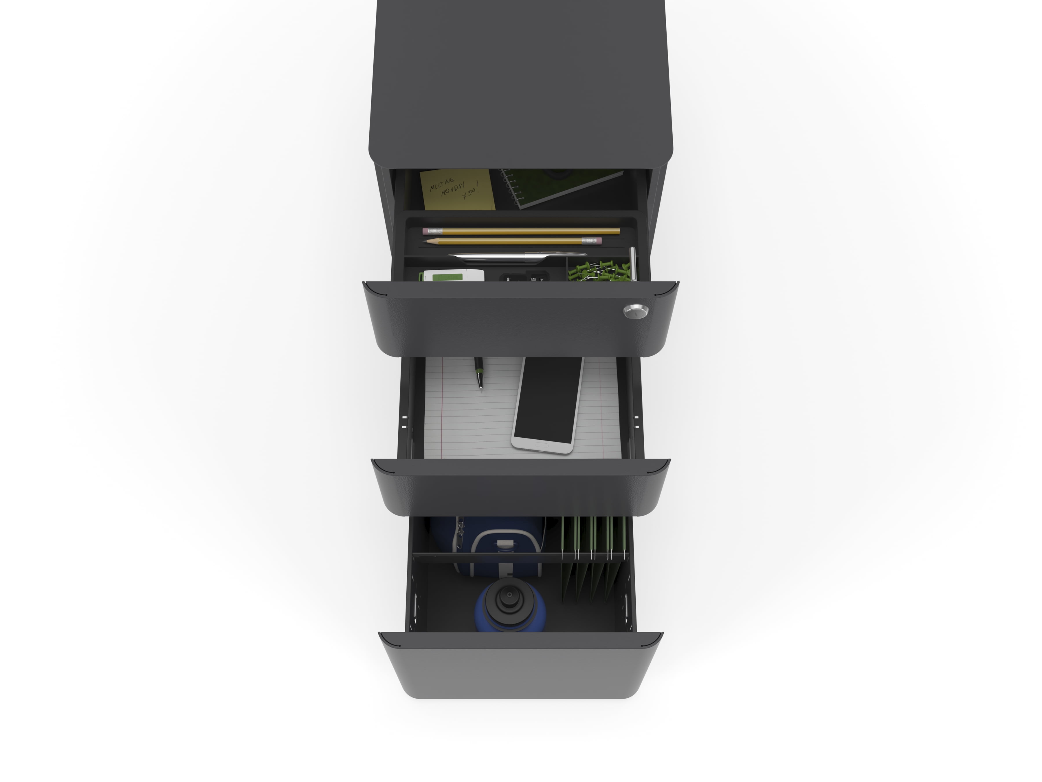 This commercial-grade mobile steel pedestal features materials and construction you can count on with rounded modern drawer fronts for the fresh look you want Slim width filing cabinet allows it to fit in smaller spaces at just under 12″ wide and preserves under desk legroom Top two box drawers are perfect for stationery and typical office supplies Top box drawer features a pencil tray to help keep your office supplies organized and easily accessible The 3rd drawer accommodates letter and legal sized hanging files or personal items The drawer finger pulls are hidden away at the sides of the drawers to provide a streamlined, modern look to the drawer fronts Locking file cabinet locks all 3 drawers for complete security when needed Pedestal features a smaller front caster that makes this office furniture anti-tipping Steel pedestal comes nearly assembled, simply affix the casters to the pedestal and it’s ready for use Casters are durable and allow the locking storage cabinet to be easily moved around when needed Commercial-grade full-extension ball-bearing slides for smooth drawer movement This slim pedestal’s dimensions are 17.7″ D x 11.8″ W x 23.2″ H This filing pedestal is backed by the HON Basyx Limited 5-Year Warranty