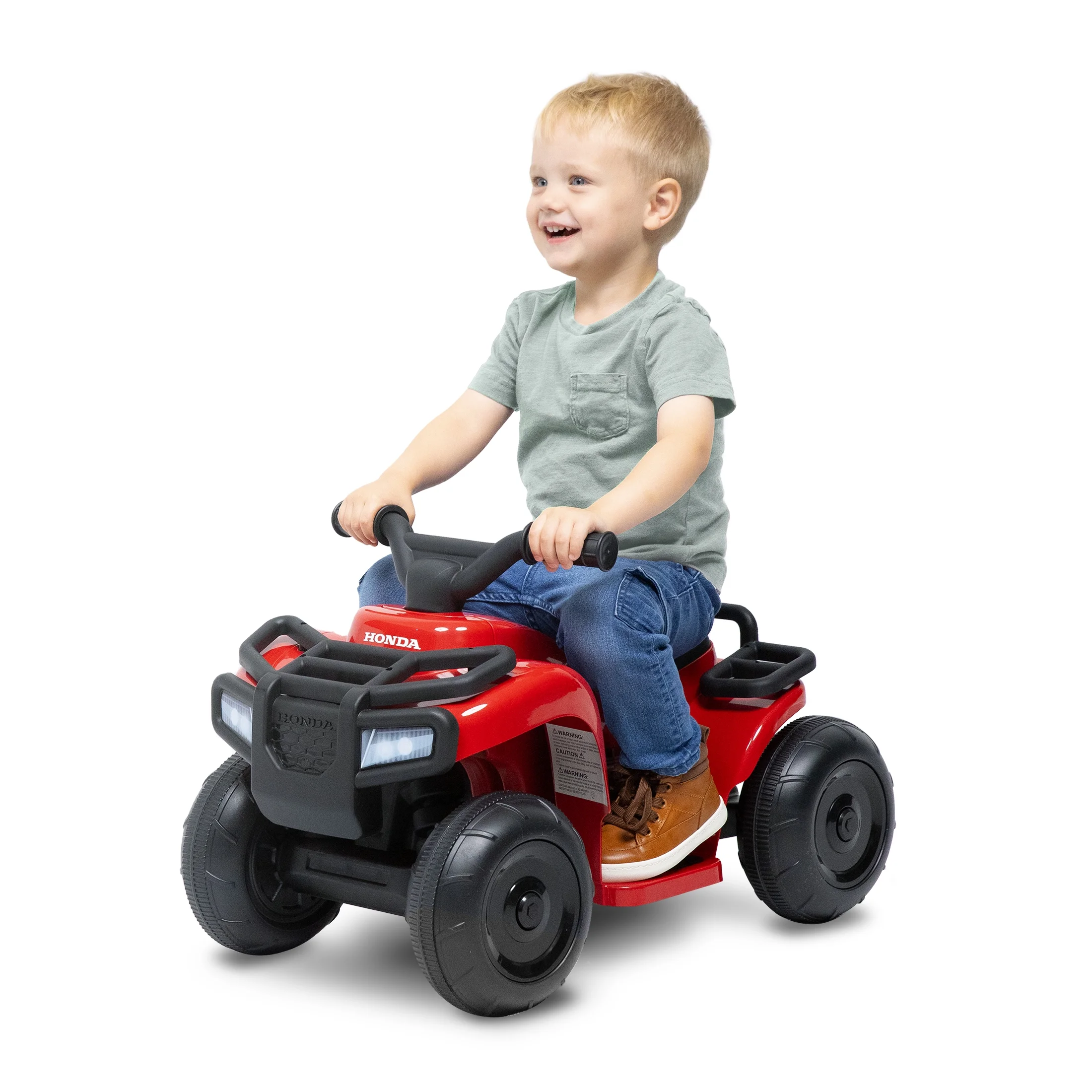 The Honda FourTrax 6 Volt Ride On ATV is a great gift for ages 18-36 months. It has extra-large large tires with aggressive tread for traction to help kids conquer the sidewalk. A max speed of up to 3 mph, this toy will quickly become the favorite transportation mode of the young kid in your life. Features include a forward and reverse, a 6V rechargeable battery and charger, steel handlebars, and a long seat to fit ages 18-36 months. This product is not recommended for use on grass or hills. It performs best on flat hard surfaces like sidewalks and private driveways.