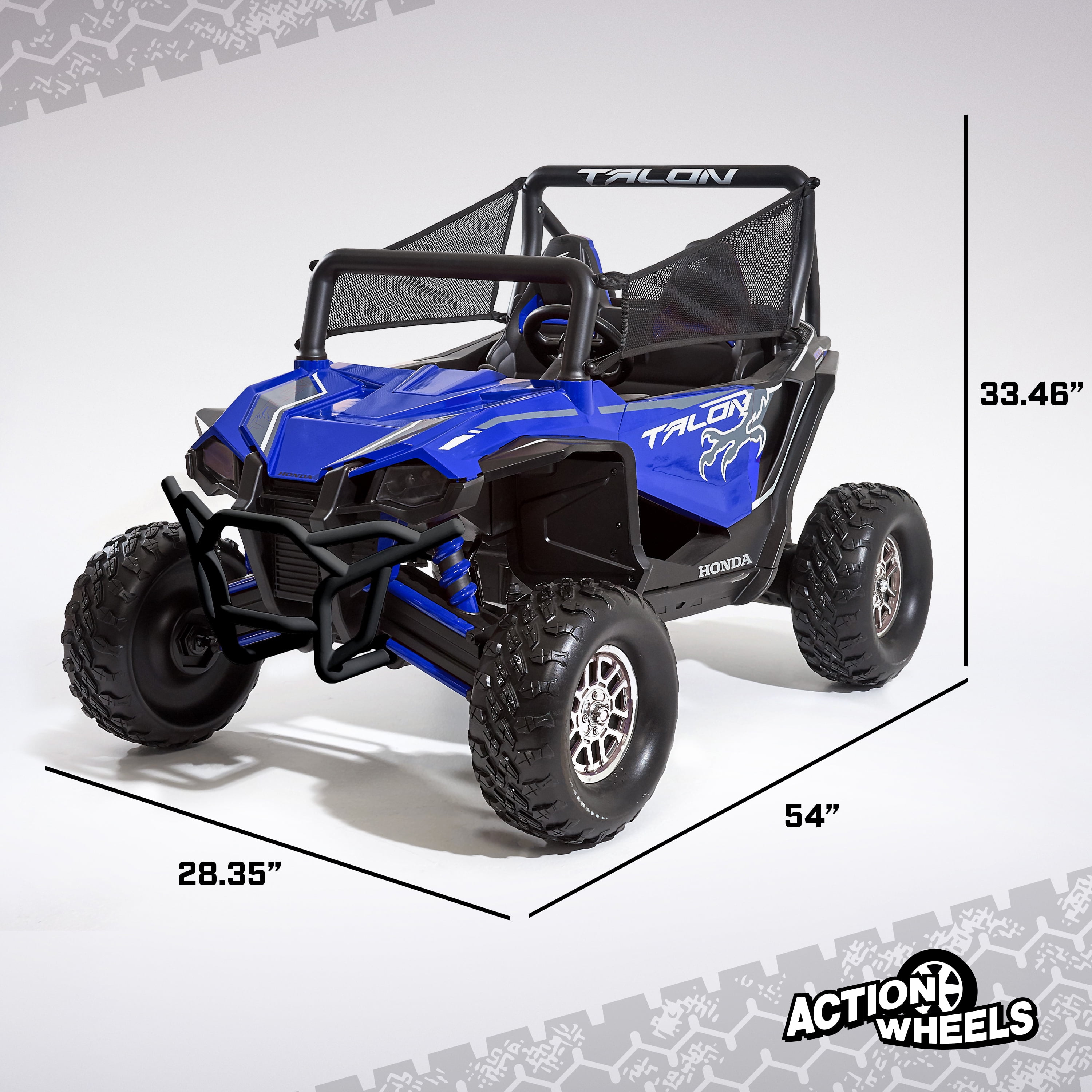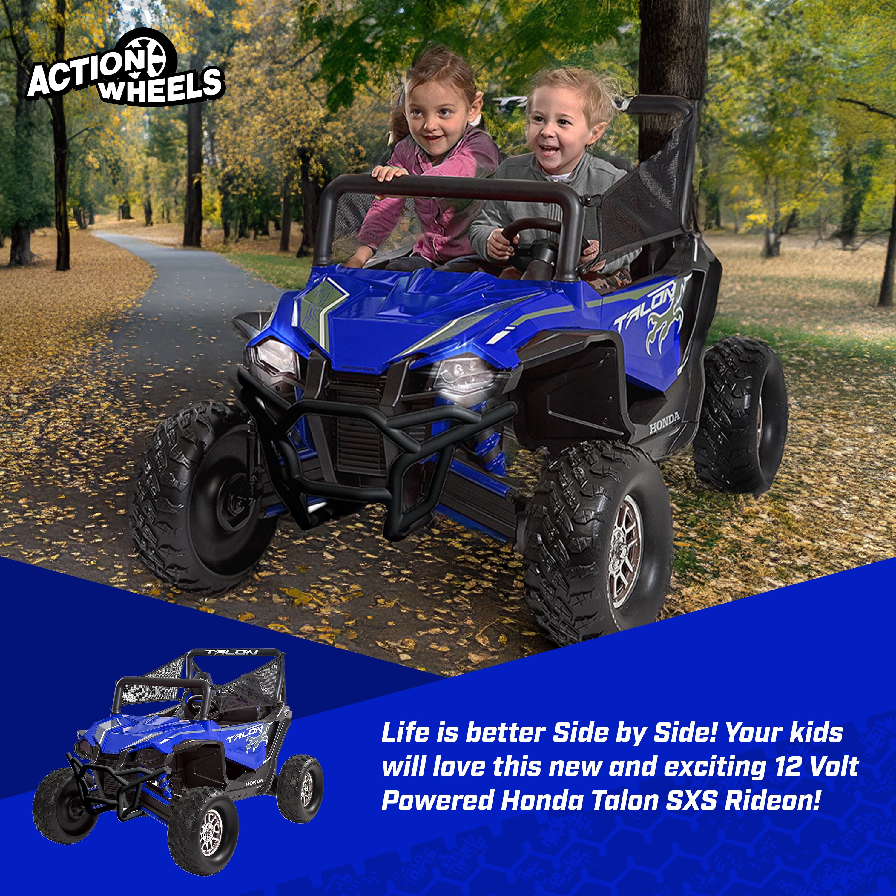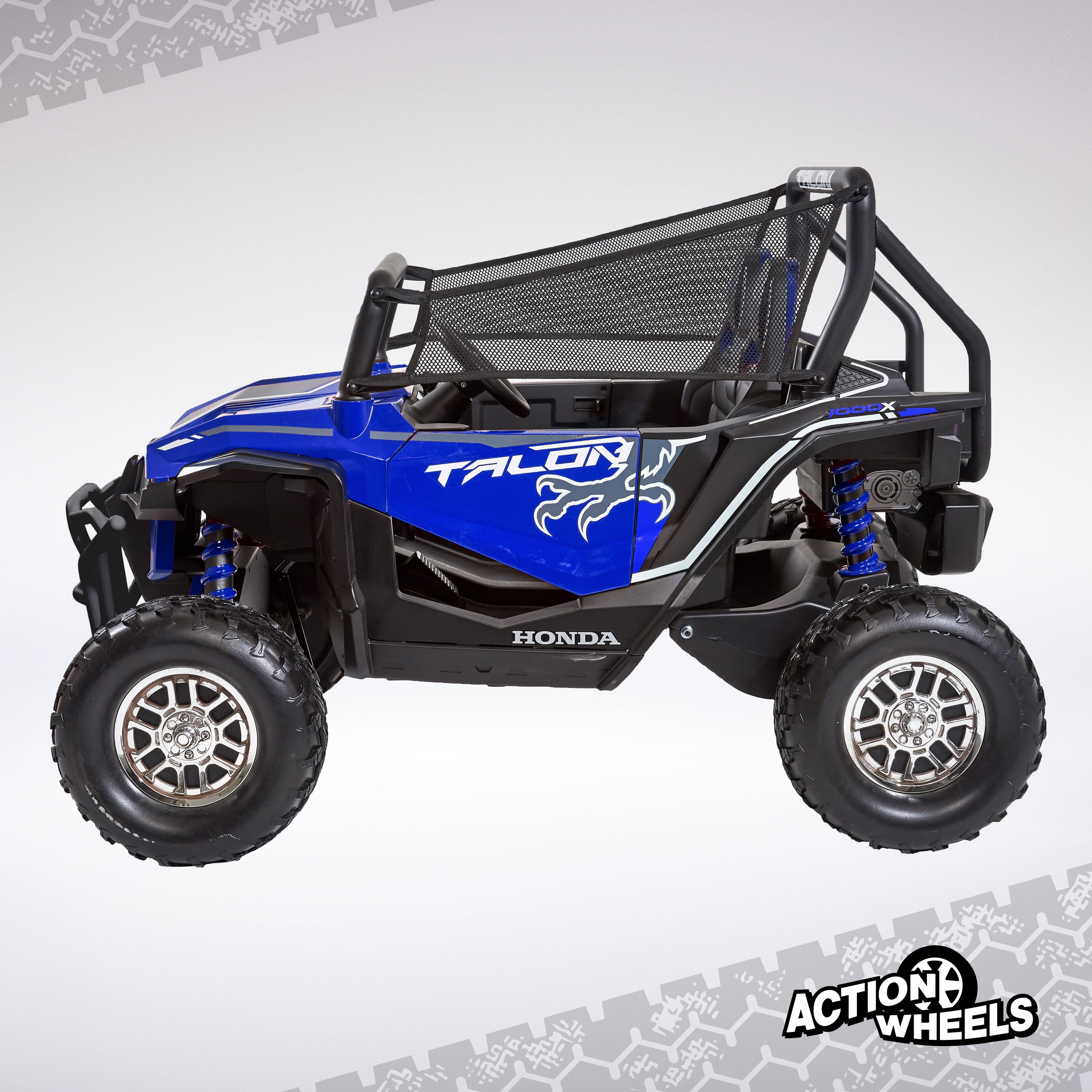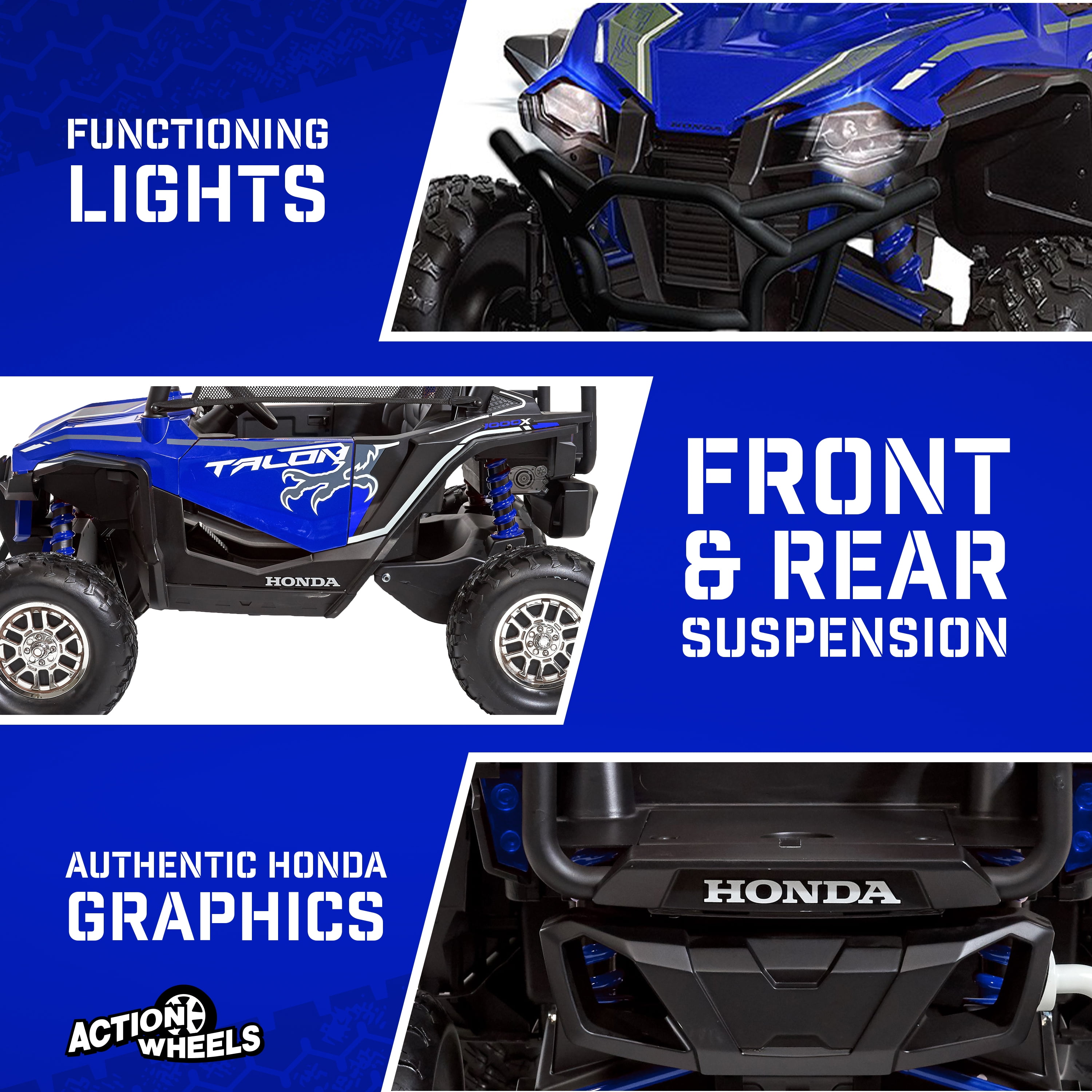 12V HONDA TALON SXS Authentic Startup sound and working horn Working headlights Front and rear suspension Fully functioning doors Forward and reverse with a max speed of 5 mph