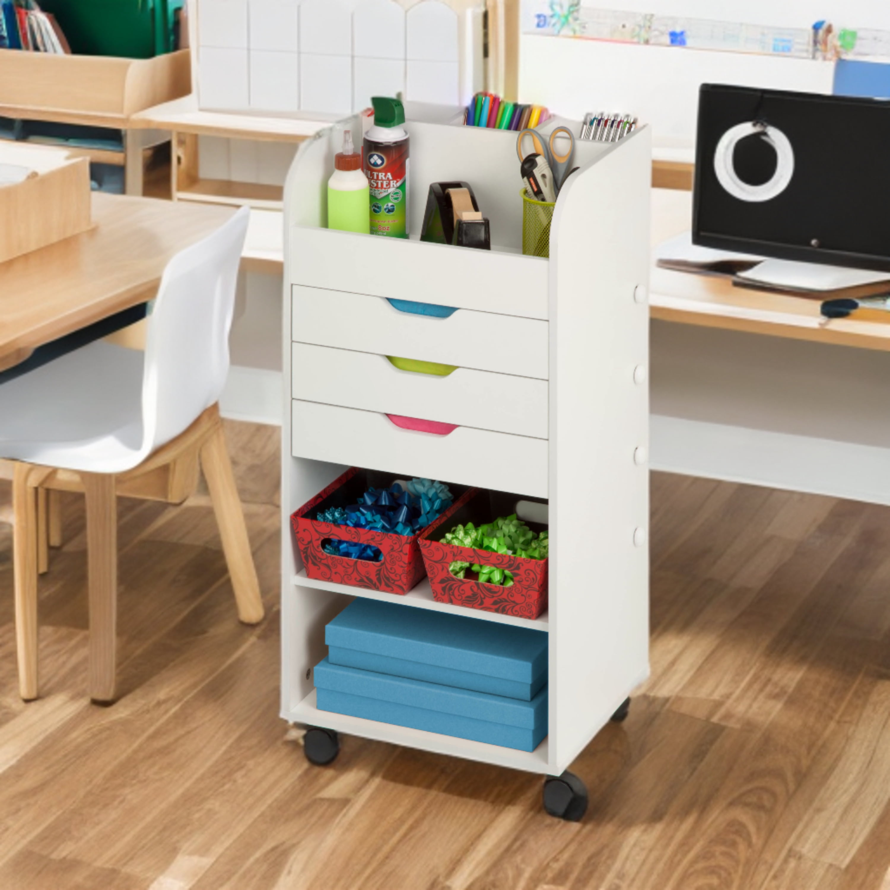 Stay organized and keep your crafting supplies in order with this versatile rolling storage cart. It features three spacious drawers for larger items, four dowels for hanging ribbon, and three shelves for additional storage. The top of the cart includes divided compartments to neatly store smaller tools like scissors, glue, and markers. Designed with four smooth-rolling wheels, this cart easily moves from room to room, so you can craft wherever inspiration strikes. Perfect for organizing all your crafting essentials in one convenient and mobile unit!