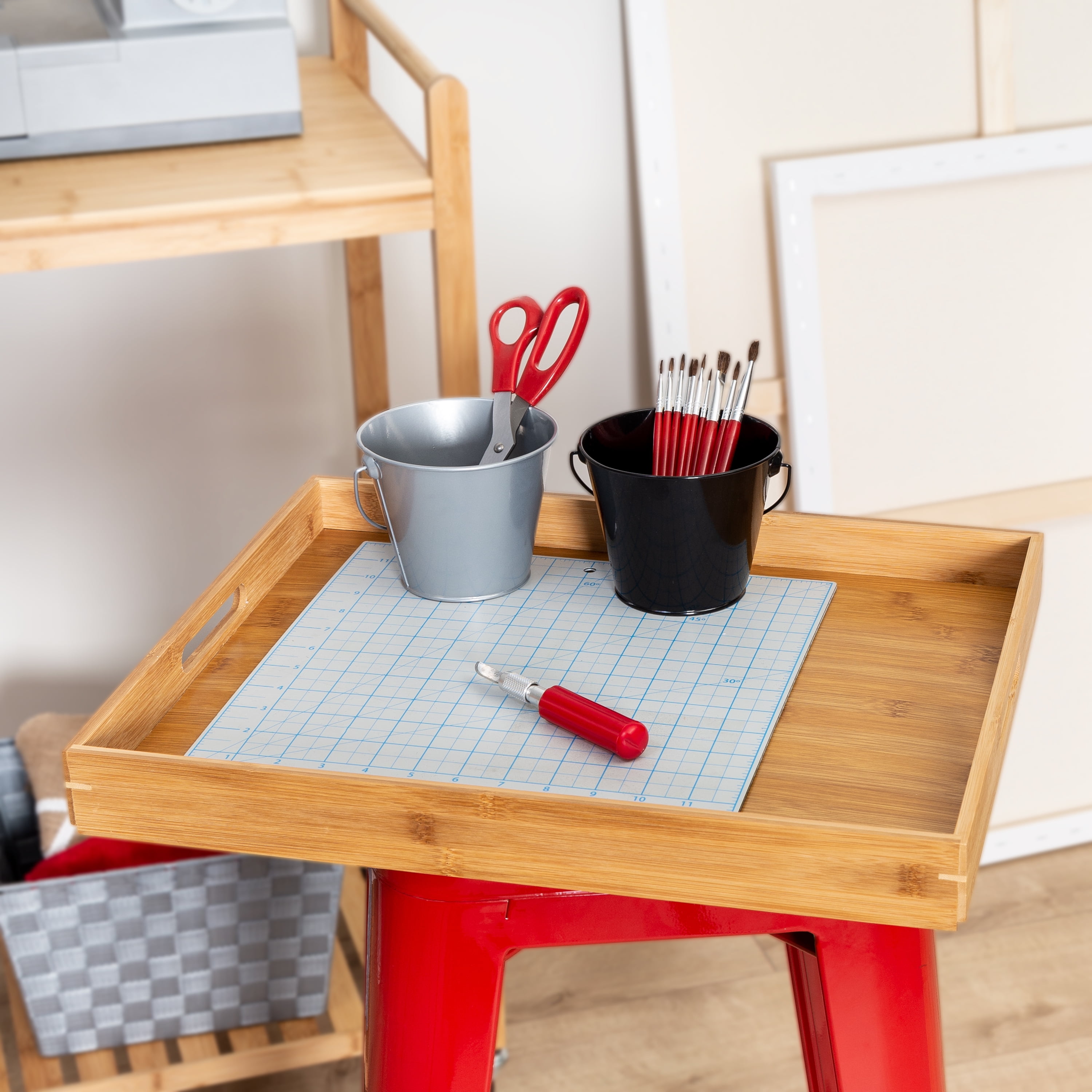 Features drop-leaf table for compact spaces Offers removable serving tray for versatile use Designed with heavy-duty casters (2 locking) for mobility and stability Bottom shelf is perfect for additional storage Made of sustainable bamboo Dimensions: 22.13” W x 14.96” D x 37.99” H Length of drop-leaf board: 12″ Tray Dimensions: 21″ W x 14.96″ D x 2.5″ H Honey-Can-Do CRT-08453