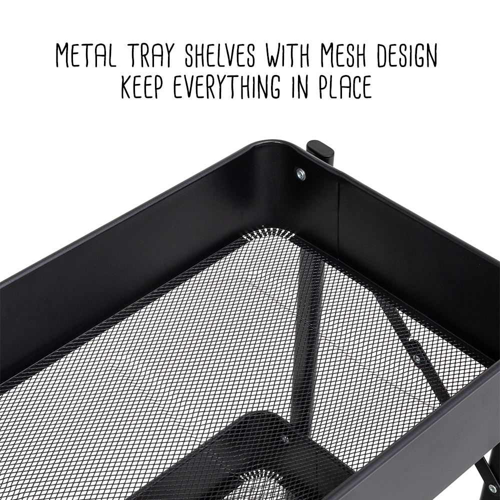 Black metal collapsible storage cart on wheels Folds flat for easy storage Locking caster wheels prevent unwanted movement Metal tray shelves with mesh design keep everything in place when the cart is in motion Right out of the box, it is almost ready to roll with no heavy assembly—just attach the four wheels and pop open Can be used as a utility cart, bar cart, craft cart, laundry cart, kitchen cart, and more. It will organize everywhere from your bathroom to home office Dimensions: 16.9″ W x 11″ D x 31.3″ H Honey-Can-Do CRT-09584