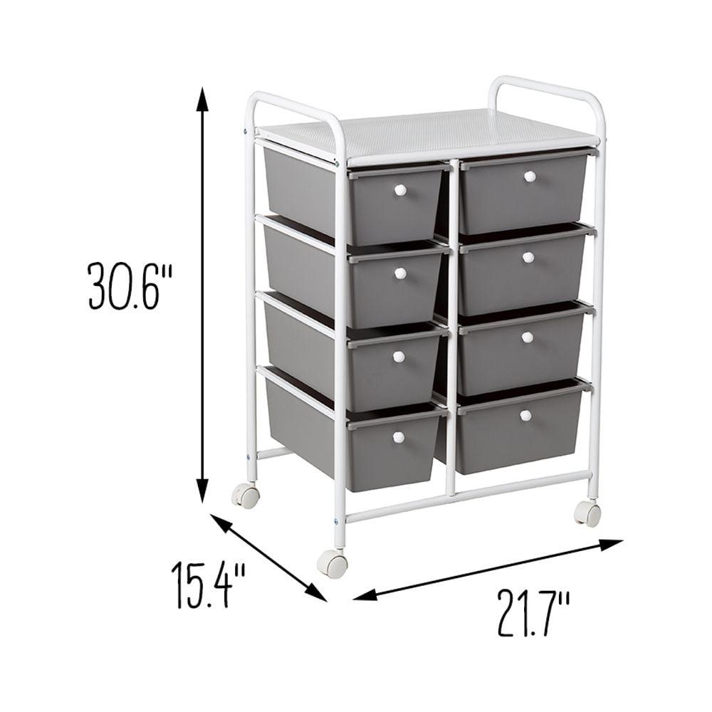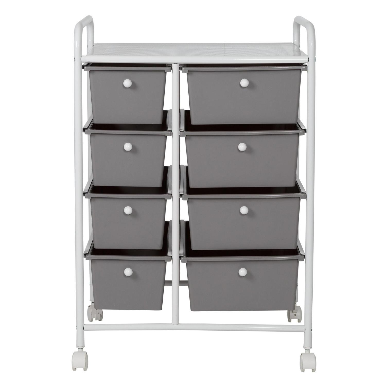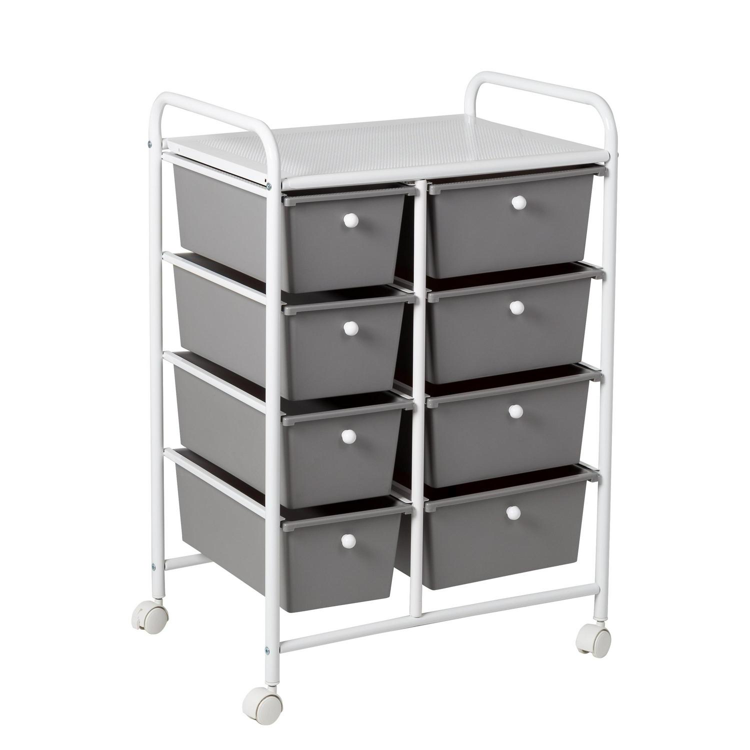 When used at the home office even if that means your kitchen table this rolling cart instantly becomes the CEO of organization with its 8 gray plastic drawers fitted with contrasting white knobs. These spacious drawers are ready to stash away everything from paperwork to pencils. At the same time, the vented metal top provides an extra workspace that is perfect for laptops. Wheel this gray and white drawer unit into the bathroom and you will be equally as impressed. The coated metal frame and plastic drawers can easily stand up to moisture while keeping all of your makeup and bathroom accessories organized. Have a spill in a drawer They are easy to wipe clean with their smooth surface, making them a home run for craft rooms and bathrooms alike. This rolling storage cart with plastic drawers is a must if you re looking to add more function and organization to your home.