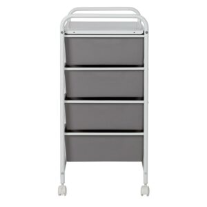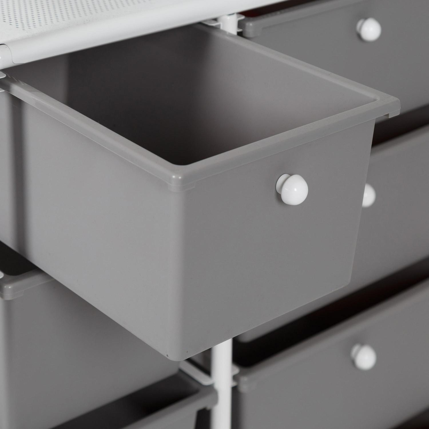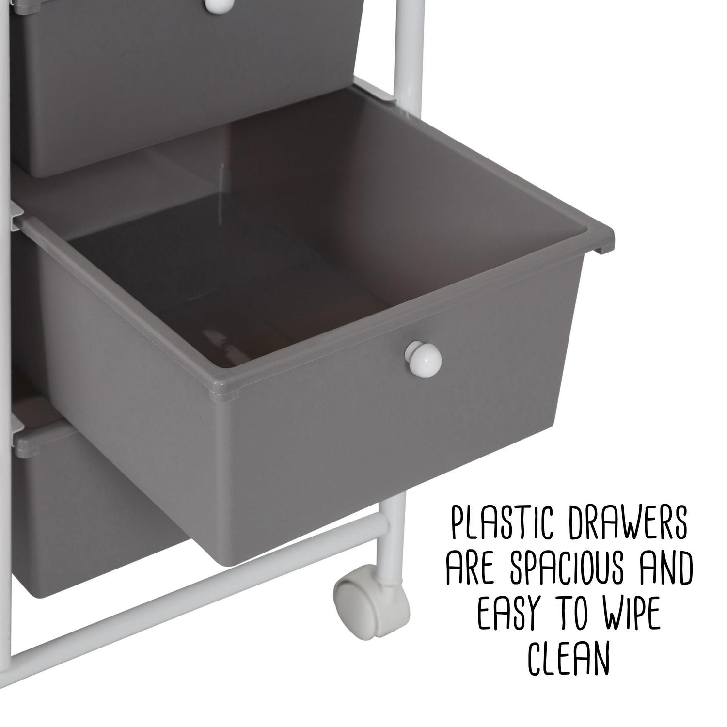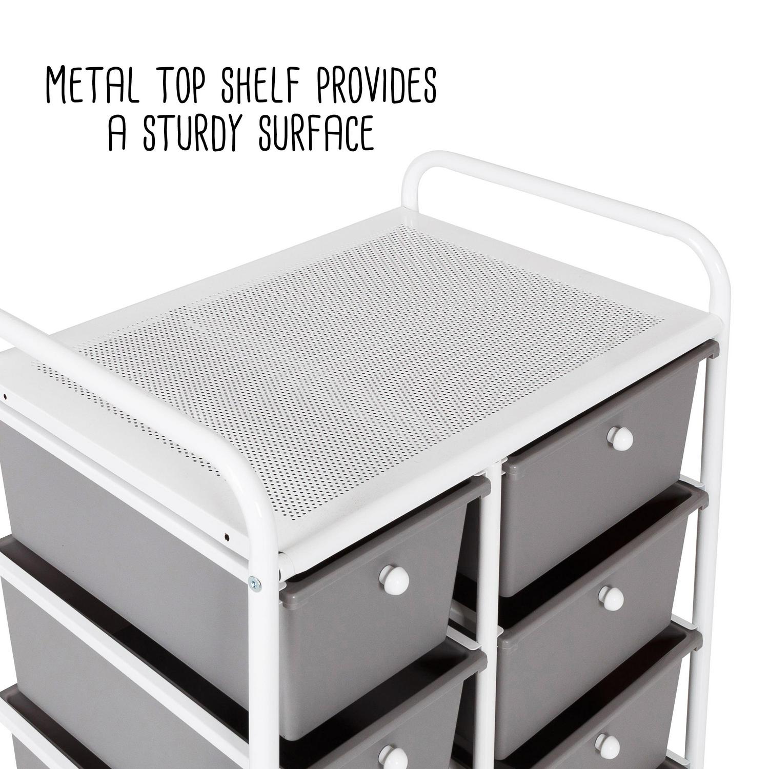 When used at the home office even if that means your kitchen table this rolling cart instantly becomes the CEO of organization with its 8 gray plastic drawers fitted with contrasting white knobs. These spacious drawers are ready to stash away everything from paperwork to pencils. At the same time, the vented metal top provides an extra workspace that is perfect for laptops. Wheel this gray and white drawer unit into the bathroom and you will be equally as impressed. The coated metal frame and plastic drawers can easily stand up to moisture while keeping all of your makeup and bathroom accessories organized. Have a spill in a drawer They are easy to wipe clean with their smooth surface, making them a home run for craft rooms and bathrooms alike. This rolling storage cart with plastic drawers is a must if you re looking to add more function and organization to your home.