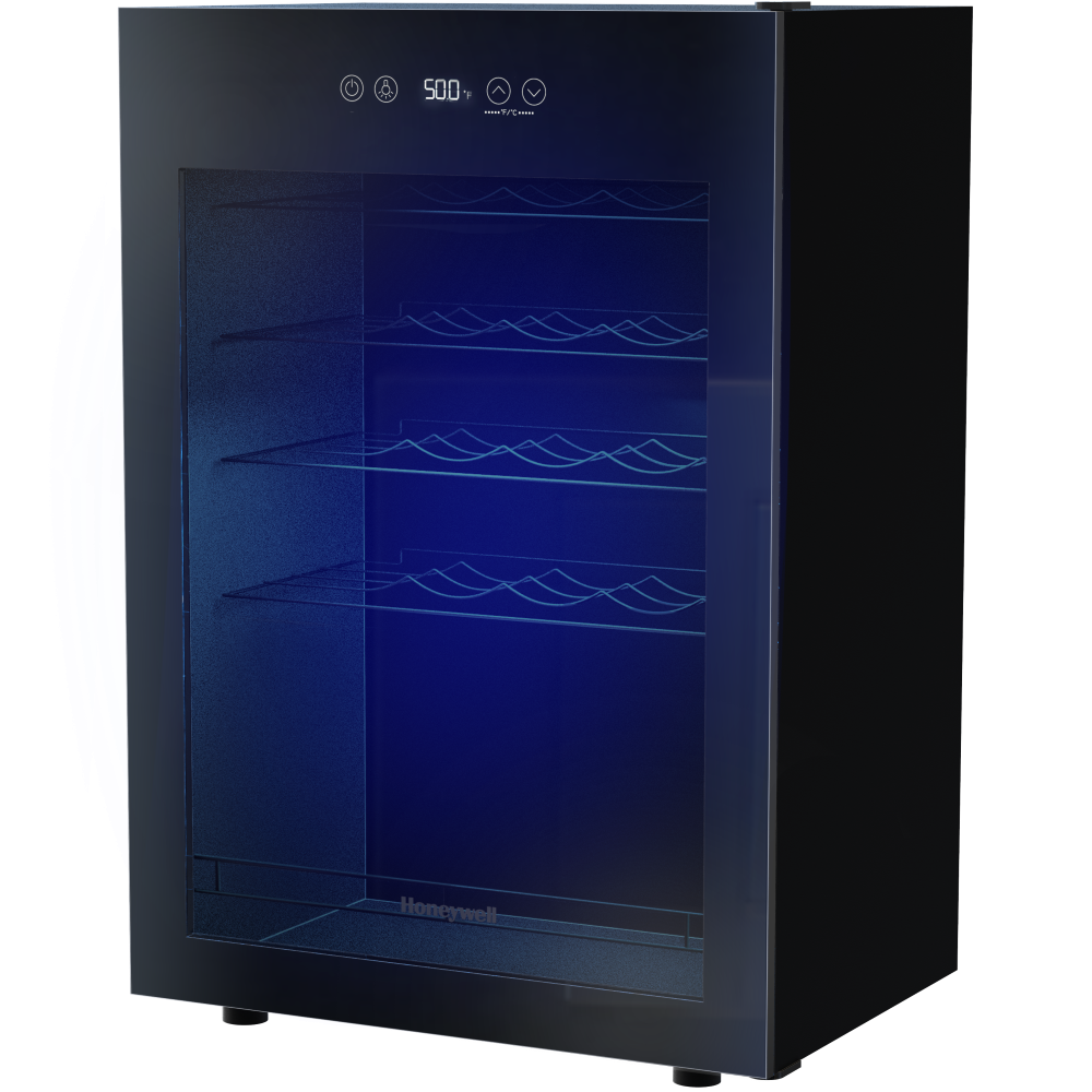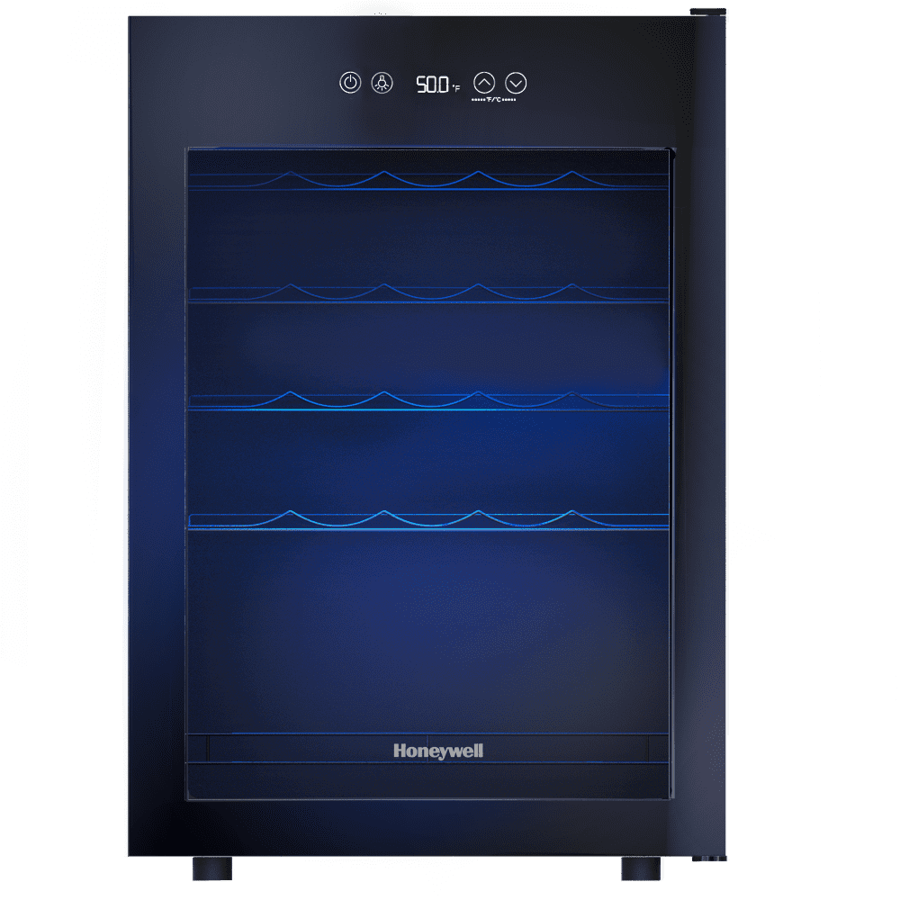 Honeywell 24 bottle wine cooler has an adjustable digital thermostat, glass door, recessed door handle, and slide-out chrome shelves. UL and CSA Listed. The dimensions are 18.9 in. x 17.3 in. x 26.3 in.