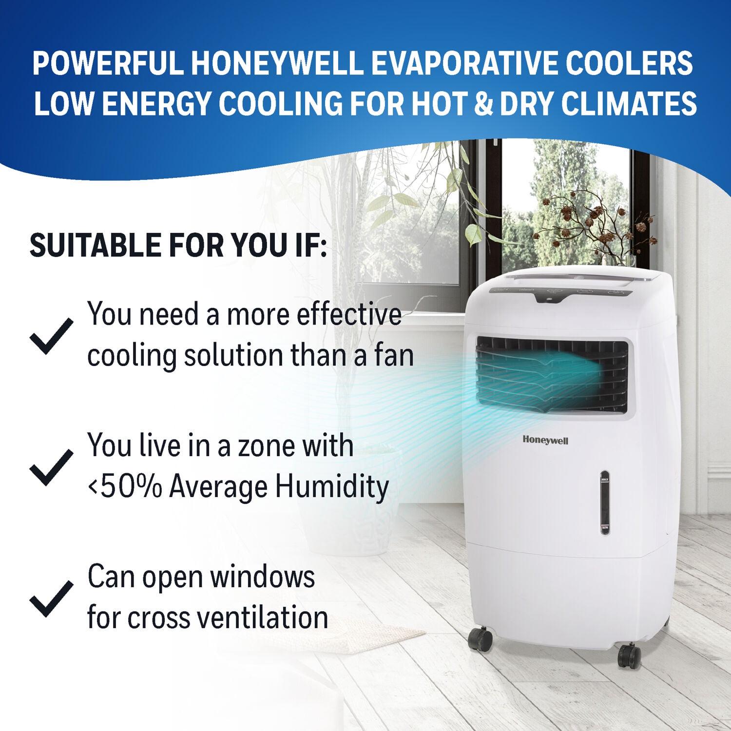 The Honeywell 500 CFM indoor evaporative air cooler offers an energy-efficient cooling option when the air is hot with low humidity, such as desert areas like the southwestern United States (recommended humidity level is 60% or less for maximum efficiency). Honeywell evaporative air coolers do not require power-hungry components like compressors. The low power consumption (only 235 watts) translates into significant savings on energy bills compared to using air conditioners. Just unpack, add water/ice, a place near open door or window, plug it in, and use. This unit is ideal for indoor use in open environments with adequate cross ventilation up to 300 square feet. Four fan speeds and oscillating louvers evenly distribute cool air through the honeycomb cooling media while the carbon dust filter cleanses the air. PLEASE NOTE: An Evaporative Air Cooler does not use a compressor or refrigerant gas, so it should not be expected to cool to the same degree as a refrigerated air conditioner.