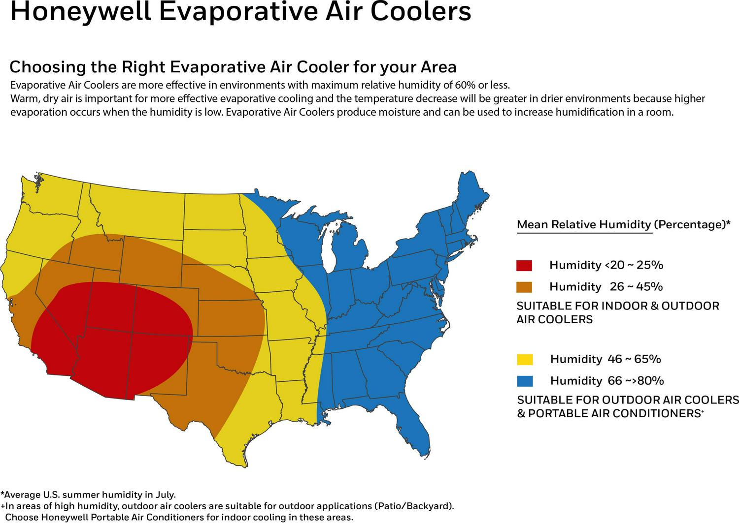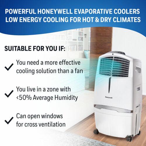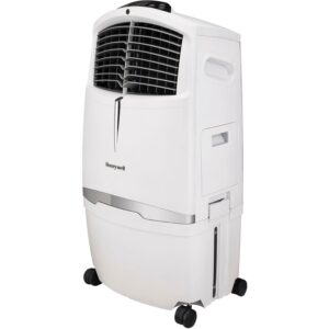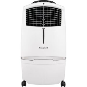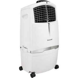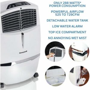 The Honeywell 525 CFM indoor evaporative air cooler offers an energy efficient cooling option when the air is hot with low humidity, such as desert areas like the southwestern United States (recommended humidity level is 60% or less for maximum efficiency). Honeywell evaporative air coolers do not require power hungry components like compressors. The low power consumption (only 288 watts) translates into significant savings on energy bills compared to using air conditioners. Just unpack, add water/ice, place near open door or window, plug it in, and use. This unit is ideal for indoor use in open environments with adequate cross ventilation up to 320 square feet. Four fan speeds and oscillating louvers evenly distribute cool air through the honeycomb cooling media while the carbon dust filter cleanses the air. For those living in more humid climates, consider portable air conditioning units or window air conditioners.