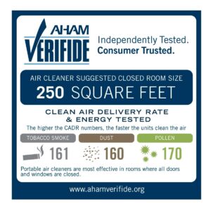 – Independently tested and AHAM Verifide to circulate and filter room air up to 4.8x per hour**