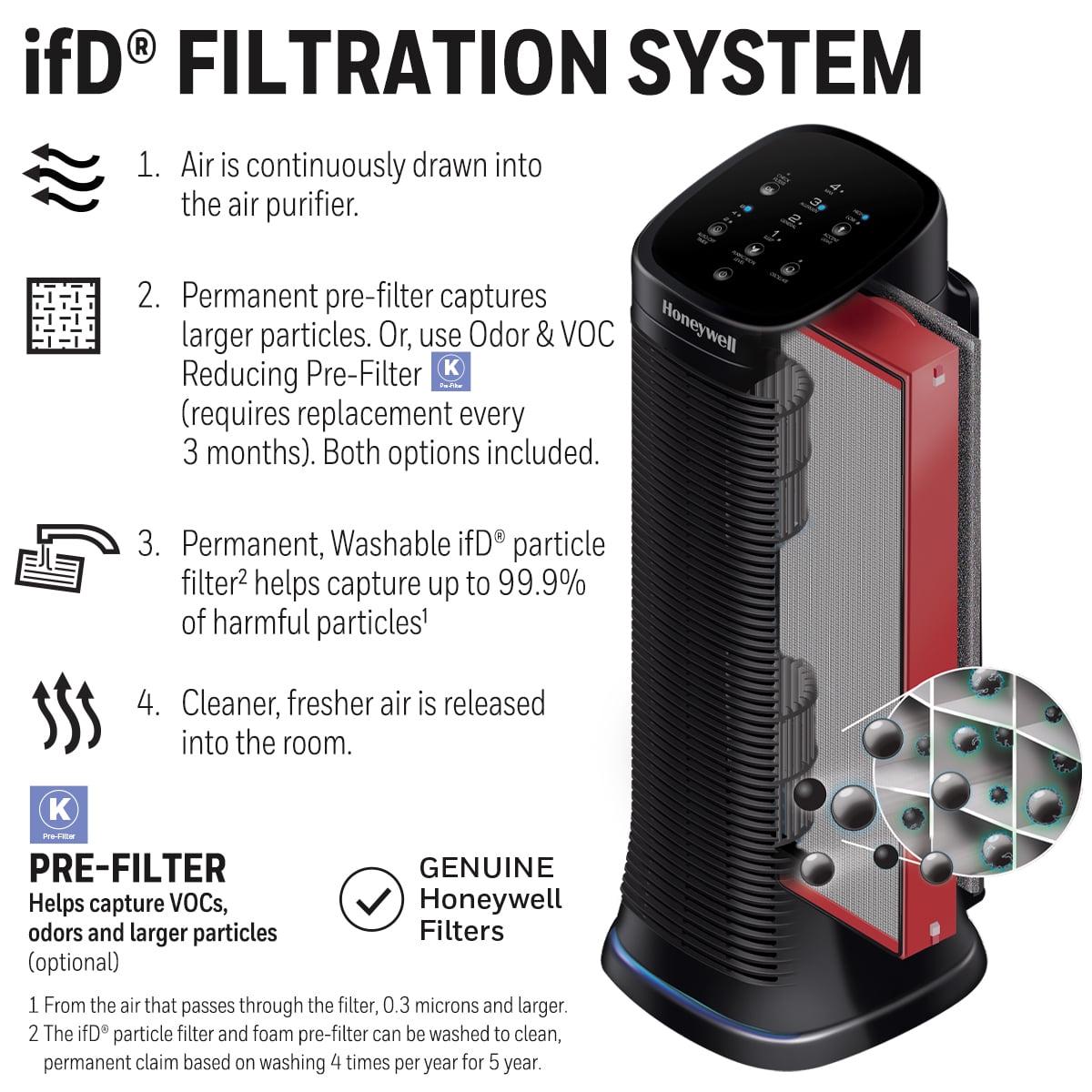 The Honeywell Air Genius 4 Compact Air Purifier features 4 levels of cleaning power and a patented ifD advanced filtration system that provides exceptional air cleaning performance for medium rooms of 250 square feet. The patented ifD technology uses electrical power to help capture up to 99.9% of the following microscopic airborne particles: dust, pollen, pet dander, dust mite debris and smoke.1 As air exits the purifier, molecules are charged to create ions which attach to these particles floating in the room. Those particles get pulled back into the air purifier and pass into the electrically charged ifD filter that is permanent and washable.