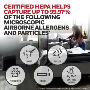 – HEPA Filtration: helps capture up to 99.97% of the following microscopic airborne allergens* and particles: dust, pollen, pet dander, dust mite debris and smoke¹