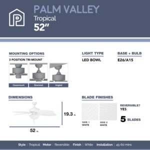 The Palm Valley brings a unique spin to the traditional tropical look, that is compatible with a variety of styles, ultimately brought by its soft white finish. Honing in on a crisp look with tropical accents, the Palm Valley is the perfect indoor/outdoor companion. Featuring beautiful white palm leaf blades, the curvature and perfectly rounded edges found throughout the Palm Valley is believed to be its most alluring aspect. The frosted finish on the bowl light allows adds just the right amount of illumination, while carrying a simple, more refined aesthetic. Whether it s above the patio, accenting your living room or being showcased on the front porch, this fan will give you the complete crisp, tropical look you ve been waiting for!