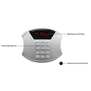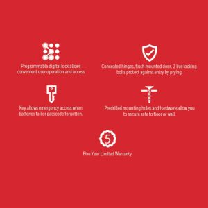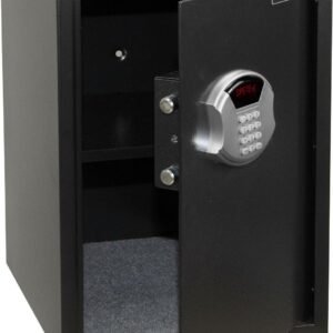 – Black finish steel construction with digital lock with LED display. 2.8 cubic feet interior storage capacity. 2 live steel locking bolts.