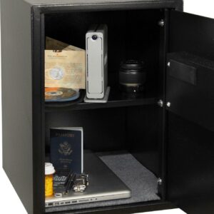 Protect your most valuable possessions from tampering & theft. Secure your valuables with the Honeywell Safes (5107) Steel Security Safe installed at your home or office. This safe is designed to keep your possessions protected in the event of any theft. A reliable electronic keypad locking mechanism helps to keep the contents safe and sound at all times. This functional floor mounted safe is designed to make installation easy and provide exceptional protection against theft. Black finish steel construction with digital lock with LED display. Exterior dimensions: 21.7″H x 15″W x 18″D. Concealed hinges & recessed door. Interior Dimensions: 20.7″H x 14.8″W x 15.9″D Includes removable shelf. 2.8 cubic feet interior storage capacity. Weight: 55.7 lbs. Includes pre-drilled holes & mounting kit. Carpeted floor. 2 live steel locking bolts. 2 emergency override keys included. 4 “AA” batteries. 5-year mfr. limited warranty.