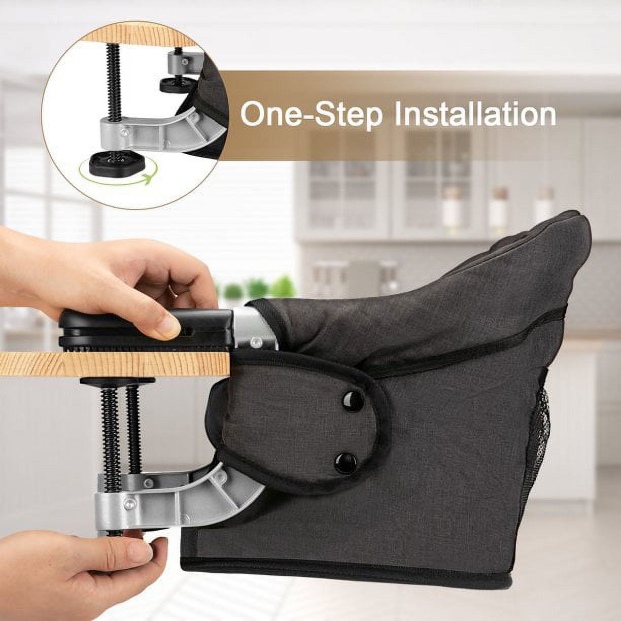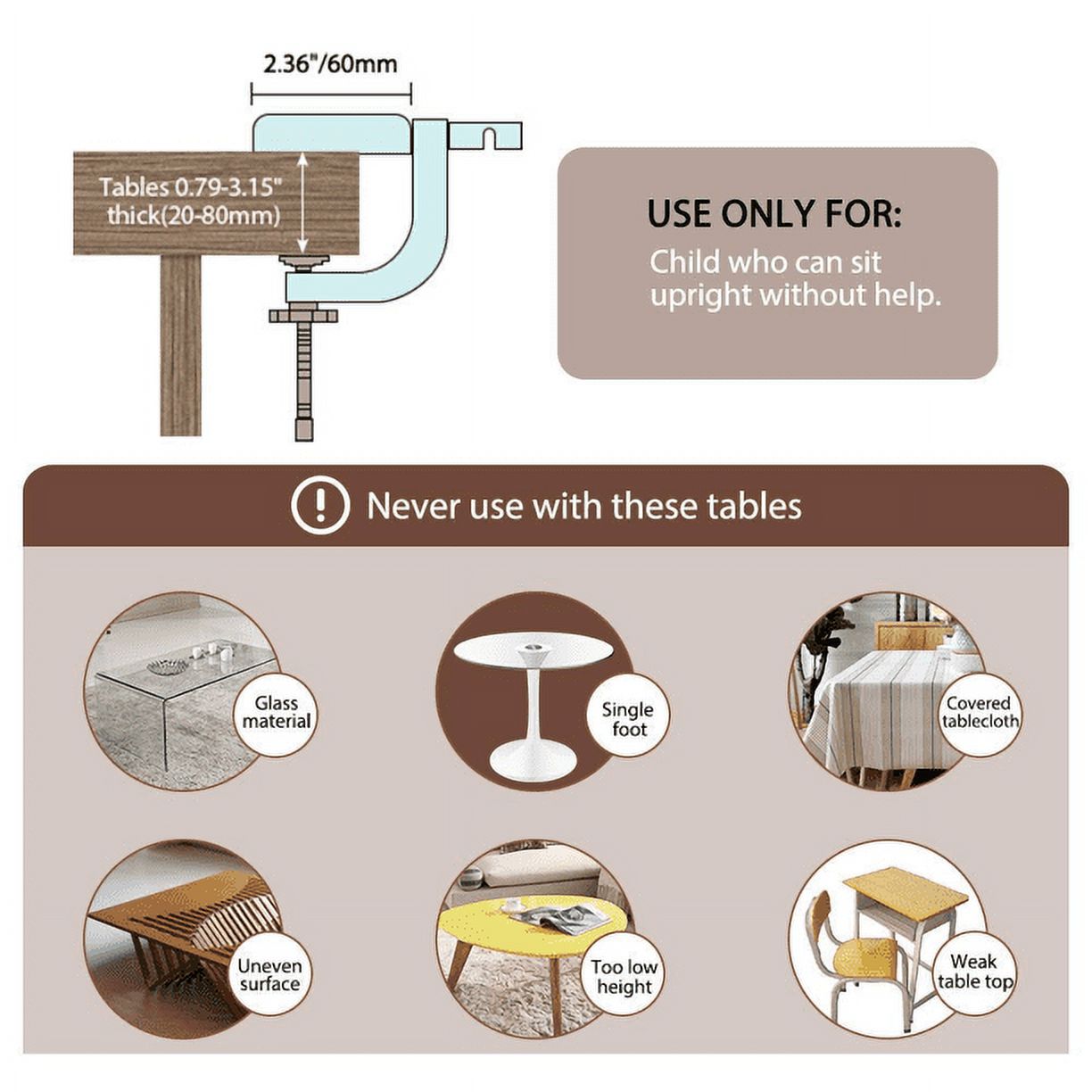Infant hook-on chair with tray: Our baby chair comes equipped with a convenient attachable/detachable dining tray, hassle-free in and out. When your little one grows, remove the tray and boost him up to the kitchen table to eat with the grownups! Compact fold for easy storage: The collapsible design makes this fast table chair easy to pack up, with a carrying bag, you can always take it with you when you are out or with your baby. Includes a rear storage pocket, where you can put small nursing items such as bibs and feeding bottles Fit for most tables and more stable: our baby high chair can be used for 0.79″ to 3.15″ thick (20mm-80mm). The baby feeding seat joins Non-slip soft plastic arms to protect tables from being scratched, precise and patented module parts ensure the chair can be easily tightened up and firmly fixed with a table Safety harness: Features harness belt to secure it in seconds, perfect to prevent falls and injuries. Ergonomically designed to keep even the most wiggly toddler in place and cozy Dirt-resistant and easy to clean: Babies are messy eaters! The detachable tray is BPA-free and dishwasher safe, so in addition to being easy to clean, it’s safe for your child. The chair covers are made of environmentally friendly fabrics, if you need to clean, slide the fabric cover off of the frame for washing