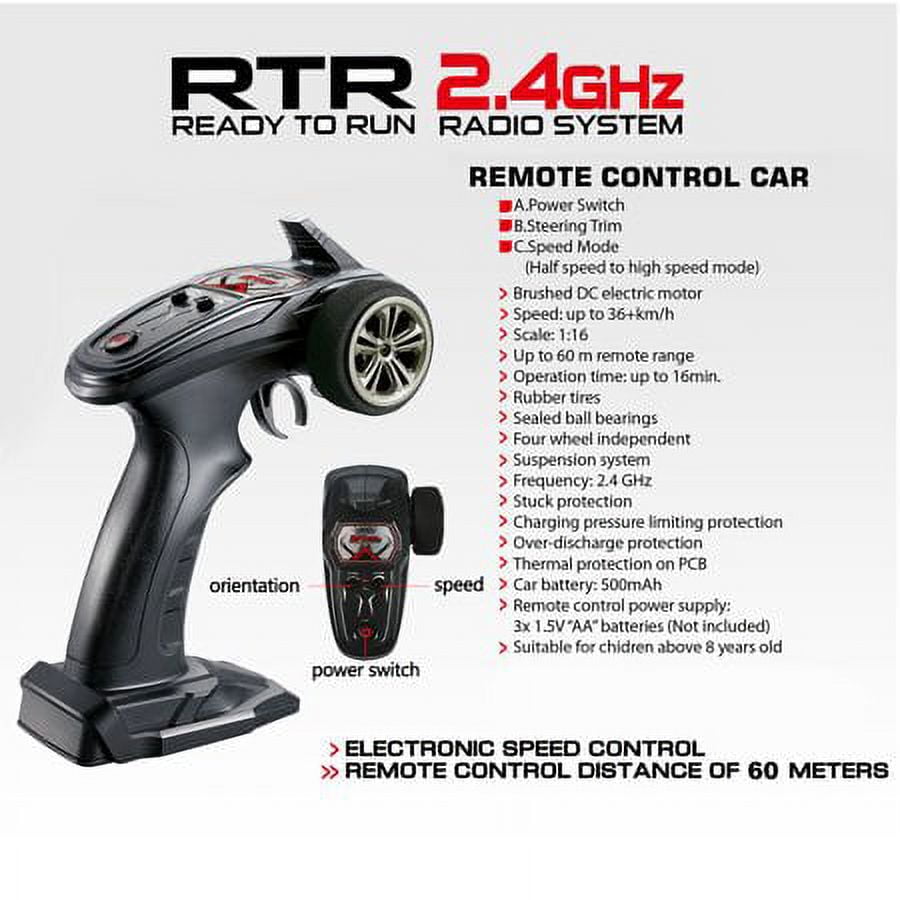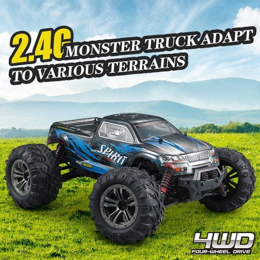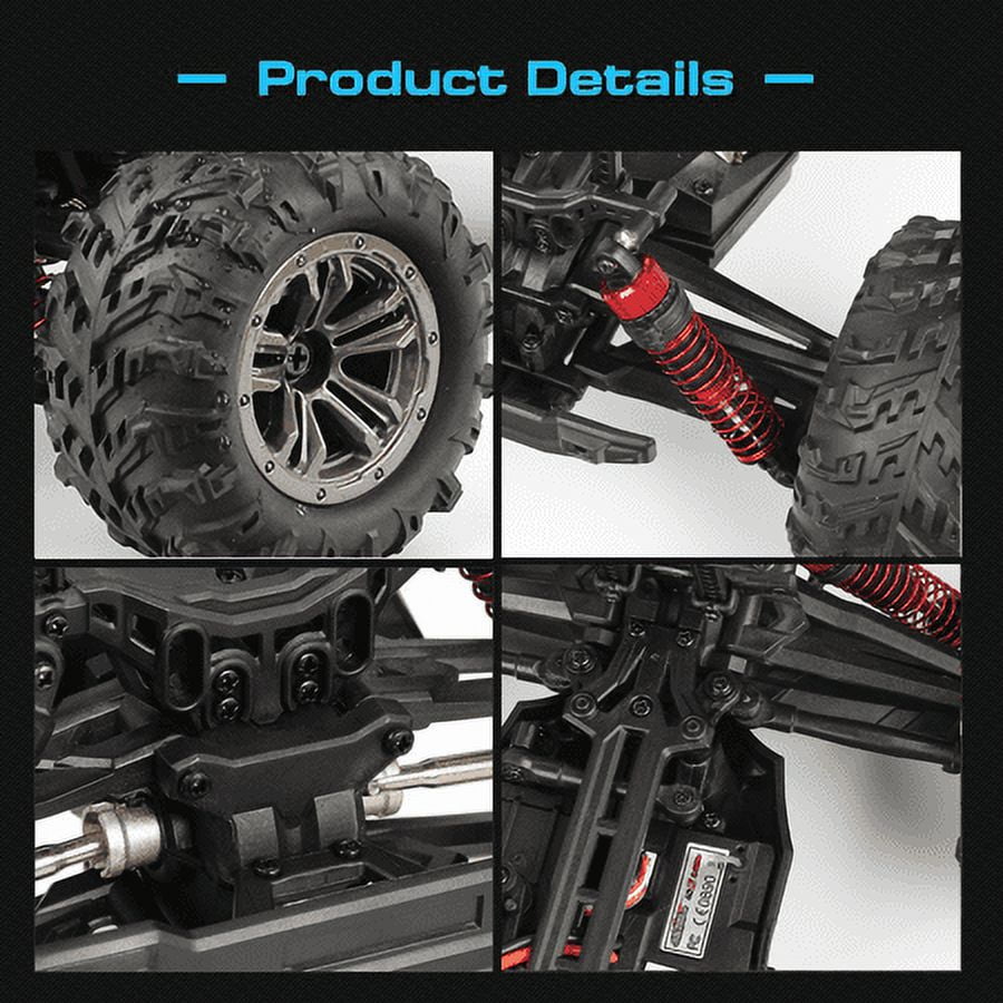 Fast Speed & Heavy Duty Wheels Comes with the aggressive tread of the strong grip tires, you can go both off-road and on-road environments with premium anti-skid heavy duty wheels. All Terrain & IPX4 Waterproof Feature This All Terrain RC Car has no problem going through the sand, grass,wet mud and marshy land, easy to finish and enjoy lots of difficult movement. With the semi-waterproof feature, allowing for play in any weather. Full Function Professional Steering Great off-road performance, strong and durable,perfect for specialized operation, like turn, drift, and flip,built for superior handling and control, Forward/Backward, Left/Right . Strong Shockproof Resistance Heavy duty wheels & Anti-shock Suspension System Due to its hollow rubber tire with shockproof gaskets, this 1:16 scale monster truck boasts extraordinary grip and operation. 4-Wheel Drive and All Metal Sealed Ball Bearing Four wheels are installed independent suspension spring let cross-country car body more flexible, easy and difficult, also played the shockproof function for the body to protect the electronic components inside the car body. 2.4Ghz Radio System and Long Remote Distance Work off 2.4GHz frequency with anti-jamming capability allows to race more than 10 cars at the same time, the same area and up to 80m/262ft remote control. Specifications Scale: 1:16 Speed: 36 Km/h Frequency: 2.4GHz Control Distance: 80m Running Time: About 16 mins at full speed Charging Time: 2.5 hrs Charger: USB Charger Motor: Strong magnetic carbon brush motor Truck Battery: 2 x 7.4V/1500mAh battery pack (included) Remote Battery: 3 x 1.5V AA battery (NOT included) Dual Batteries Connector Age Range: More than 8 Years old Protection: Stuck Protection, Thermal protection on PCB, Over-discharge protection Function: Forward, backward, turn left, turn right, drift, brake, can climb over obstructions. Package Included: 1x 1:16 Monster Truck 1x 2.4G Transmitter 2x 7.4V 500mAh Battery Pack 1x USB Charger 1x User Manual