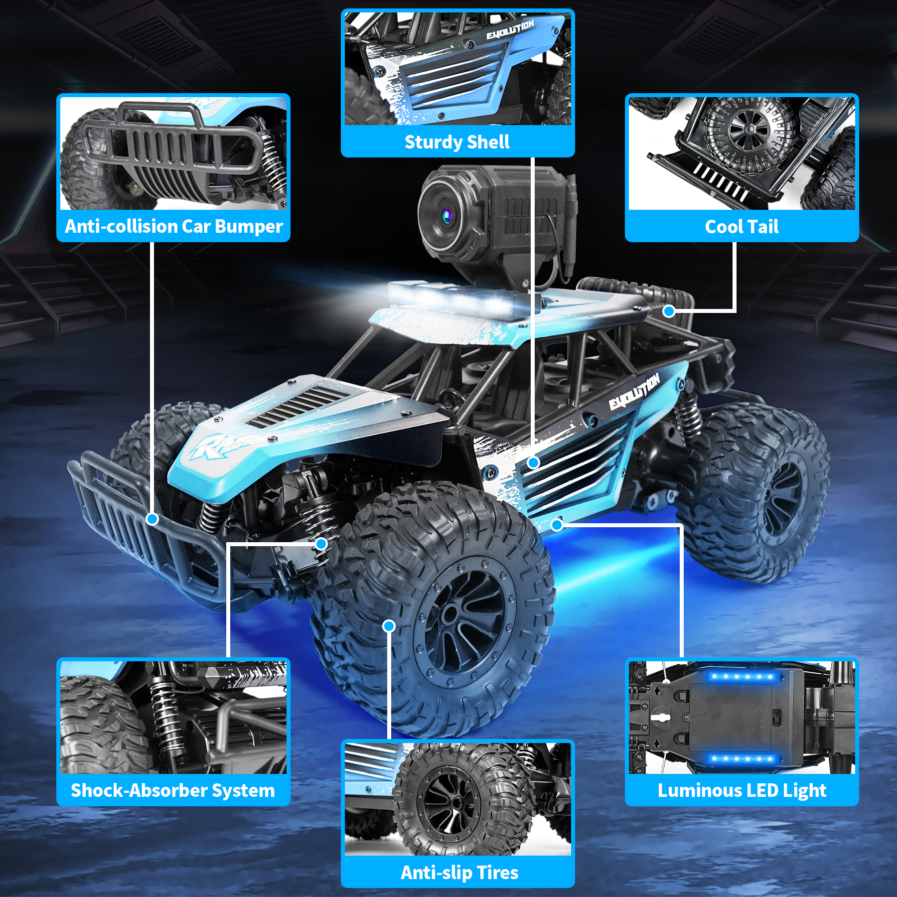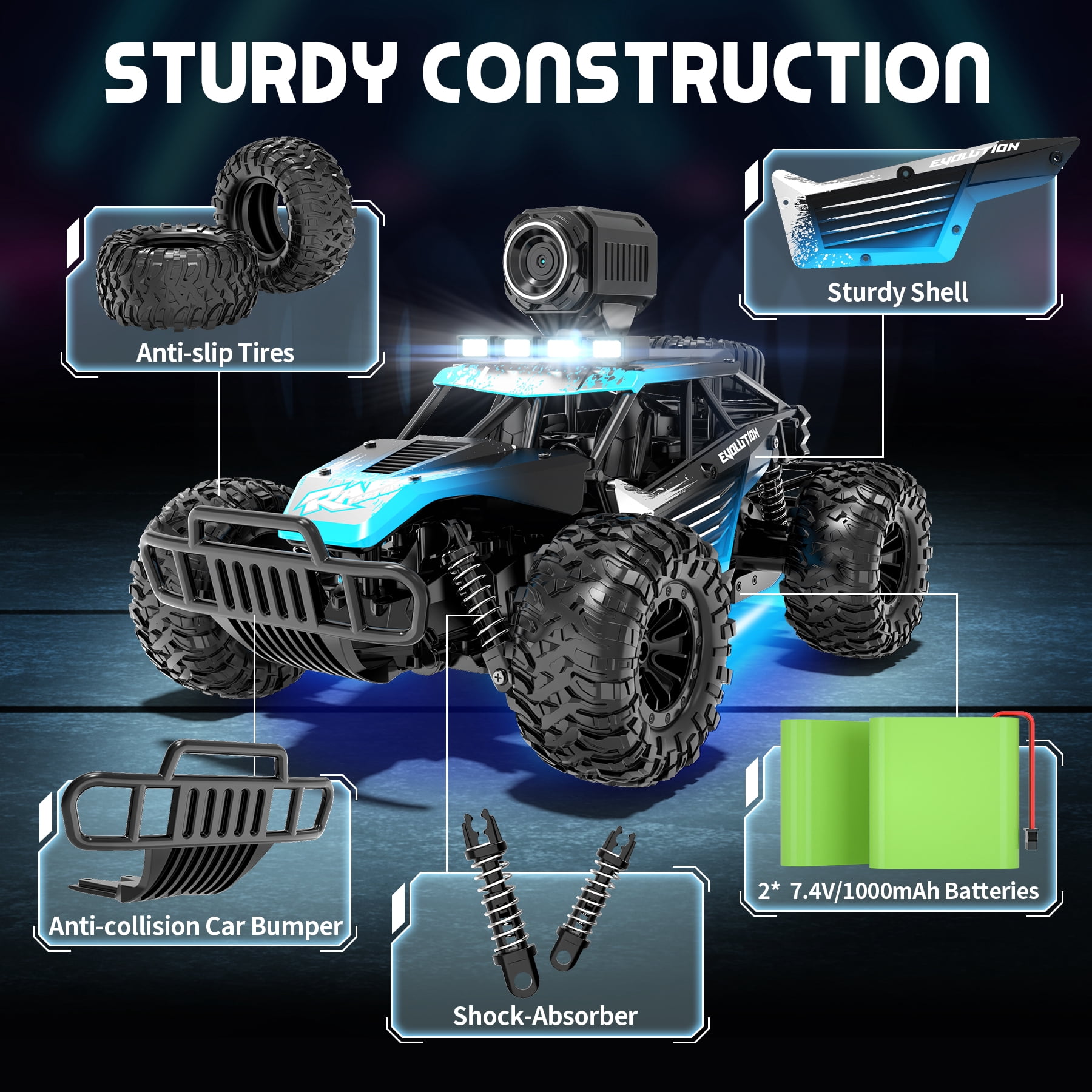 1080P HD FPV Camera Dual Remote Control Model PVC Rubber Wheels It’s soft, elastic, shock proof and antiskid to make you enjoy the Excellent Off-Road Performance 4 PCS Independent Suspension Spring It plays an anti-shock function for the body and protects the electronic components inside the body.