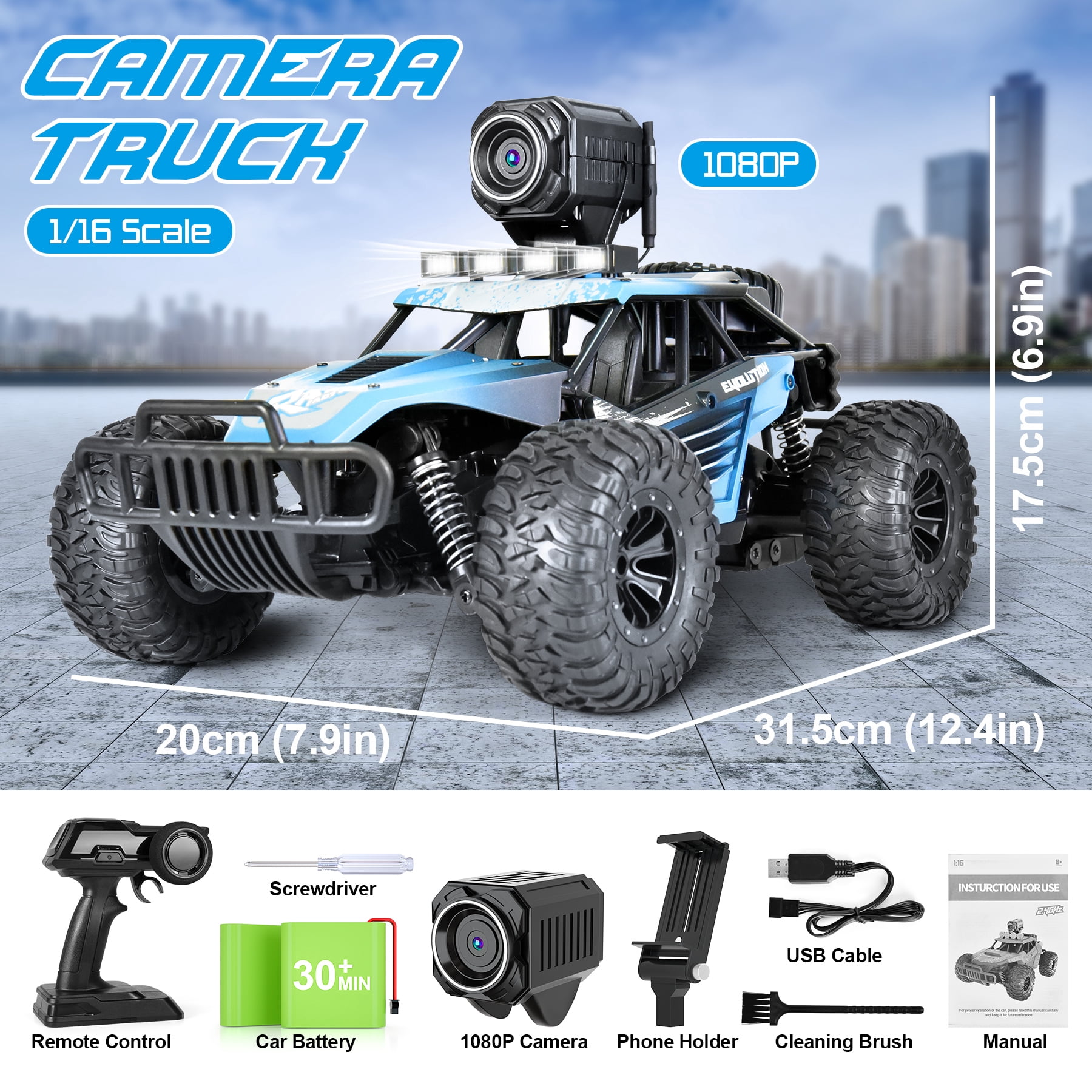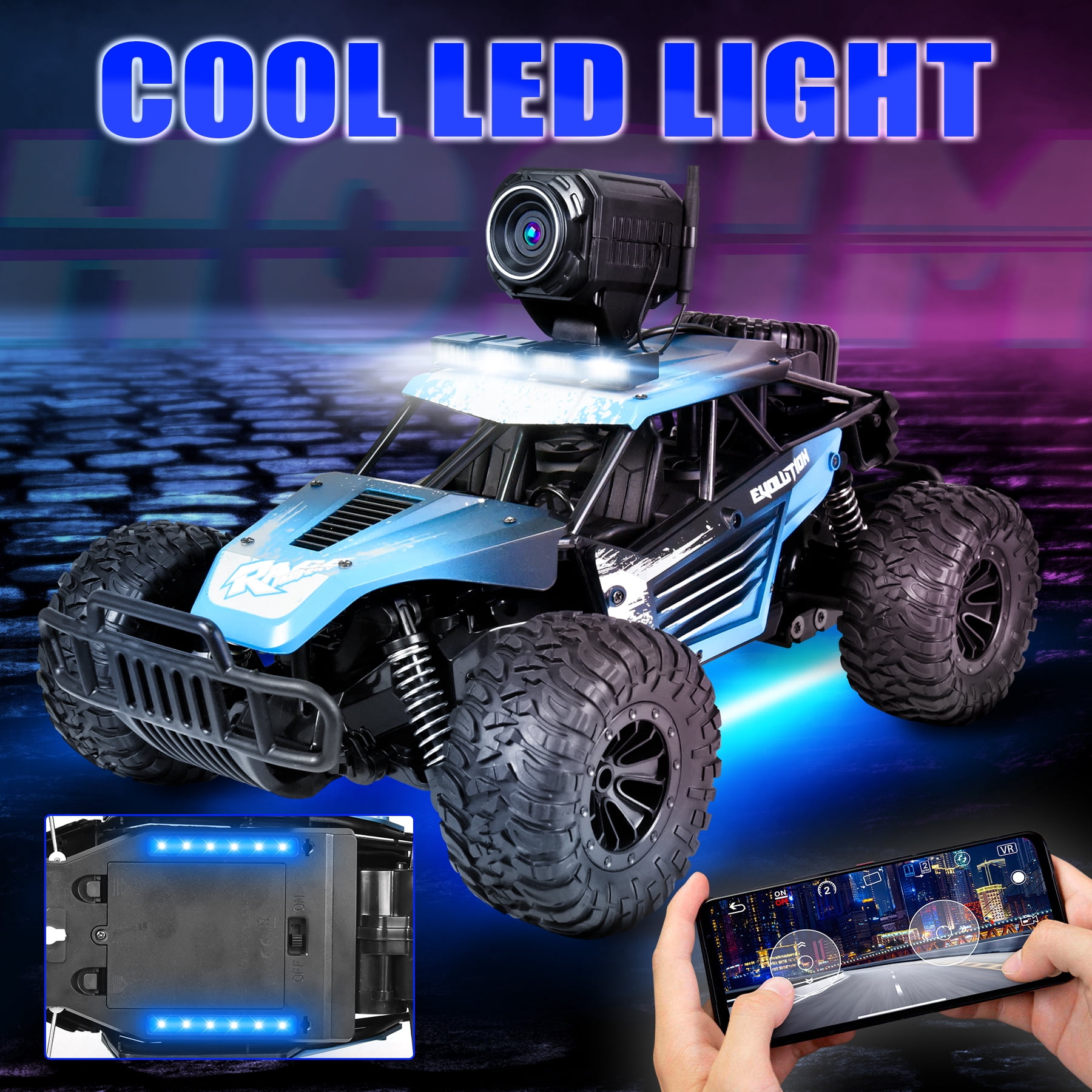 【1080P HD & 45°Adjustable Camera】The remote control car is equipped with 1080P HD wifi camera and 263FT real-time transmission, all the time, you can view clear photos and videos from phone APP. And 45°adjustable angle bringing you a different visual experience. Enjoy the good times for you and your family, friends. 【Dual Remote Control Mode】This rc car supports mobile phone APP remote control, so you can drive this truck with two modes: 2.4Ghz radio remote control( radio control range up to 165ft) amd Mobile phone App driving, it allows you racing them with your friends at the same time.And 1:16 full scale makes it more real. 【2 Packs Batteries & 60 Mins Running】The RC Car is equipped with TWO 7.4V 1000mAh hard case rechargeable batteries!it will be more powerful ,safer and durable. uniquely designed & constructed for high performance RC Racing. Increase the runtime of your RC unit with a battery that will go the distance! Speed is up to 15-20 KM/H with the two powerful motors. Enjoy in the exciting racing driving! 【Strong Shock Absorbers & Superior Build Design】This RC car comes with four independent suspension springs, advanced anti-skid tires, shock absorbers and anti-collision beam, high speed throttle response ,sensitive steering , this can be very effective in preventing the car from crash resulting in unnecessary damage. 【Various Terrains High Performance Gift Car】】With 1:16 scale big size and it made of safety, non-toxic, anti- collision and anti-impact material.you can go various terrains like road, highway, shallow sand and mud. The truck can be played on at any occasion, such as party, travel etc. Easy to play and fun for indoor and outdoor. A great gift for all ages of children and adults.