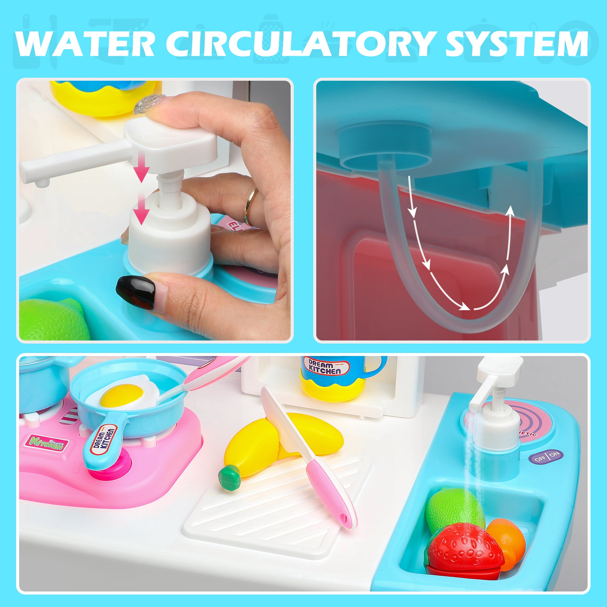 VARIETY OF ACCESSORIES: The set comes with a variety of accessories, including play food and utensils, all beautifully designed and made to last. REALISTIC FEATURES: The kitchen features a fridge, oven, and cupboard, as well as a gas stove with realistic cooking sounds and lights. There’s even a sink with running water that recycles back into the system, making it easy for kids to wash their play food and utensils. EDUCATIONAL VALUE: This play kitchen set is not only fun but also educational, promoting fine motor skills, role-playing, language skills, and critical thinking. CREATIVITY AND IMAGINATION: Kids can exercise their creativity by pretending to cook and tell stories, while also developing social skills by playing with others. PERFECT GIFT: The Hot Bee Play Kitchen Toy Set is the perfect gift for little chefs, encouraging them to learn and play in a safe and fun way.