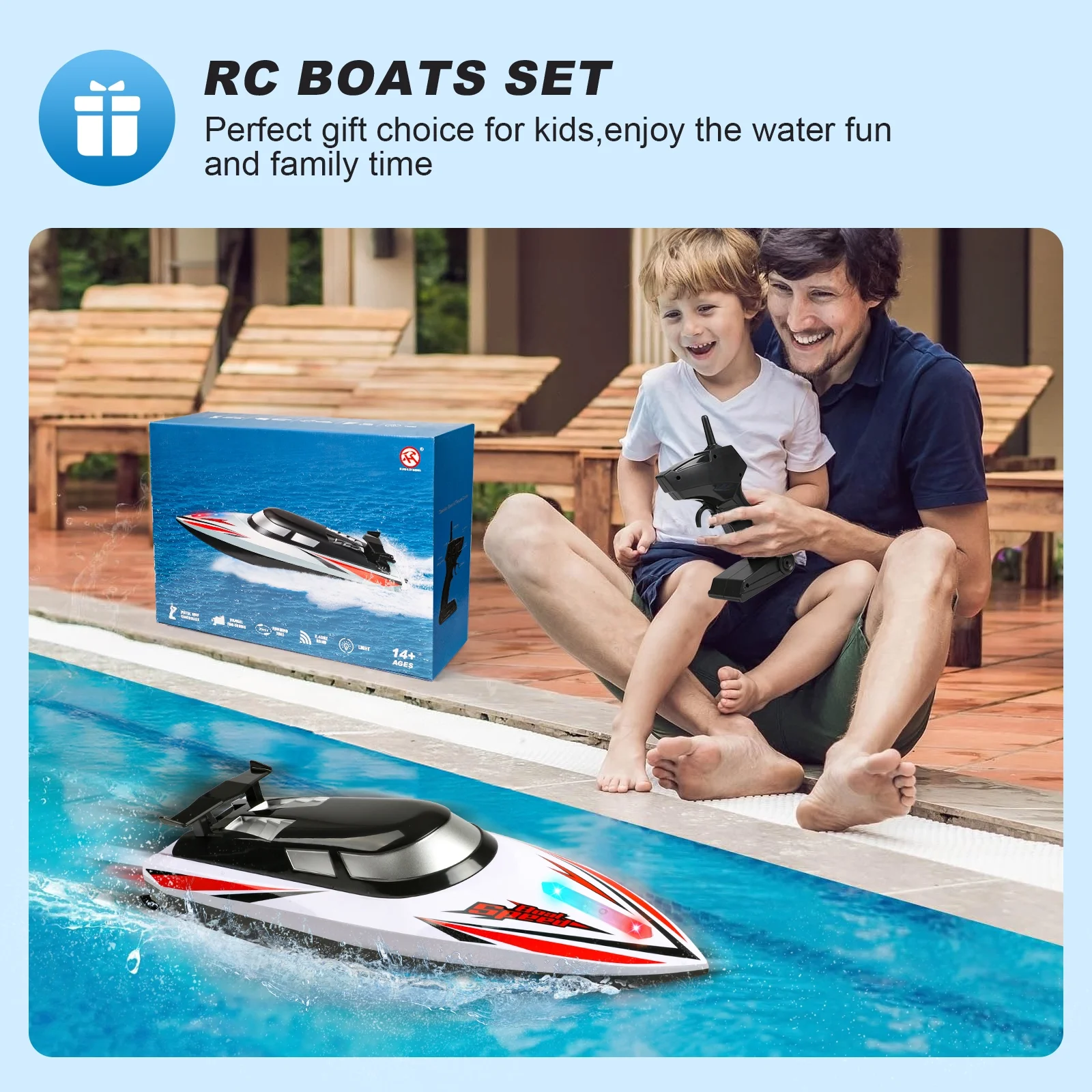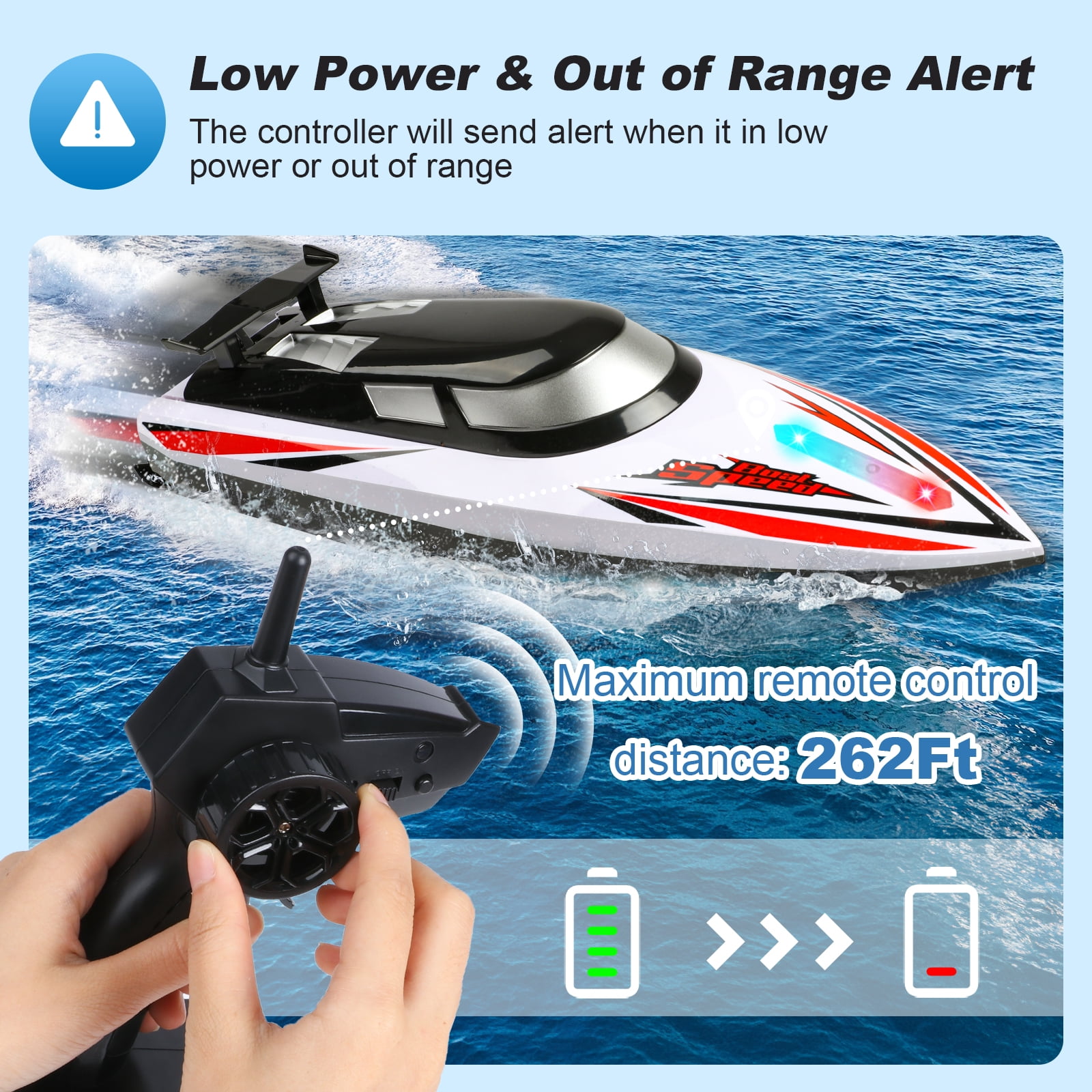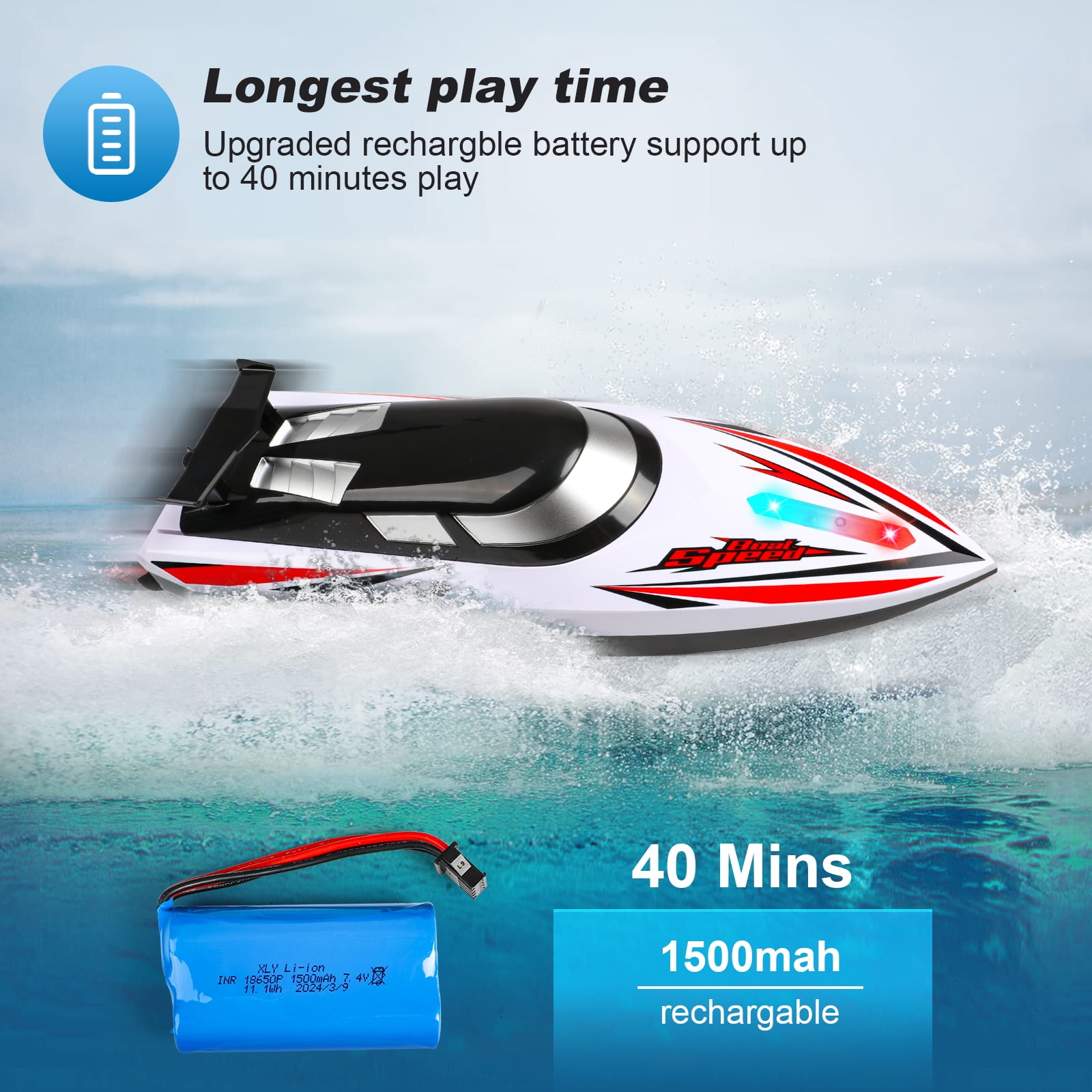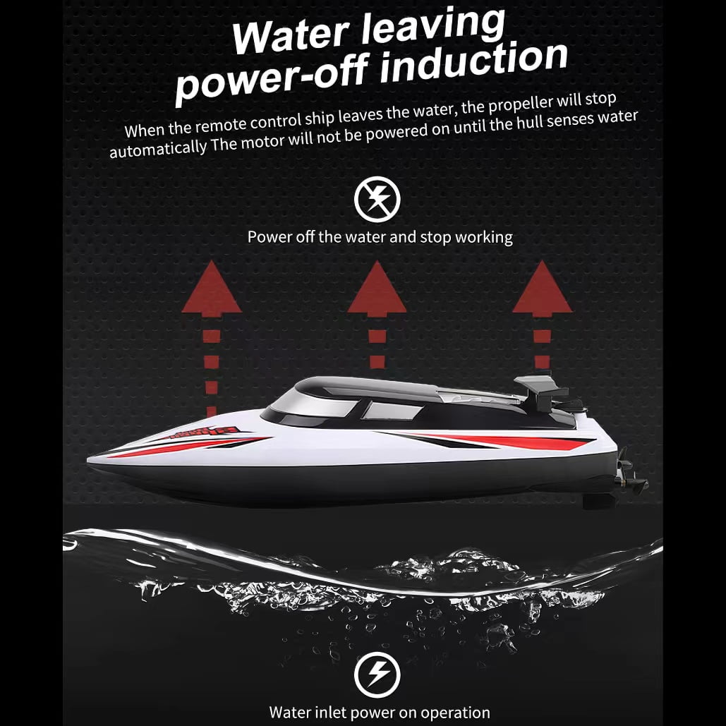 HIGH SPEED REMOTE CONTROL BOAT The High speed RC Boat 20km/h is a motor toy boat that offers exhilarating speeds, perfect for kids and adults seeking an adrenaline rush. With a 2.4GHz remote controller, enjoy precise control up to a 120-meter range, making it ideal for high-speed races on a variety of water bodies. RC BOAT WITH COLORFUL LED LIGHTS With bright and colorful LED lights underneath the transparent cover,this remote control boat for kids and adults is more unique and attracting. The sufficient lighting not only bring more funny experience, but also facilitate night racing. You could identify the heading direction easily. Let the bright colors fly in the waves! WATER SENSOR REMOTE CONTROL BOAT With water sensor switch design, the RC boats will turn on the LED lights automatically and start the engine only after it touches the water(You can also turn off the lights on the remote control). Children will not be harmed when they play with the racing boat. Enjoy the fun boat at ease! Experience Fast Speed & Fun High-speed remote control boat can achieve a speed of 20+ km/h easily with the powerful motor. Get rid of boredom and experience the speed and control on the water. A superb water RC boat for kids and adults in hot summer. Perfect Water Toy Gifts for Boys & Girls Whether in an indoor swimming pool or an outdoor lake, this RC boat toy will bring a great fun to children. Outdoor Water Toys are popular children’s gifts for birthday, Halloween, Christmas, New Year, etc. Spend a memorable childhood with your kids.